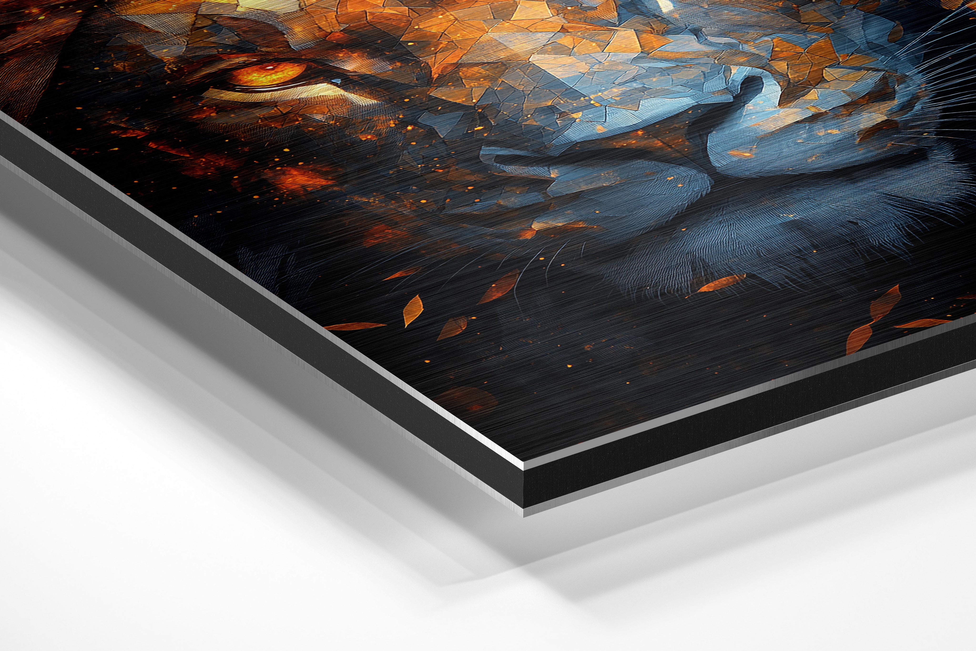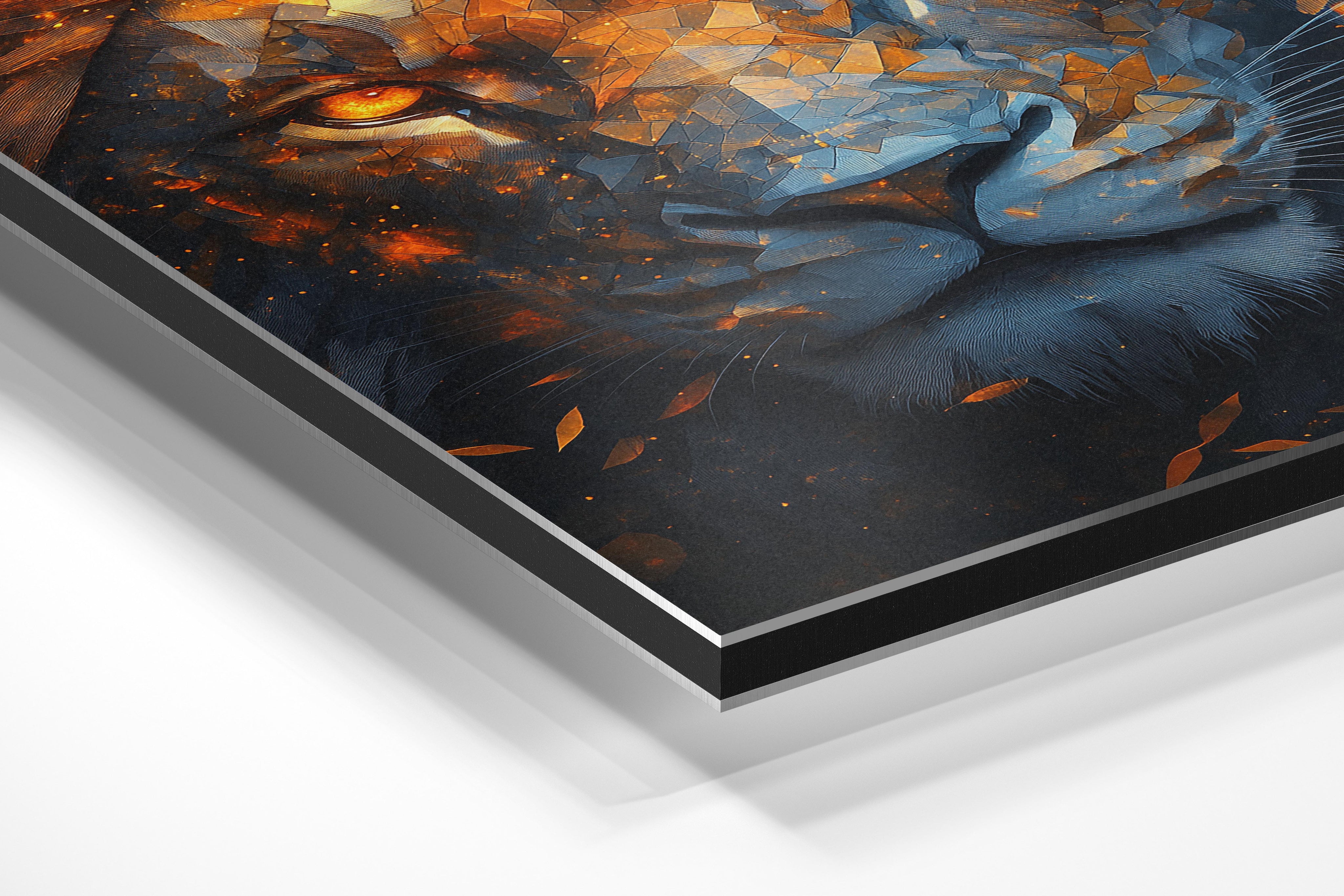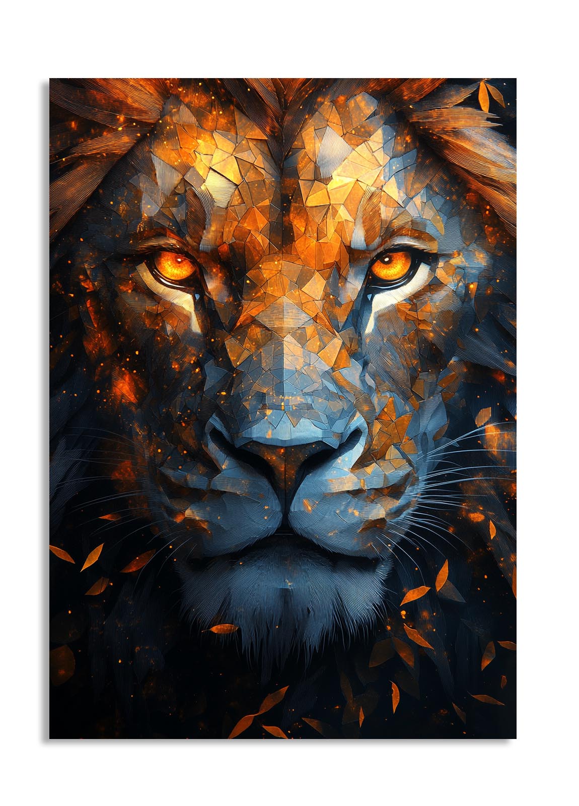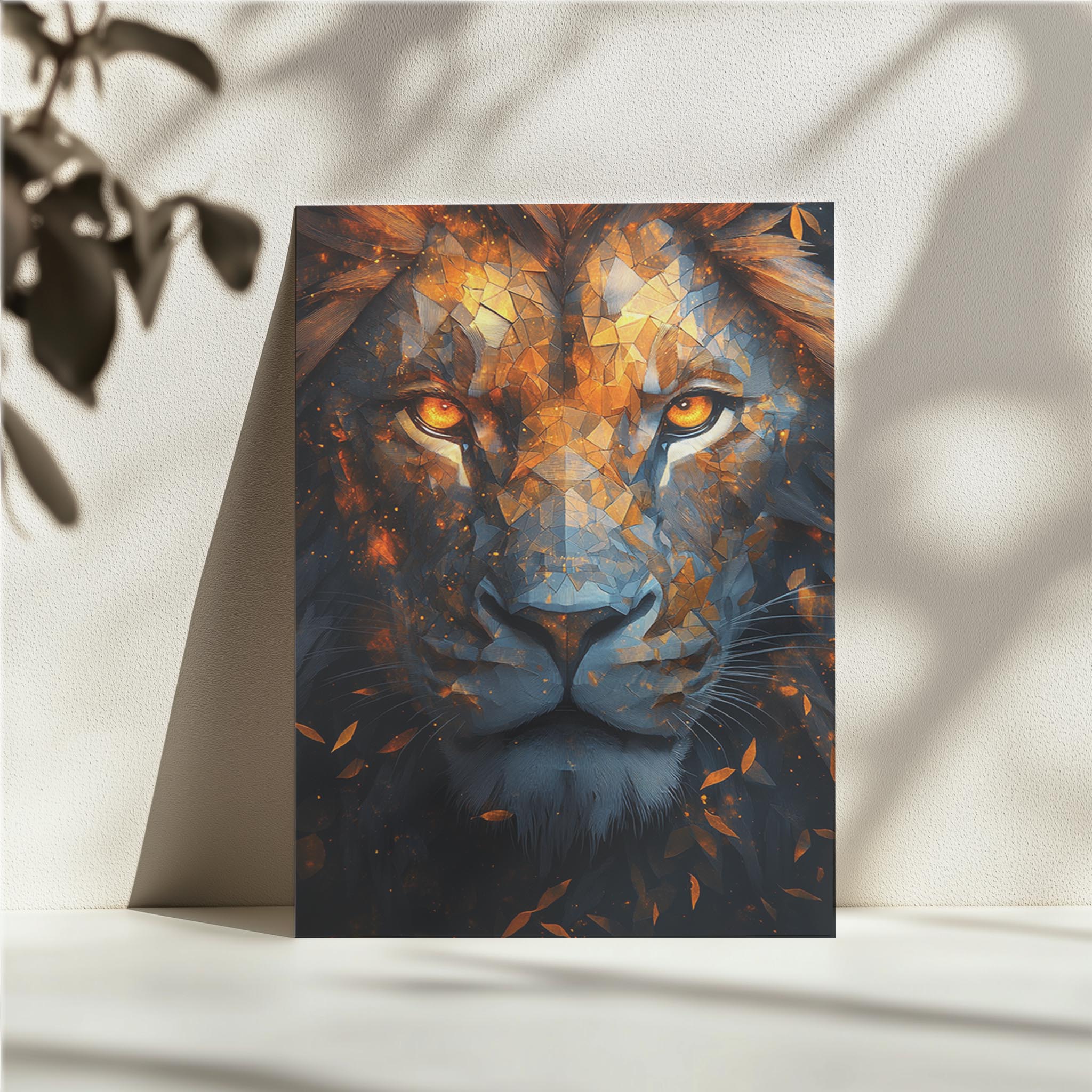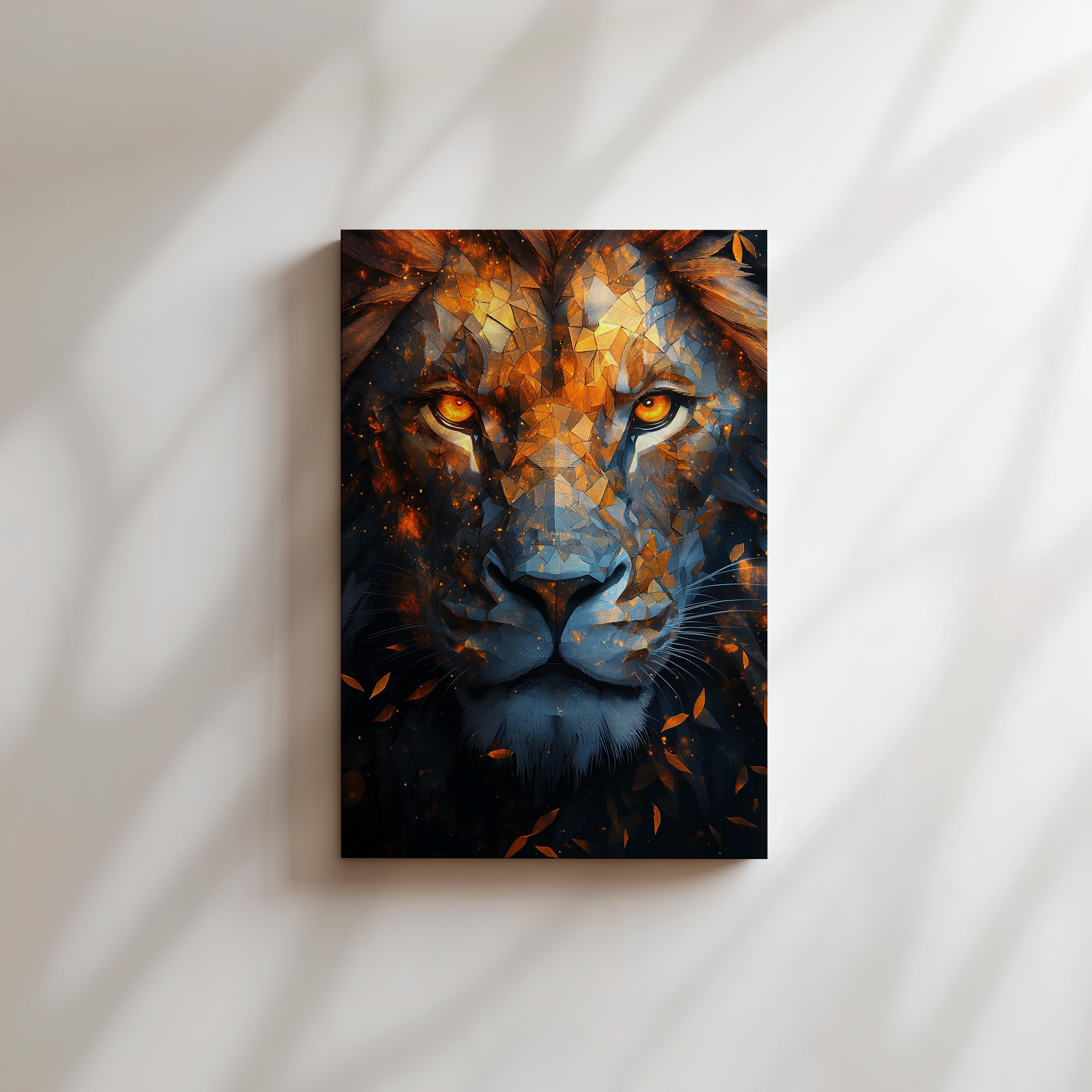 This electrifying geometric lion portrait uses fragmented, golden-orange shards to create a sense of power and intensity. The glowing embers and deep shadows add depth to the image, making it appear as though the lion is emerging from flames. This striking piece would be ideal for individuals who appreciate strength, resilience, and artistic abstraction. Perfect for bold interior spaces, modern offices, or as a centerpiece in a dynamic living area.