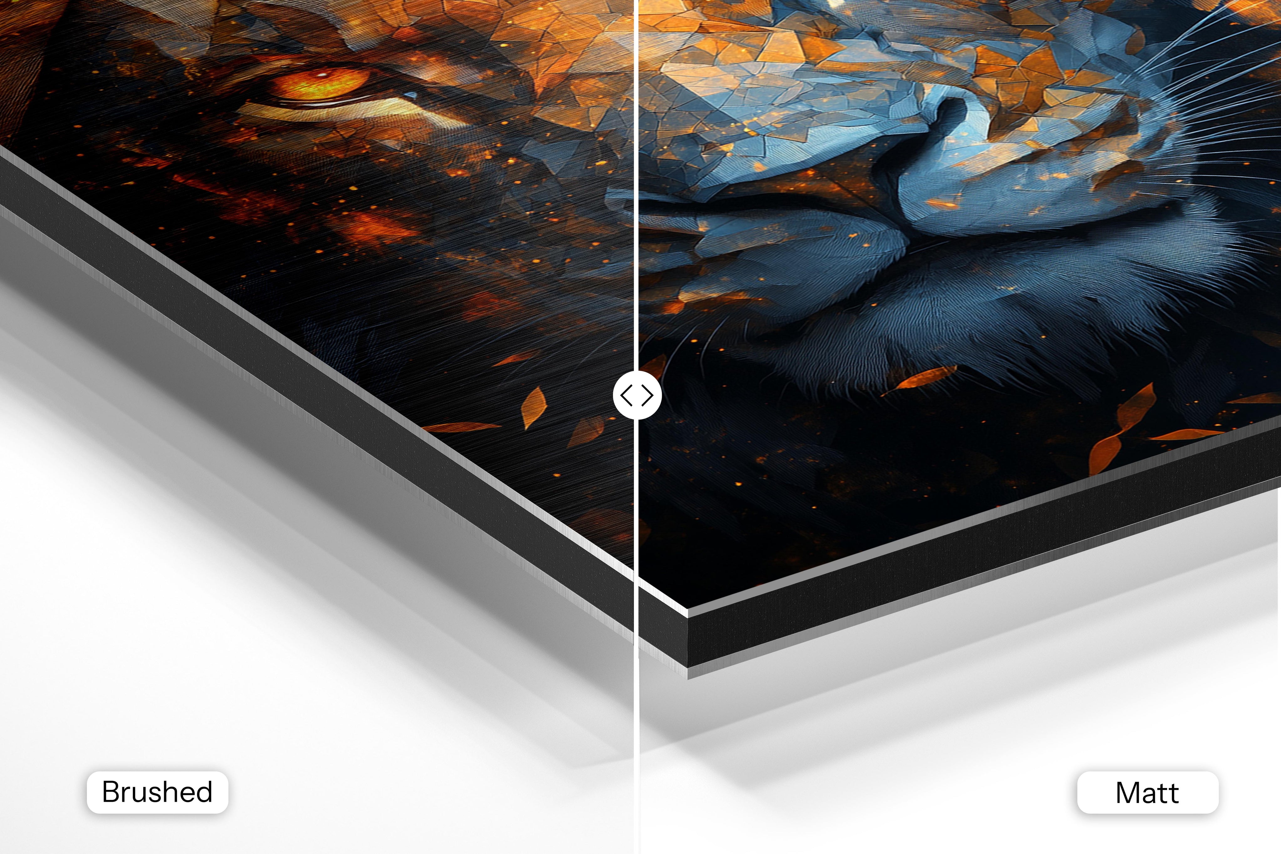 - Brushed Aluminum, on the other hand, features a raw metallic texture with visible brush strokes. Whites and highlights in your image let the silver surface show through, adding a dramatic, shimmering effect. Ideal for black-and-white images, minimalist designs, or abstract art, it creates a bold, industrial vibe with a modern edge.
