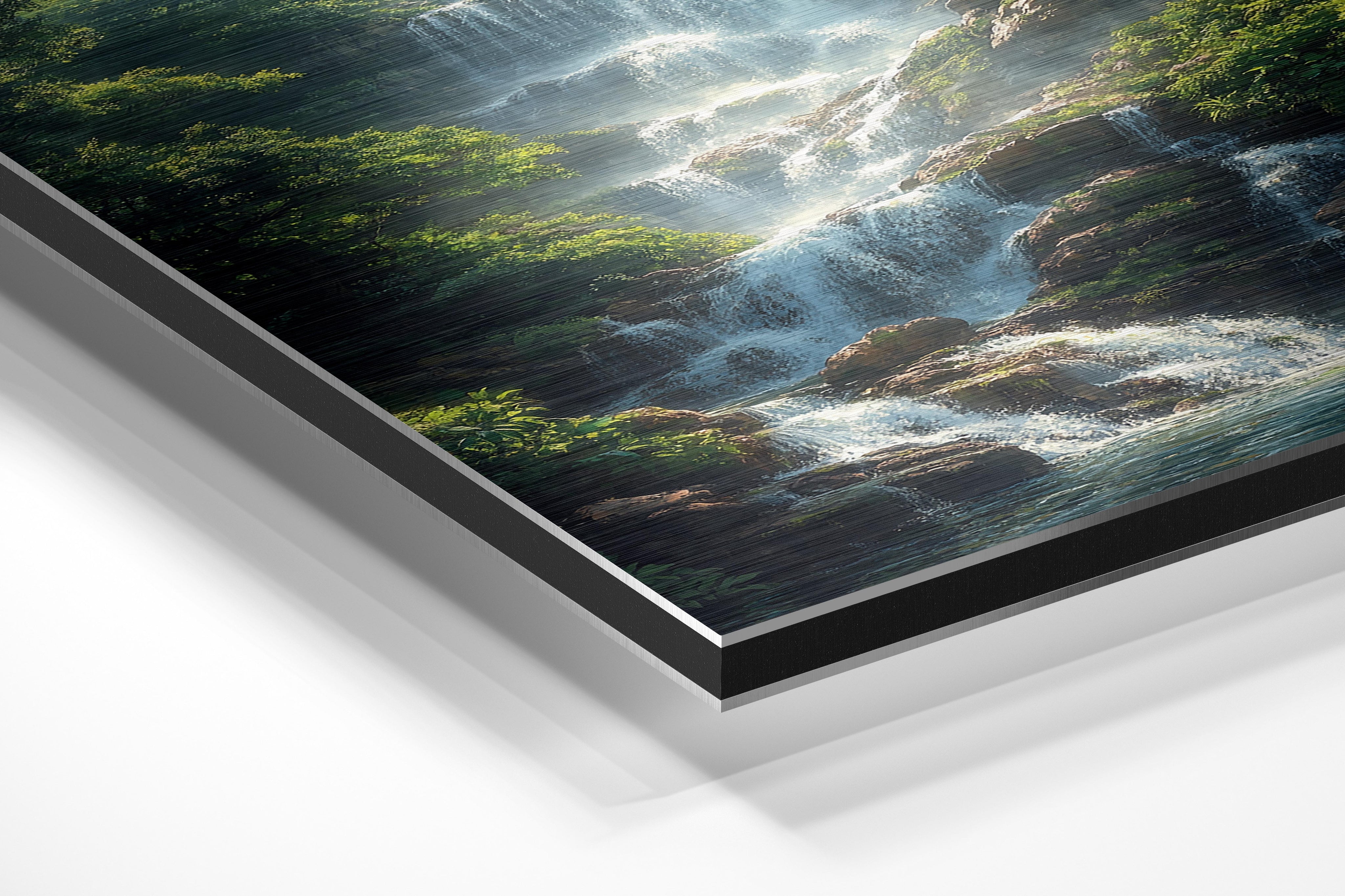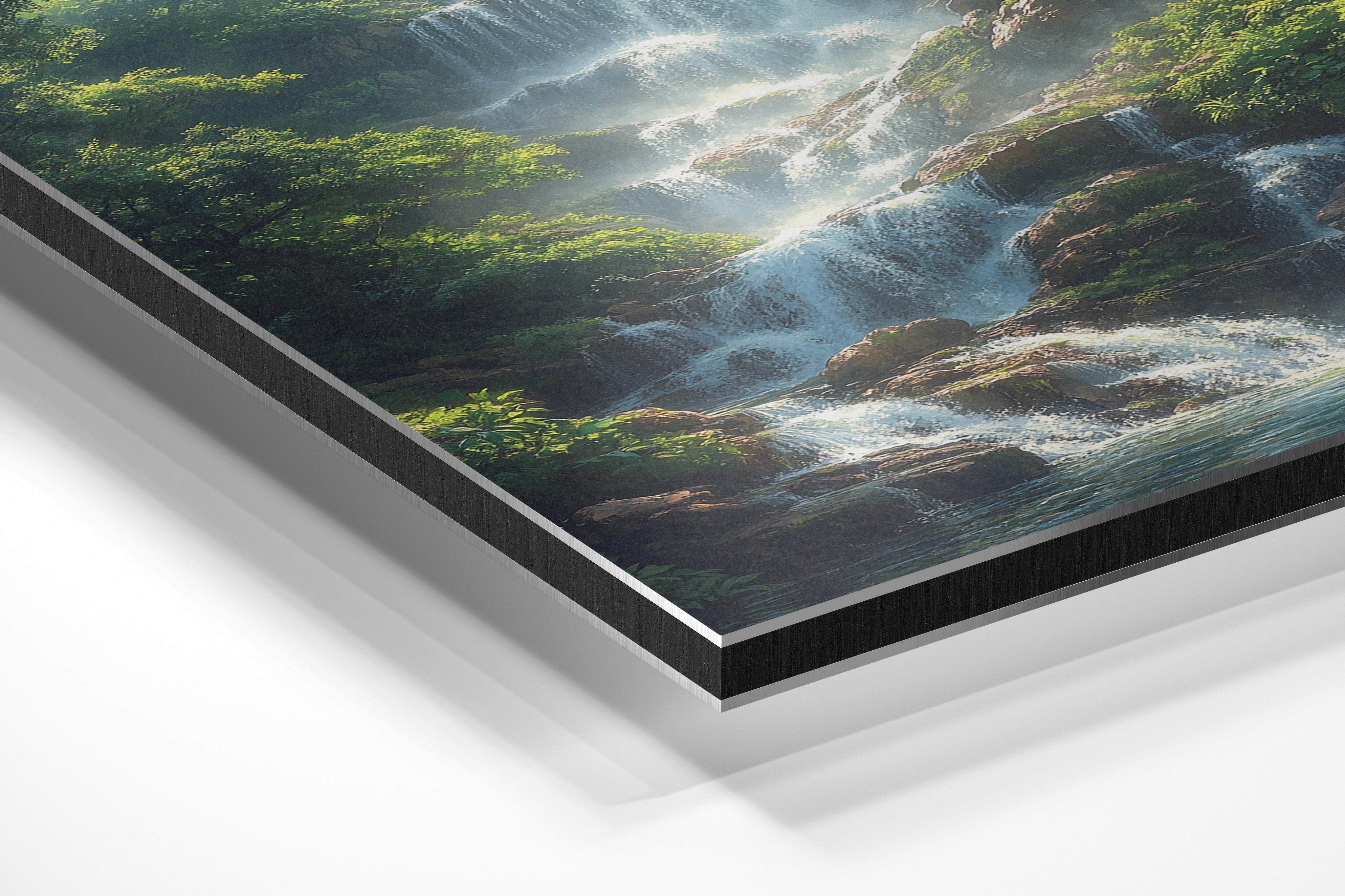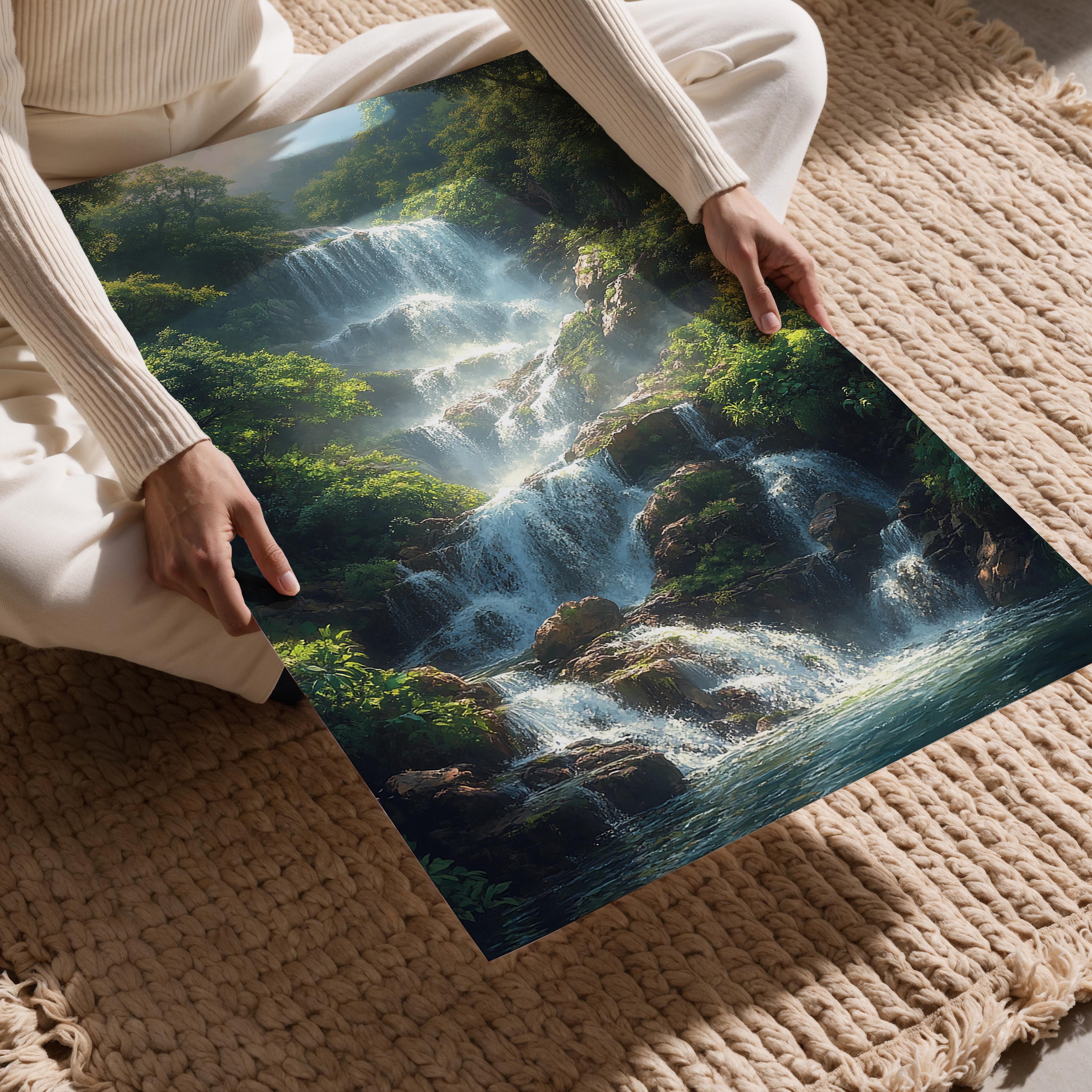 This lush cascading waterfall nestled in a verdant landscape is a testament to nature's endless beauty. The gentle cascades of water flowing over moss-covered rocks create a soothing, rhythmic visual. Ideal for creating a calming ambiance, this artwork evokes a sense of serenity and connection to the outdoors. Perfect for decor that promotes relaxation and appreciation of nature's wonders.