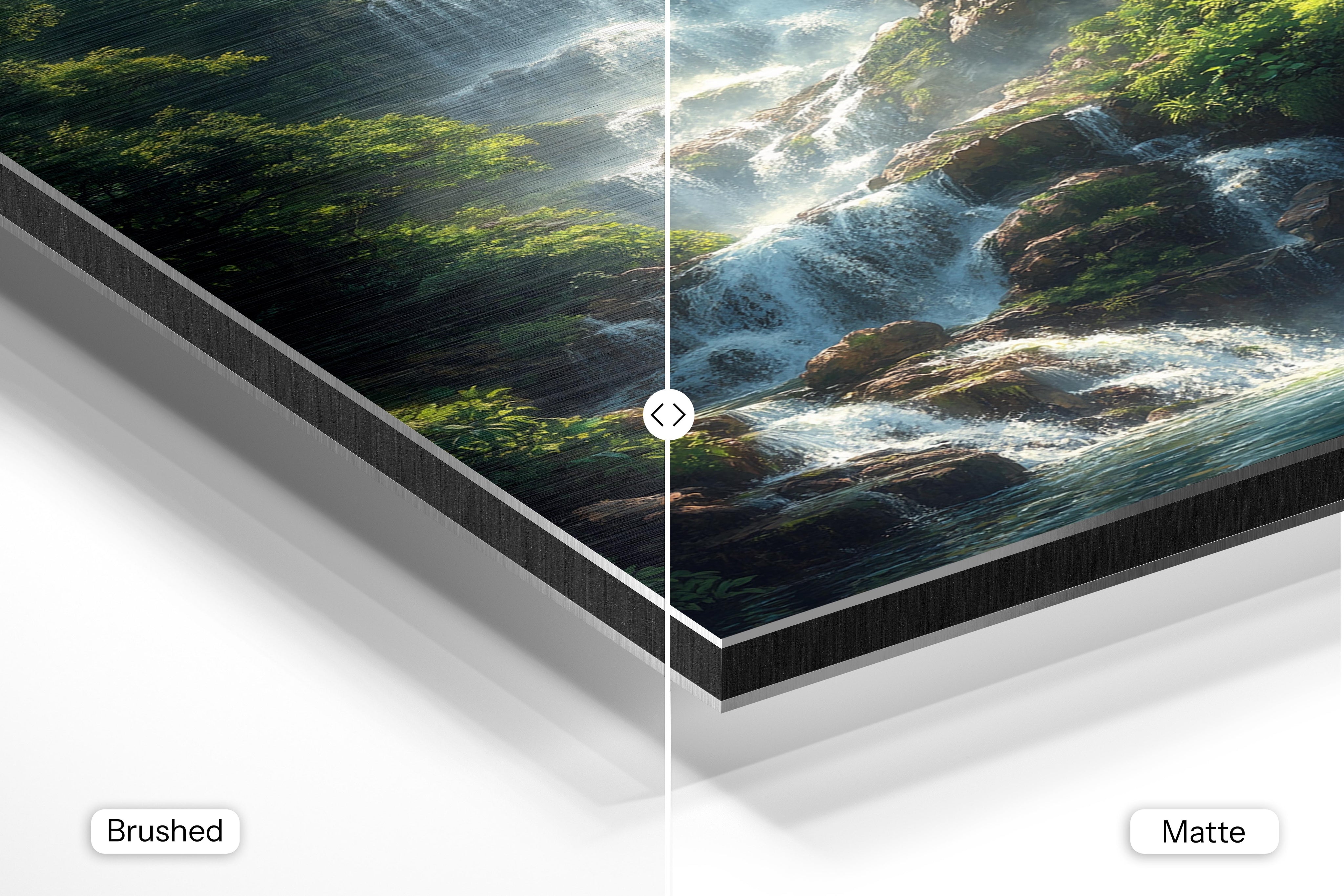- Brushed Aluminum, on the other hand, features a raw metallic texture with visible brush strokes. Whites and highlights in your image let the silver surface show through, adding a dramatic, shimmering effect. Ideal for black-and-white images, minimalist designs, or abstract art, it creates a bold, industrial vibe with a modern edge.