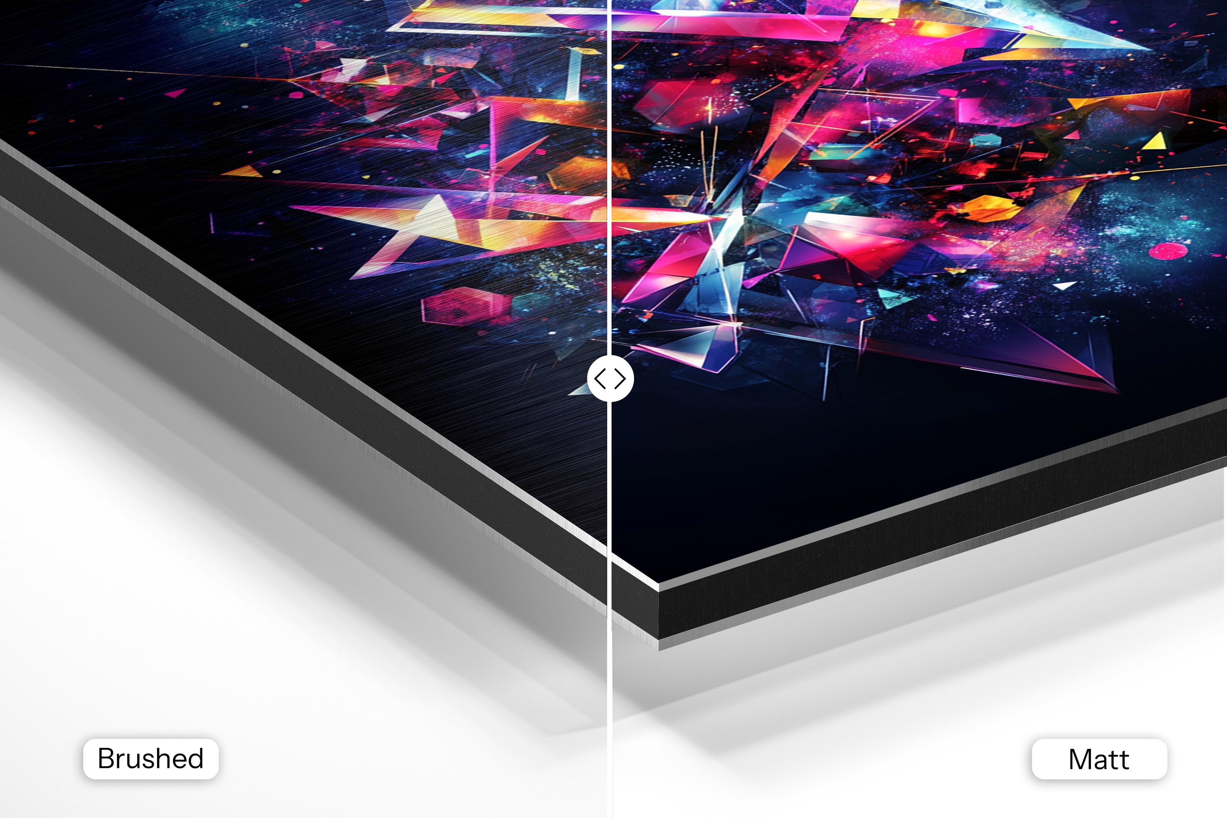 - Brushed Aluminum, on the other hand, features a raw metallic texture with visible brush strokes. Whites and highlights in your image let the silver surface show through, adding a dramatic, shimmering effect. Ideal for black-and-white images, minimalist designs, or abstract art, it creates a bold, industrial vibe with a modern edge.