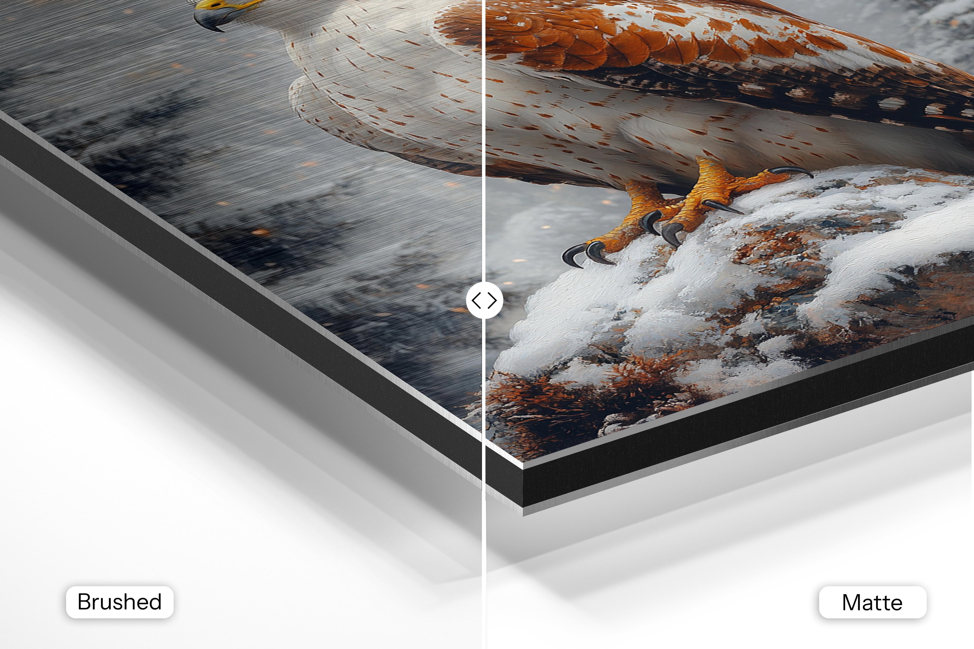 - Brushed Aluminum, on the other hand, features a raw metallic texture with visible brush strokes. Whites and highlights in your image let the silver surface show through, adding a dramatic, shimmering effect. Ideal for black-and-white images, minimalist designs, or abstract art, it creates a bold, industrial vibe with a modern edge.