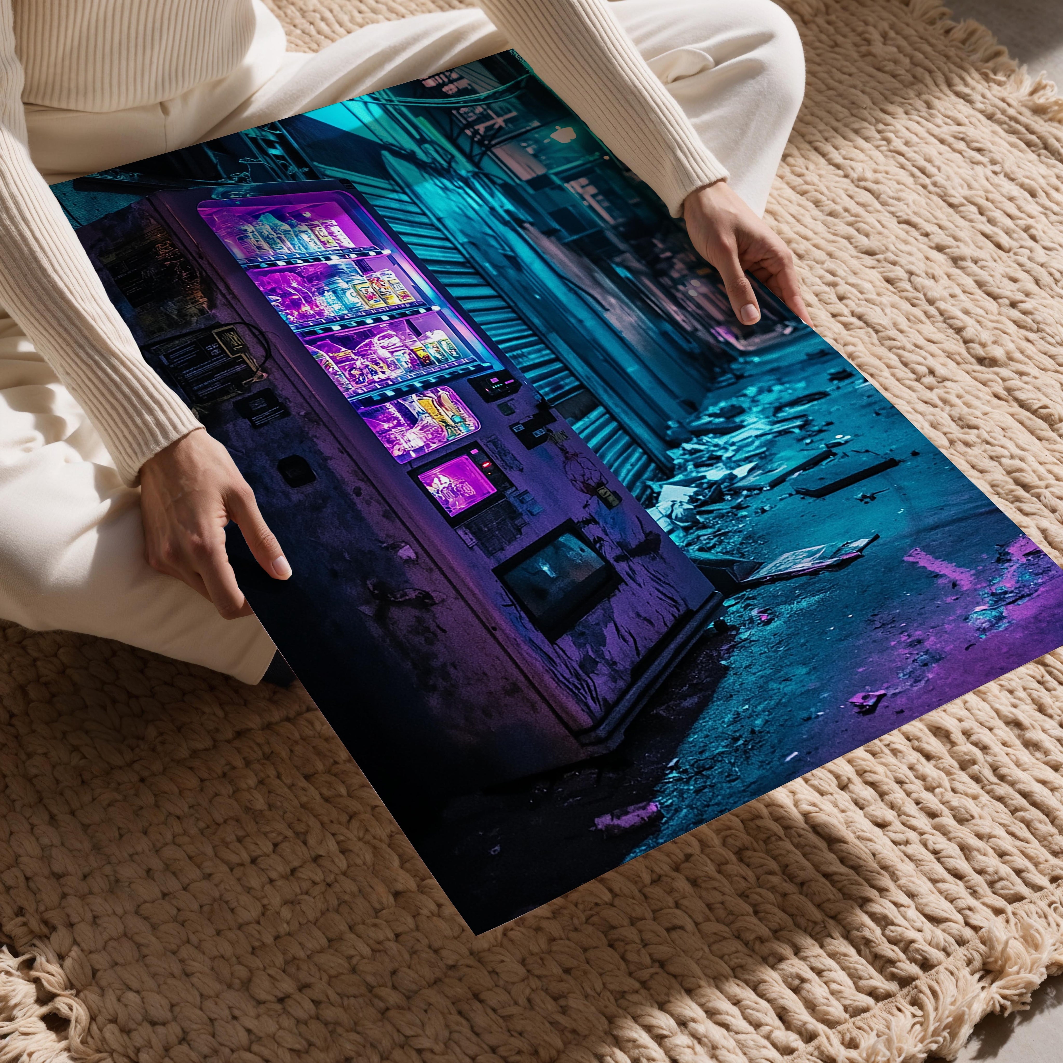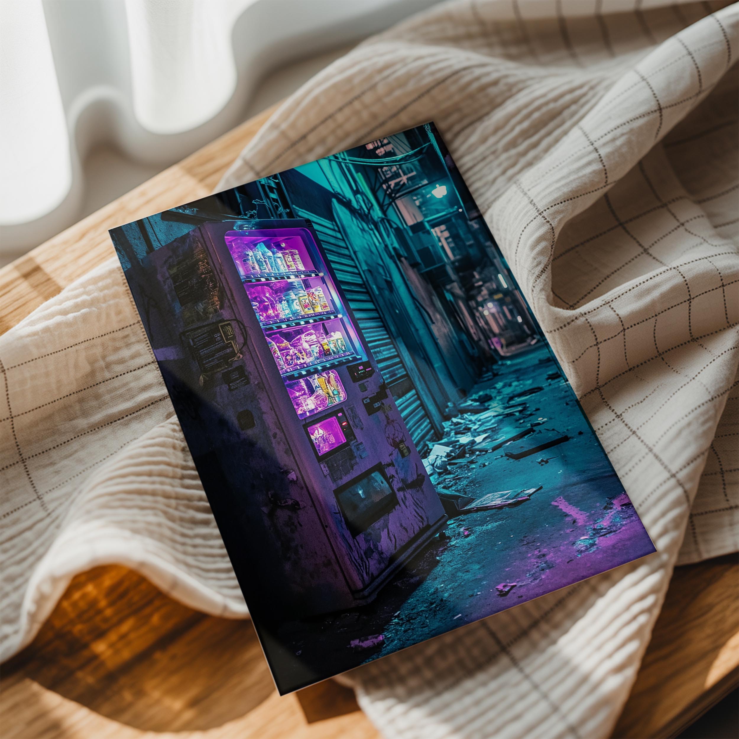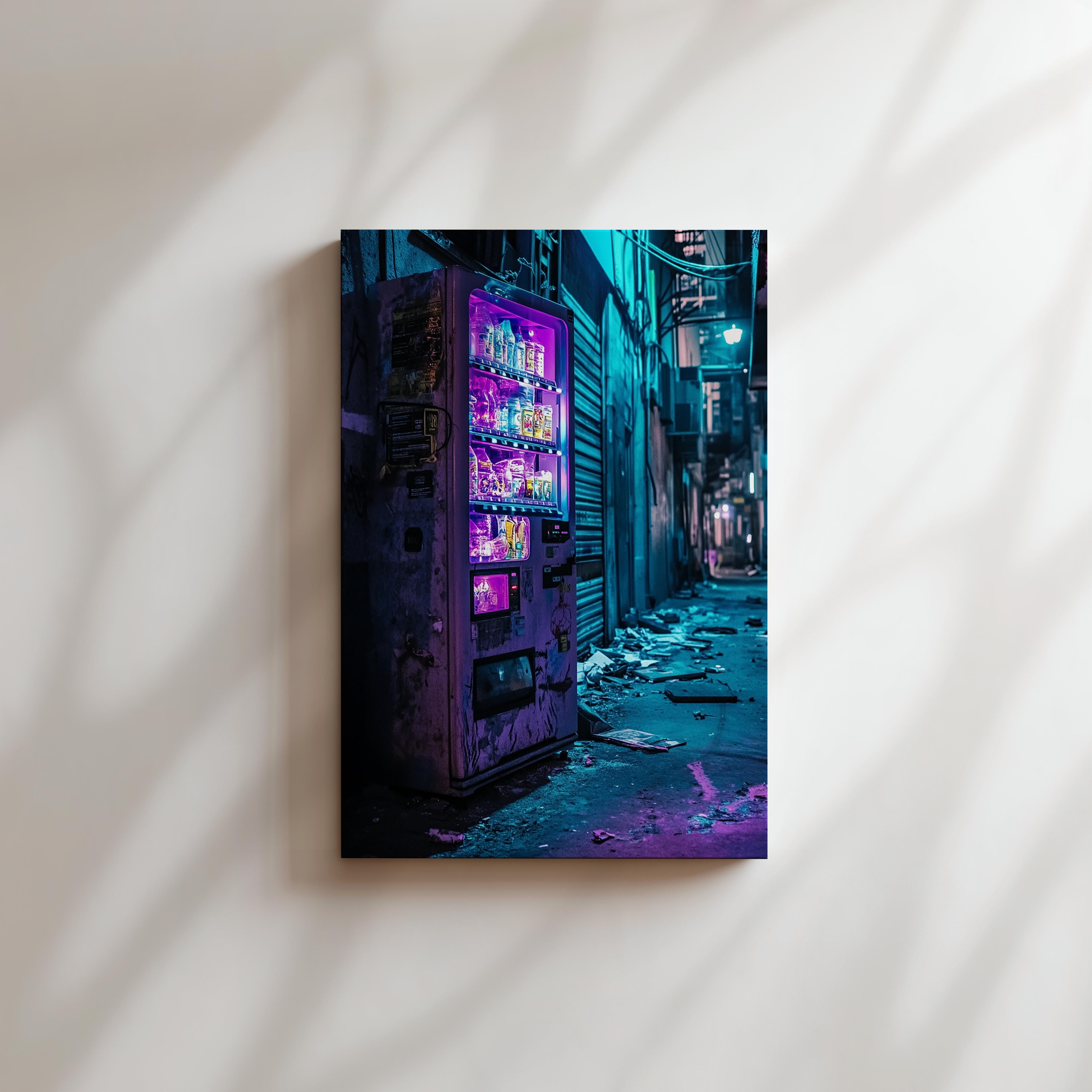 A gritty alley scene featuring an abandoned vending machine glowing faintly in the darkness. The juxtaposition of decay and faint neon lighting creates a narrative of forgotten urban spaces. The muted tones and subtle glow make it a thought-provoking piece for industrial or urban-style spaces, perfect for those who enjoy artworks that tell a story of resilience and nostalgia.