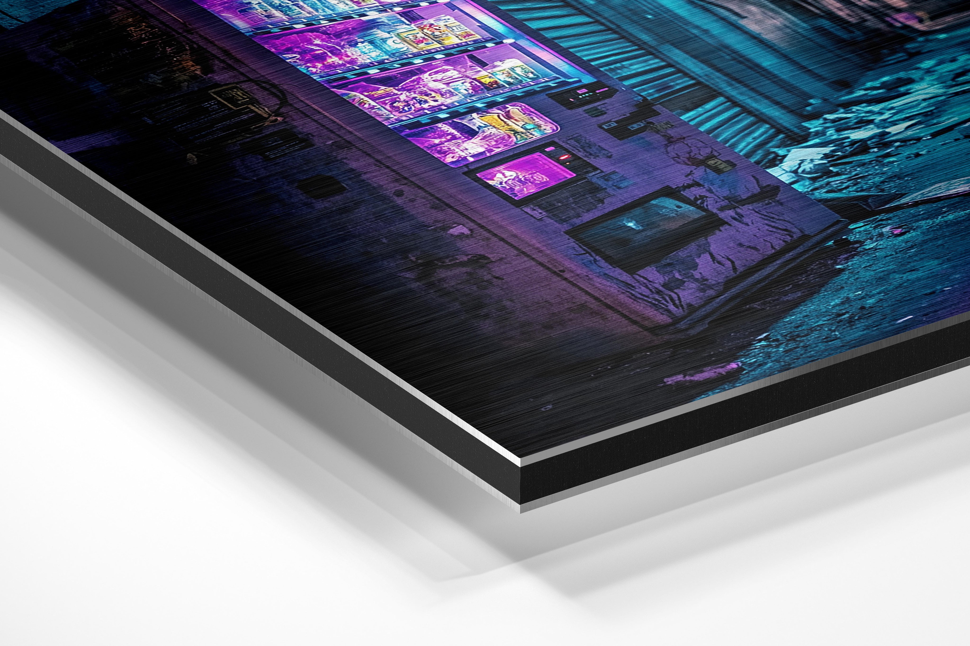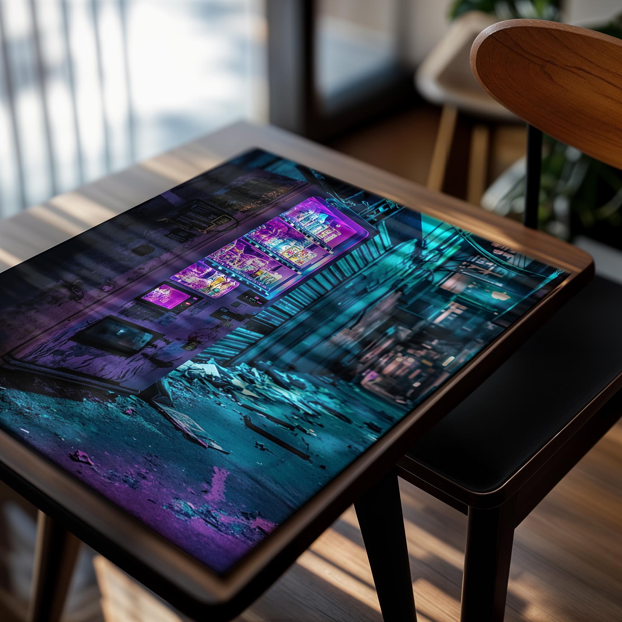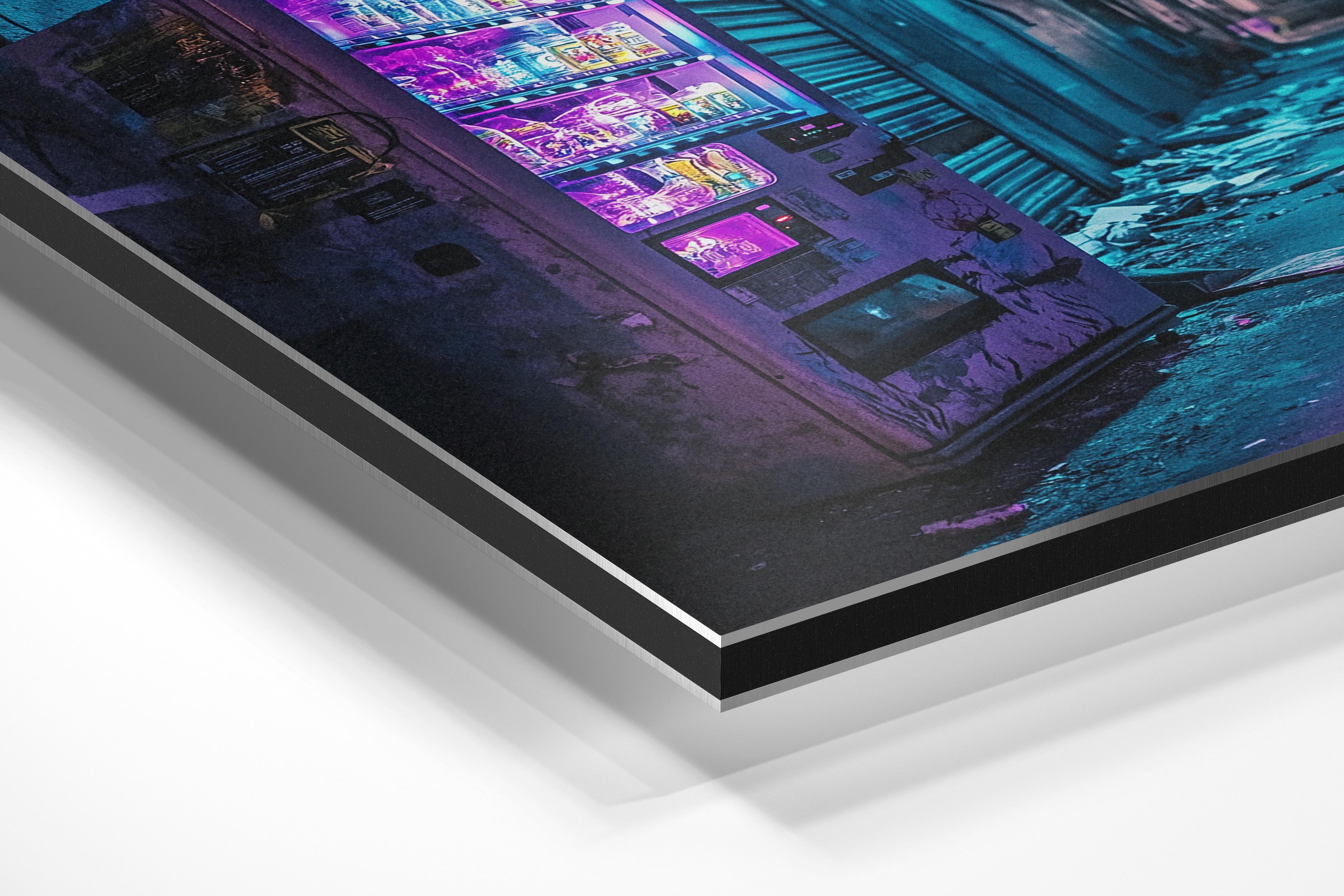 A gritty alley scene featuring an abandoned vending machine glowing faintly in the darkness. The juxtaposition of decay and faint neon lighting creates a narrative of forgotten urban spaces. The muted tones and subtle glow make it a thought-provoking piece for industrial or urban-style spaces, perfect for those who enjoy artworks that tell a story of resilience and nostalgia.