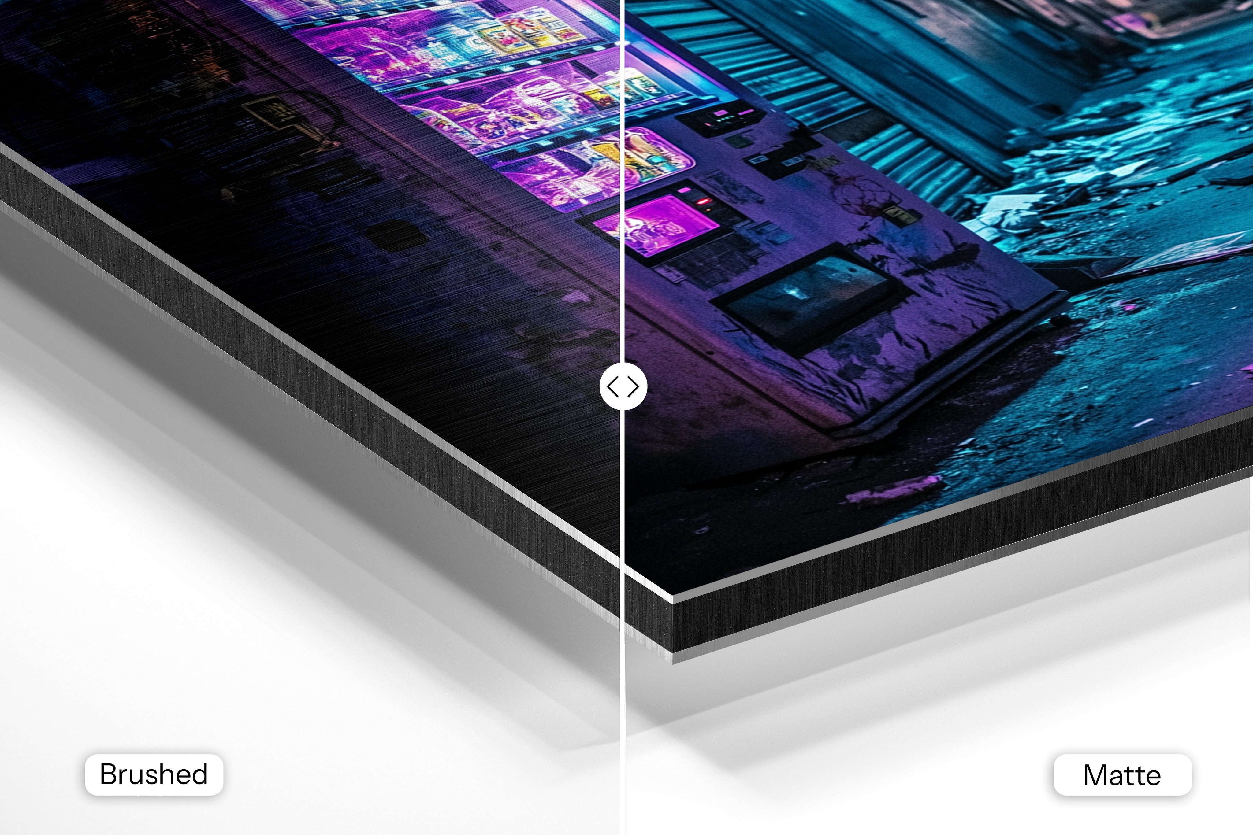 - Brushed Aluminum, on the other hand, features a raw metallic texture with visible brush strokes. Whites and highlights in your image let the silver surface show through, adding a dramatic, shimmering effect. Ideal for black-and-white images, minimalist designs, or abstract art, it creates a bold, industrial vibe with a modern edge.