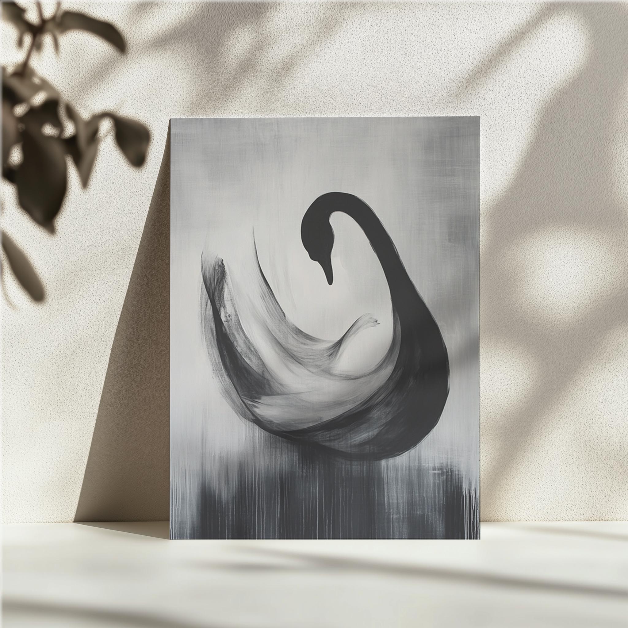 A dynamic and expressive abstract painting of a black swan, captured in flowing, almost ethereal brushstrokes. The monochromatic color scheme enhances its elegance, while the soft, blurred strokes give a sense of motion, almost as if the swan is dissolving into the background. This sophisticated piece would fit beautifully in modern interiors, particularly in spaces that value bold statement artwork, such as living rooms, hotel lobbies, or offices.