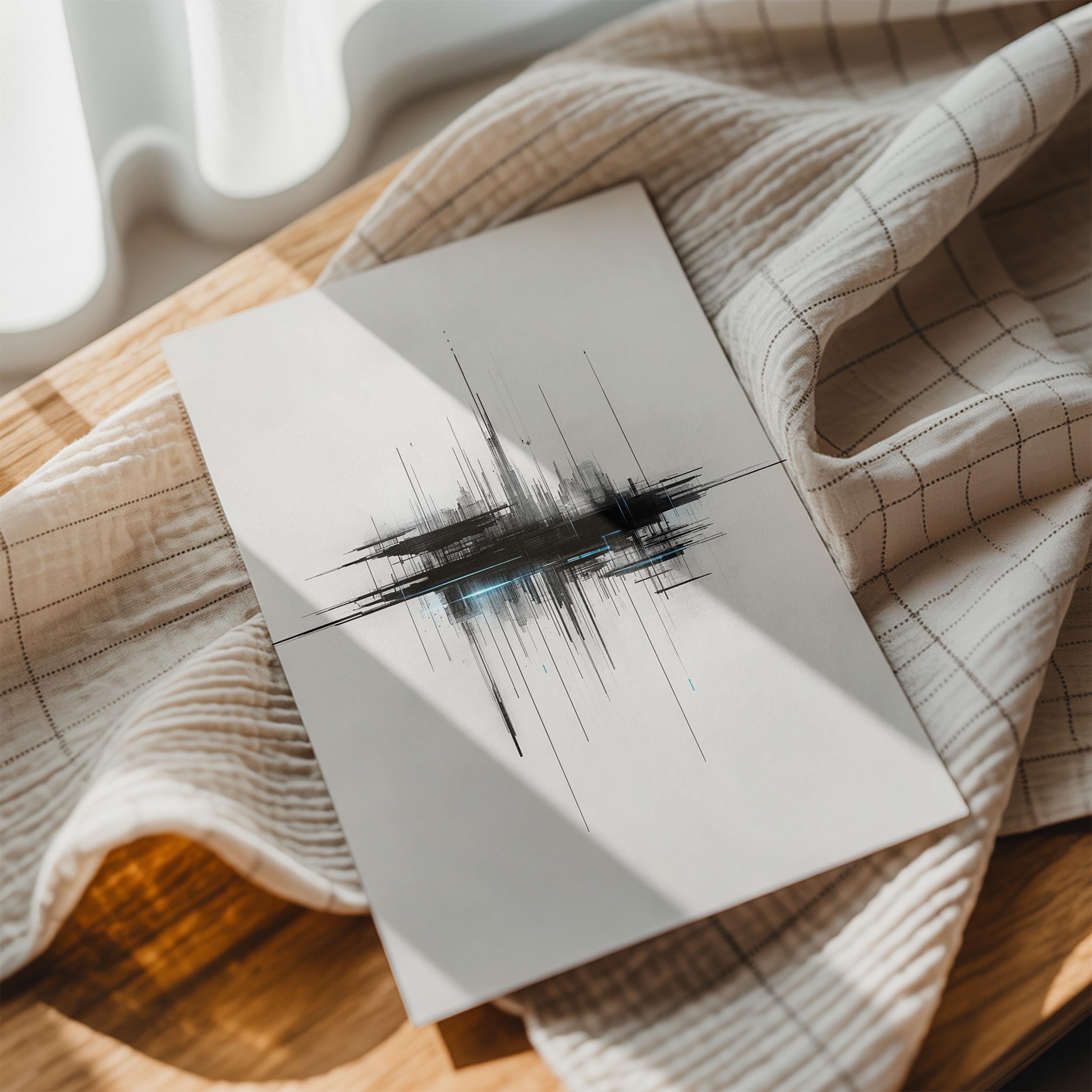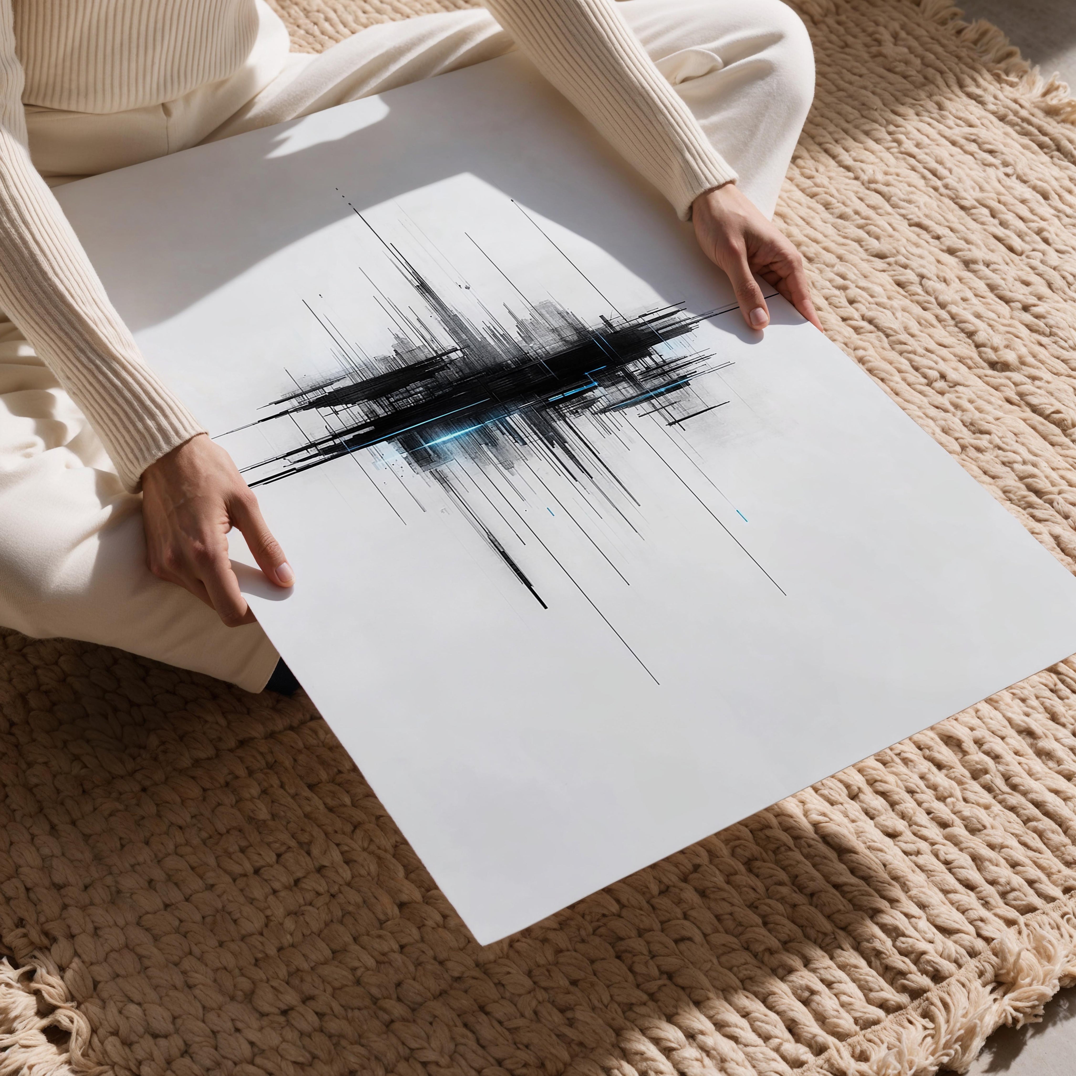A minimalist and abstract cityscape with sharp lines and glowing highlights, evoking a futuristic urban ambiance. The artwork’s clean design and intricate details make it ideal for modern or minimalist interiors. Its monochromatic palette adds sophistication, while the futuristic elements inspire conversations about urban innovation. This piece works perfectly in offices, studios, or living spaces with contemporary decor, offering a sleek and forward-thinking focal point.