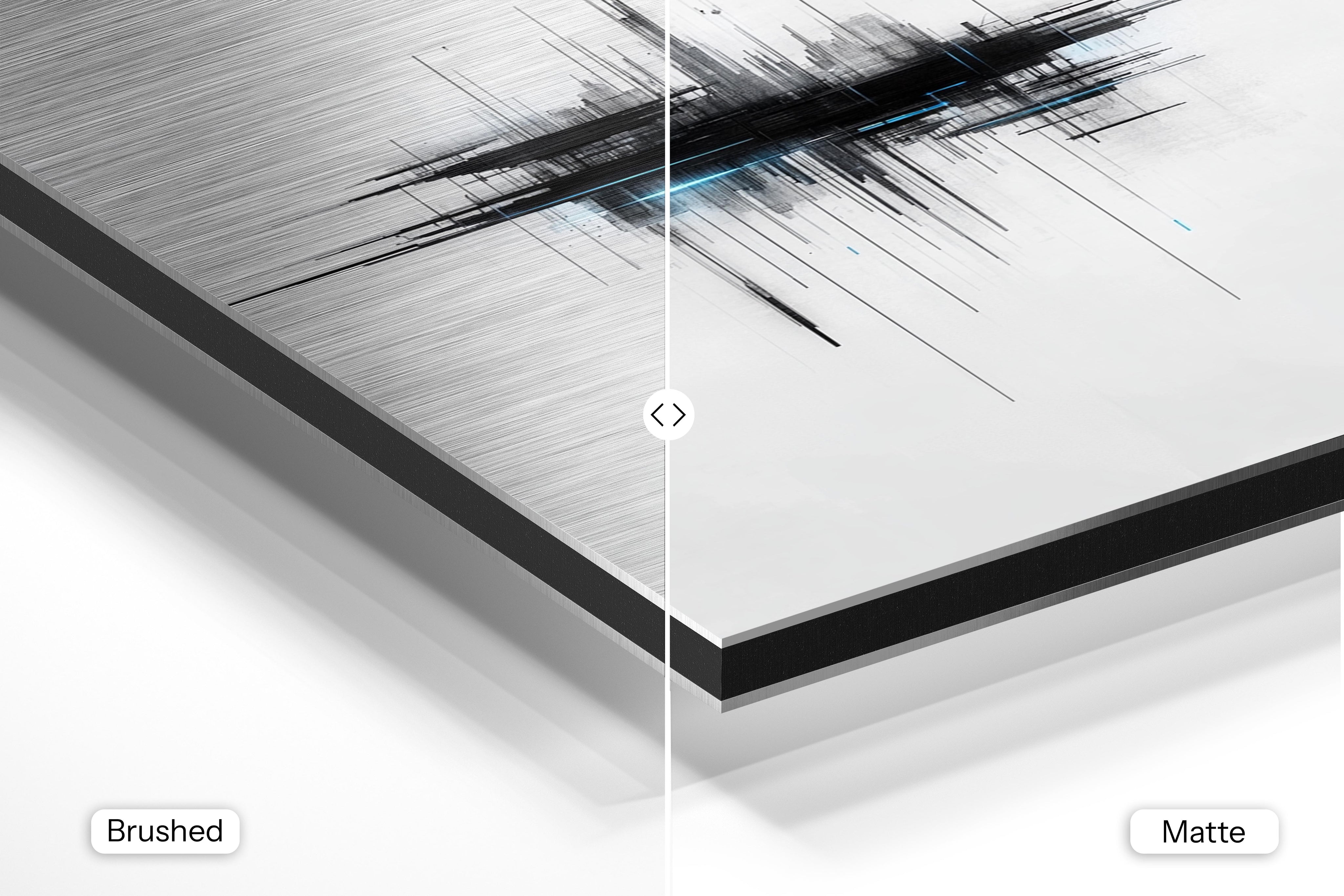 - Brushed Aluminum, on the other hand, features a raw metallic texture with visible brush strokes. Whites and highlights in your image let the silver surface show through, adding a dramatic, shimmering effect. Ideal for black-and-white images, minimalist designs, or abstract art, it creates a bold, industrial vibe with a modern edge.