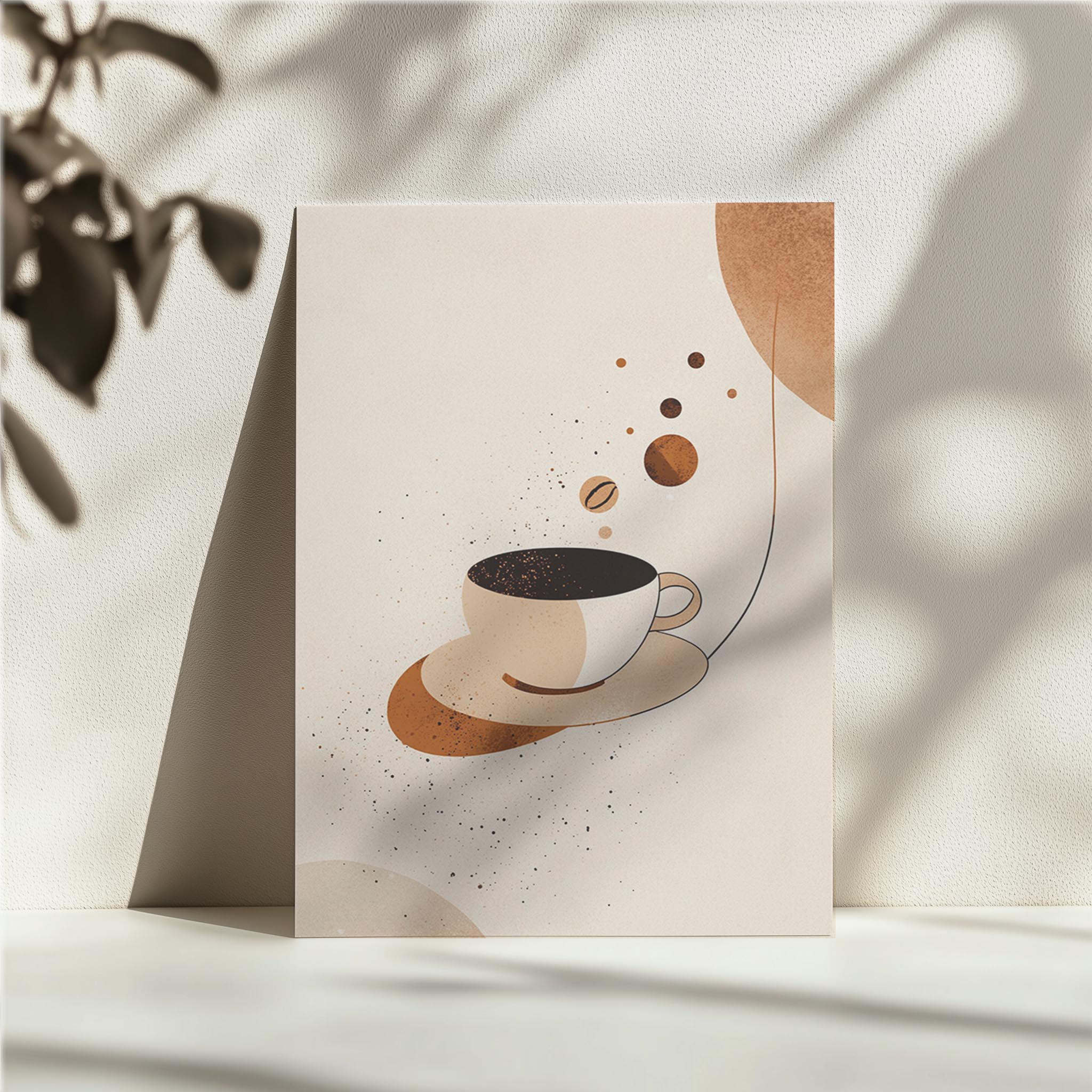 This minimalist and artistic portrayal of a coffee cup showcases elegant swirls and earthy tones, creating an abstract yet recognizable representation. Coffee beans and speckles float whimsically, adding a playful, surreal dimension. The light, neutral background keeps the focus on the design, making it a versatile piece for contemporary interiors, coffee shops, or offices. It appeals to art lovers and coffee connoisseurs alike, offering a modern, creative take on a daily staple. This artwork brings a touch of sophistication while keeping it cozy.