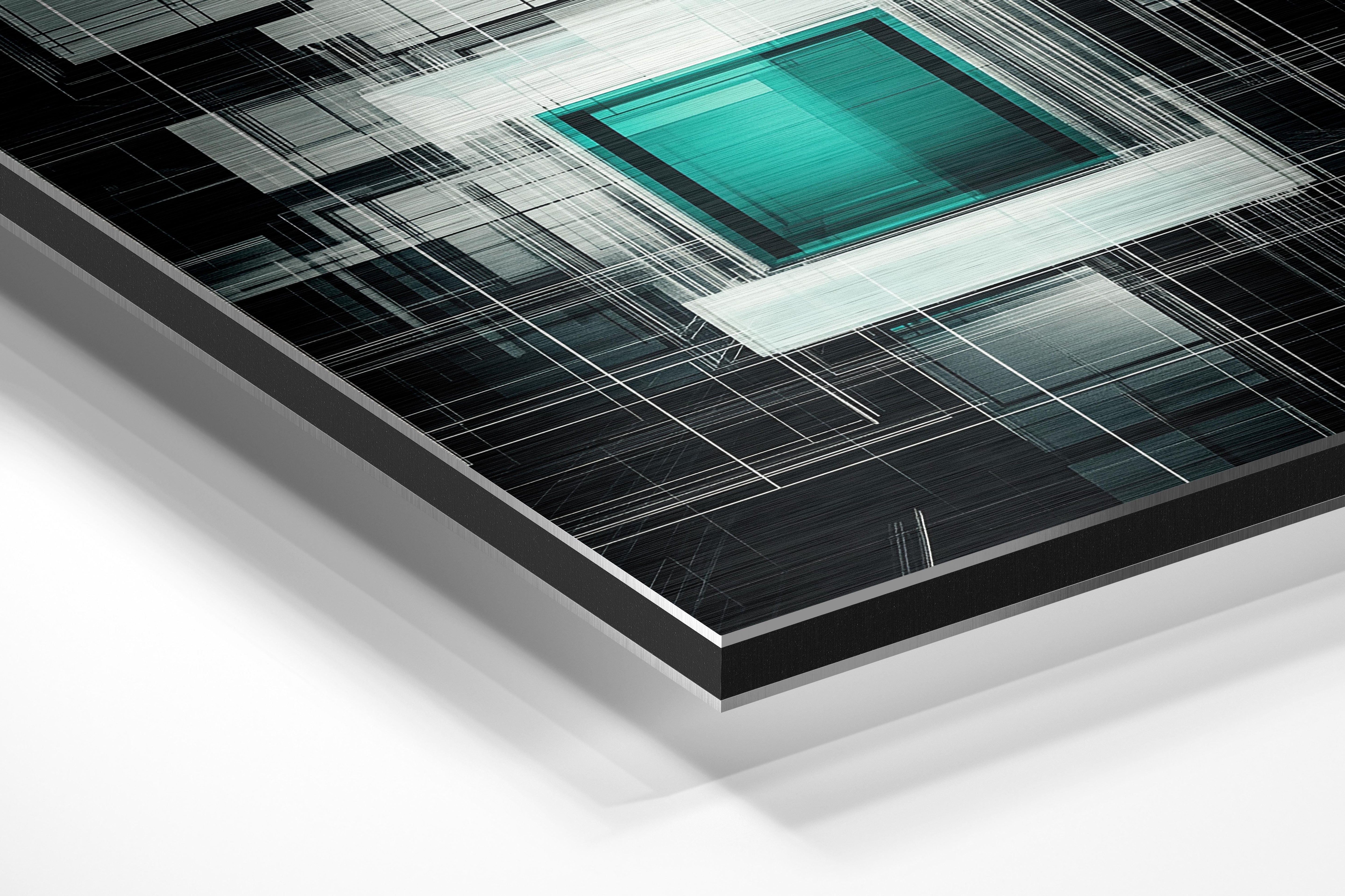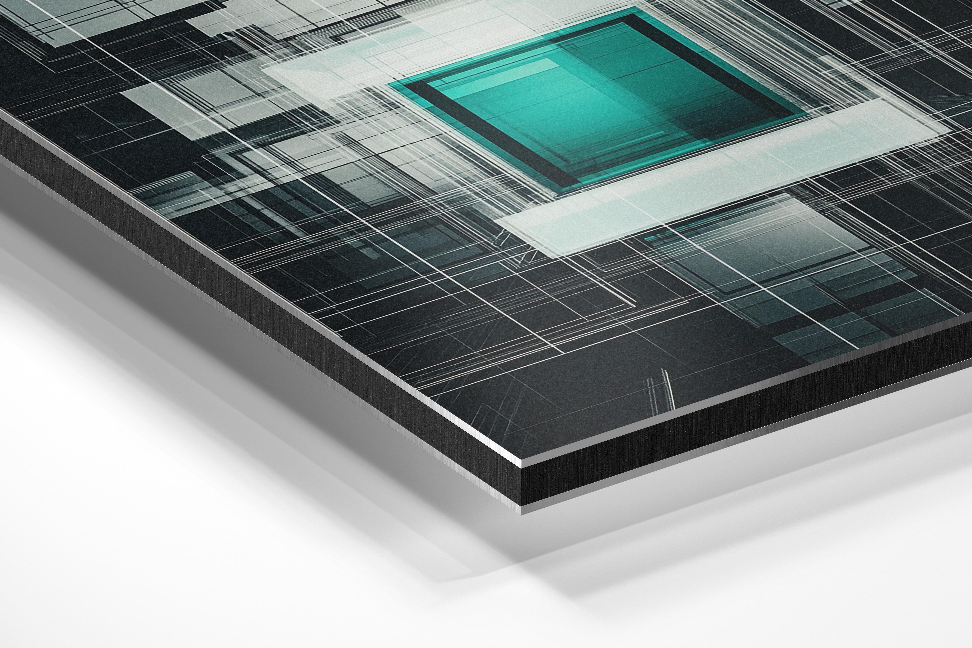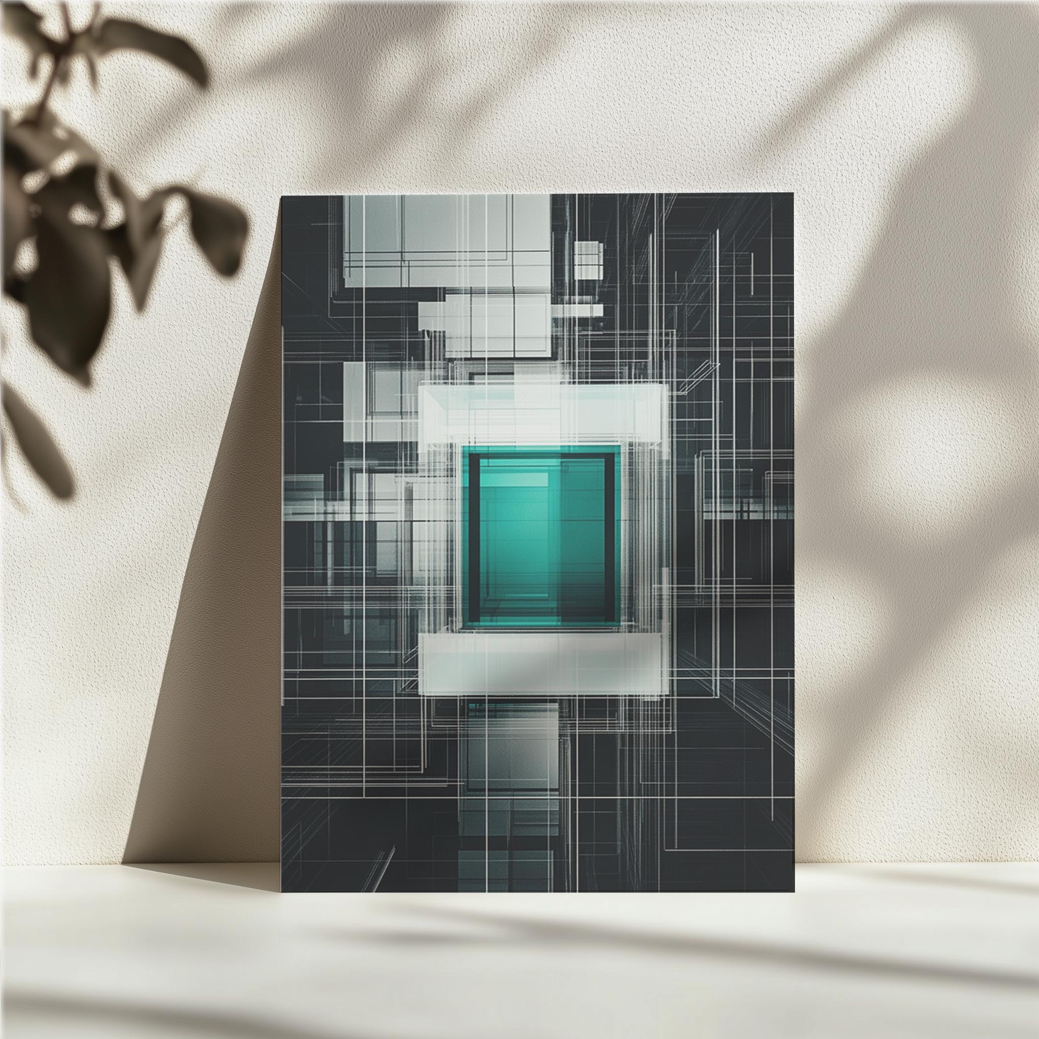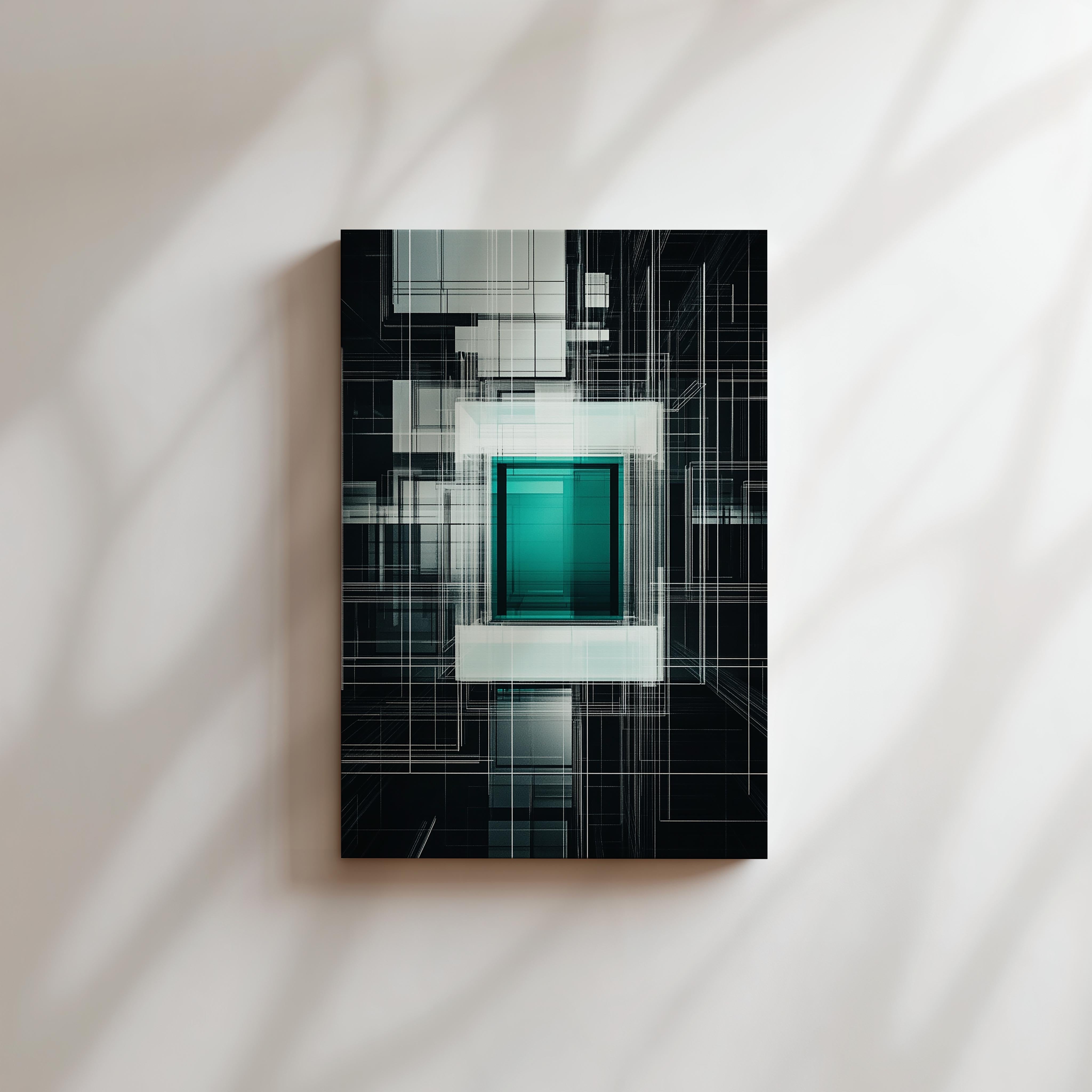 This futuristic piece showcases a cyan cube surrounded by a maze of intricate lines and grids, symbolizing modernity and technological progress. The sharp contrasts between light and shadow emphasize its geometric precision, making it an ideal choice for tech-inspired interiors or contemporary offices. Its clean and minimalist design exudes sophistication, while its vibrant cyan hue adds a splash of energy to any room. Perfect for innovators and creators, this artwork represents the endless possibilities of the digital age.