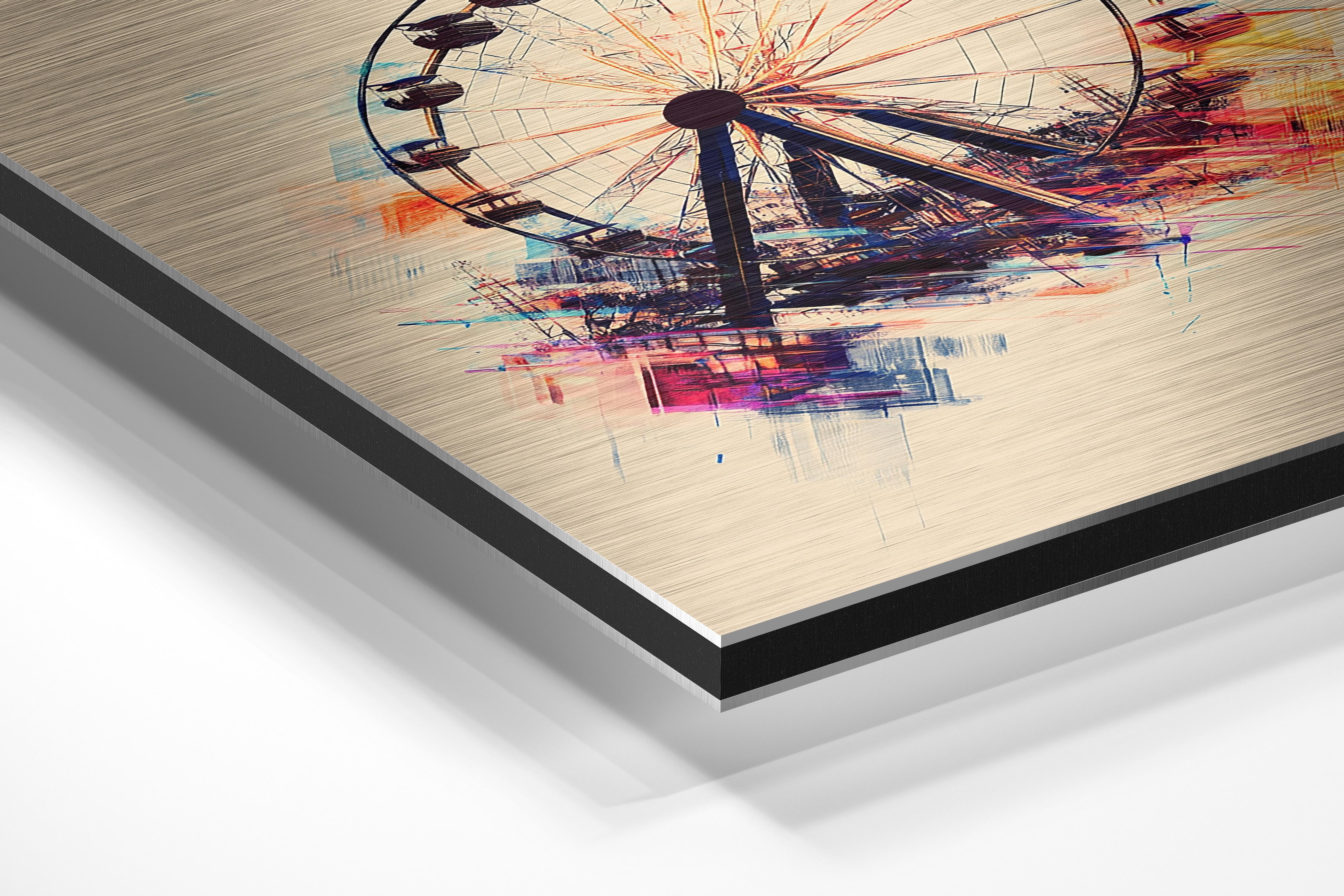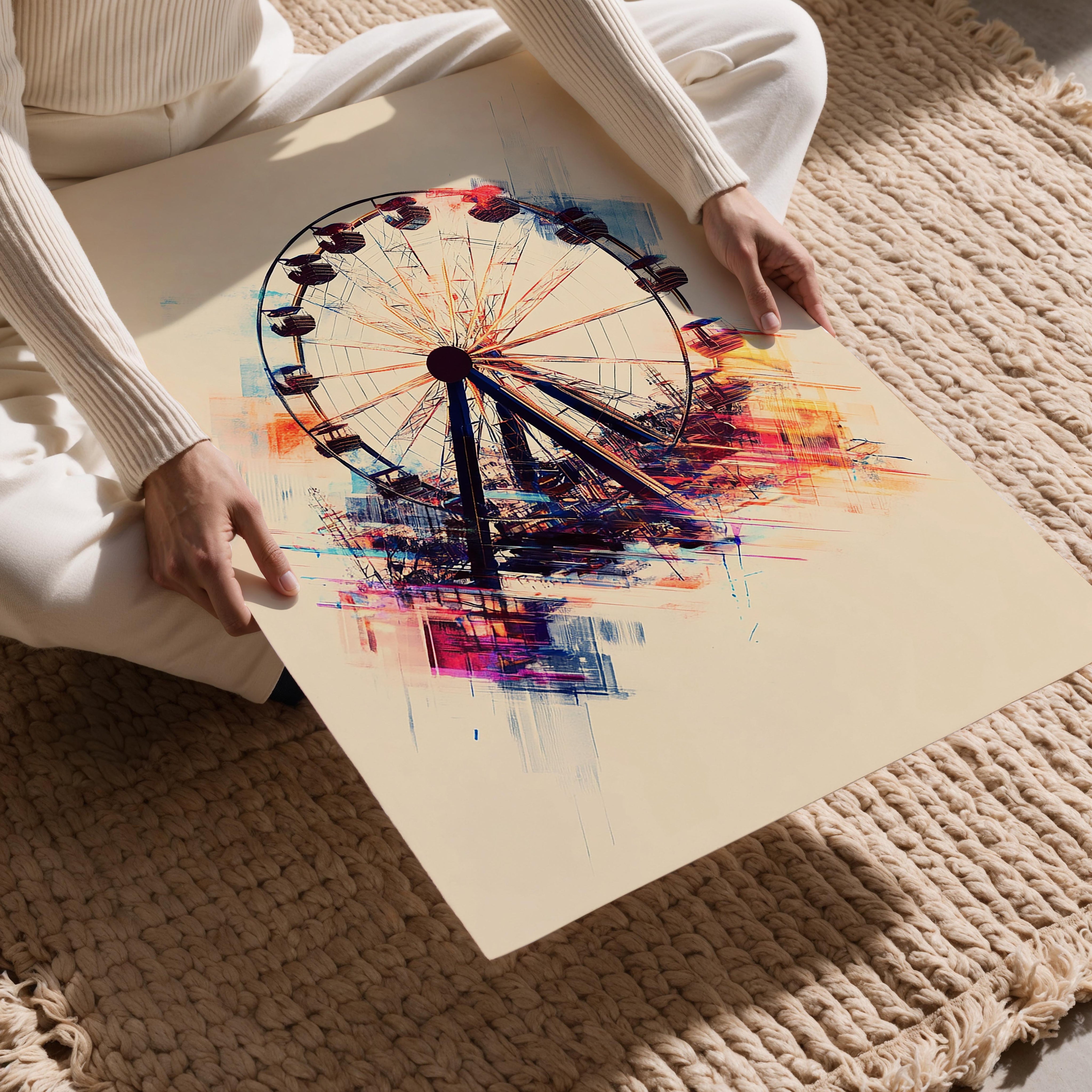 This contemporary artwork offers an abstract take on a Ferris wheel, blending dynamic splashes of color with bold geometric shapes. The energy and motion captured in this image invite creativity and imagination. Perfect for modern interiors, creative studios, or workspaces, its artistic expression resonates with those who appreciate unique and unconventional design. This piece embodies both playfulness and sophistication, making it a versatile addition to any decor.