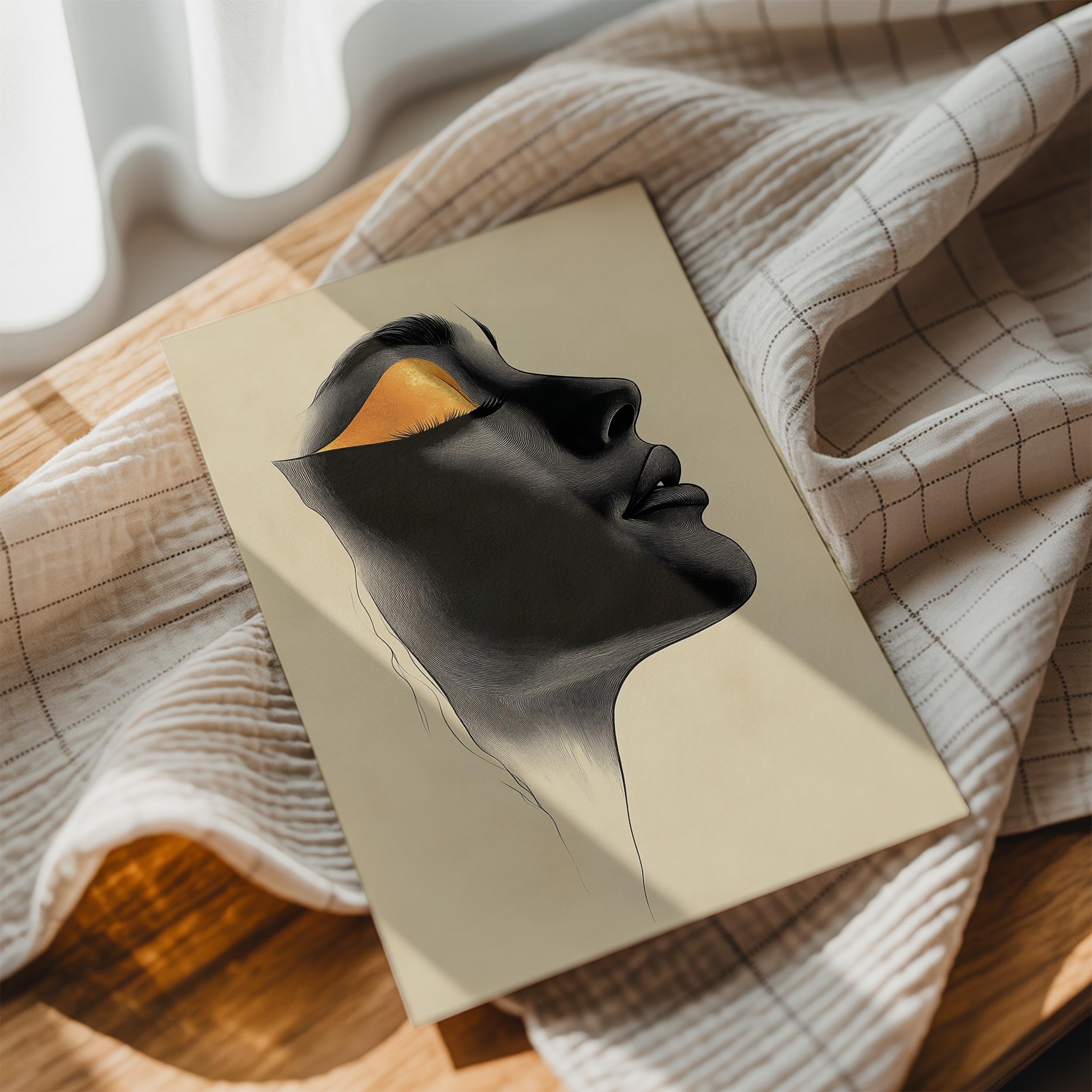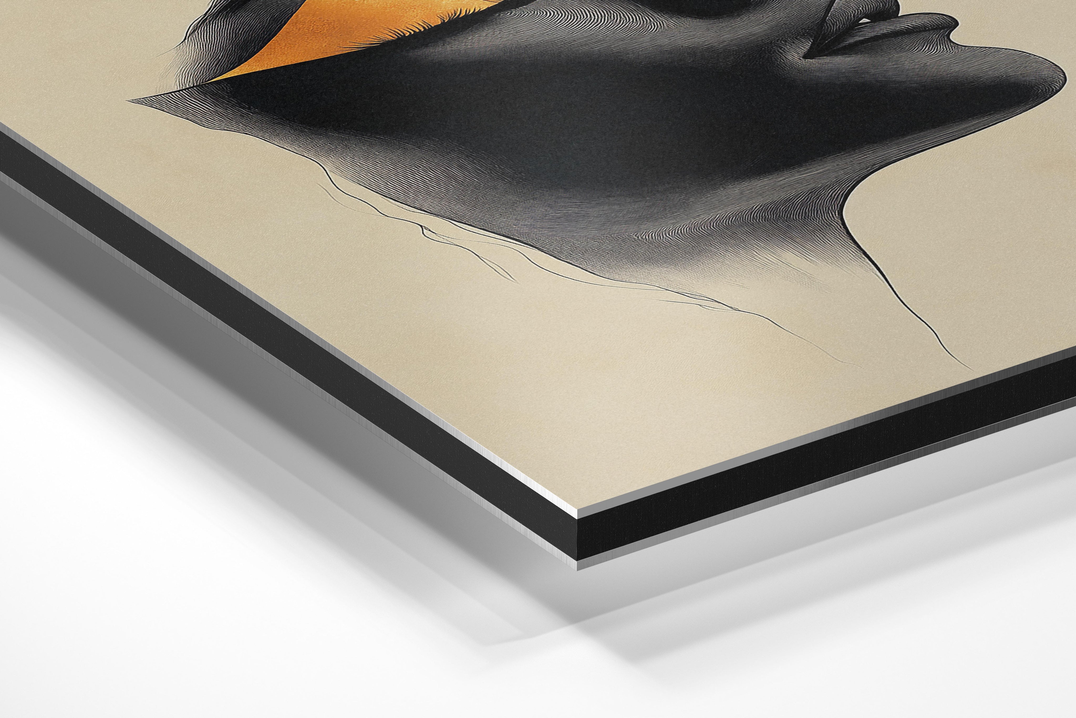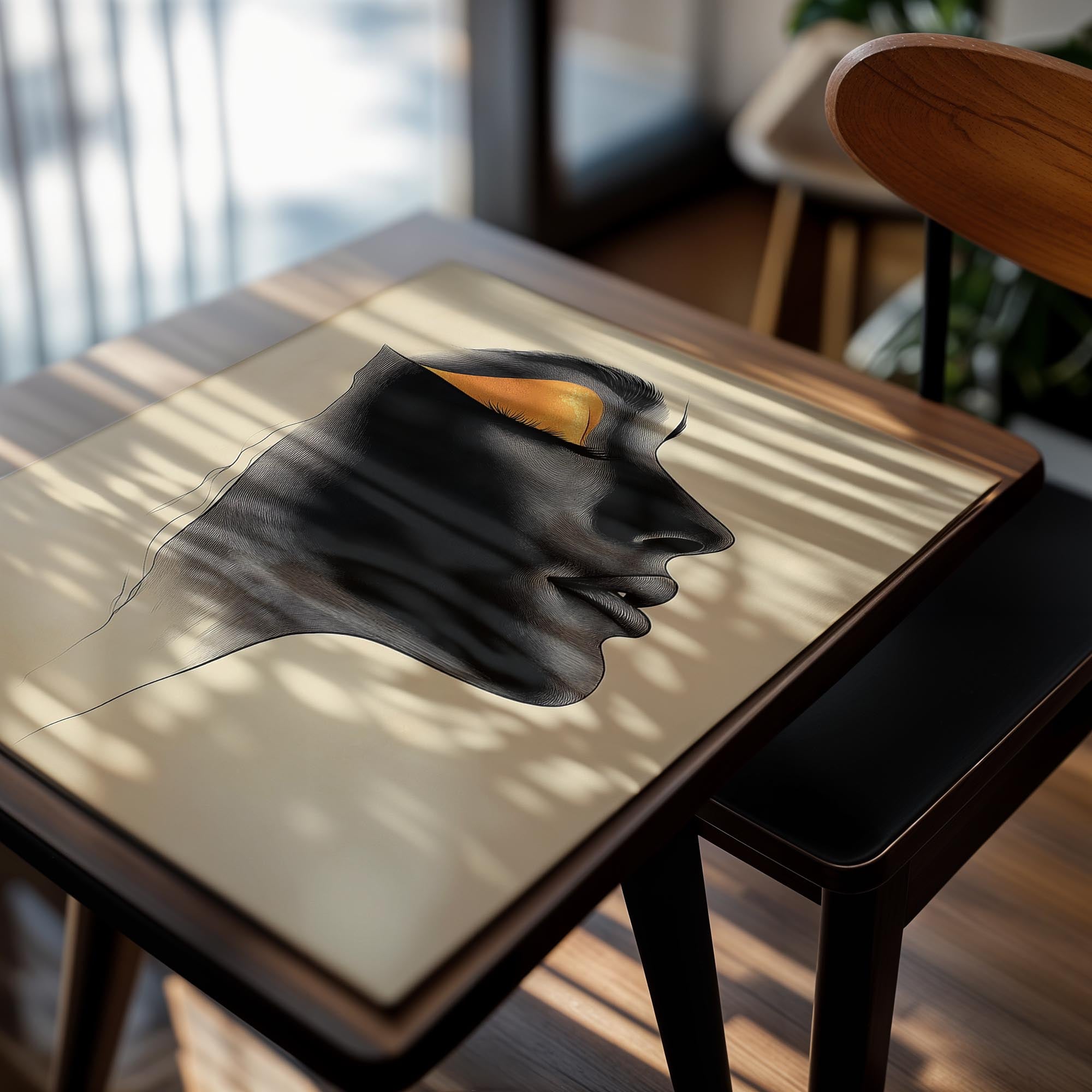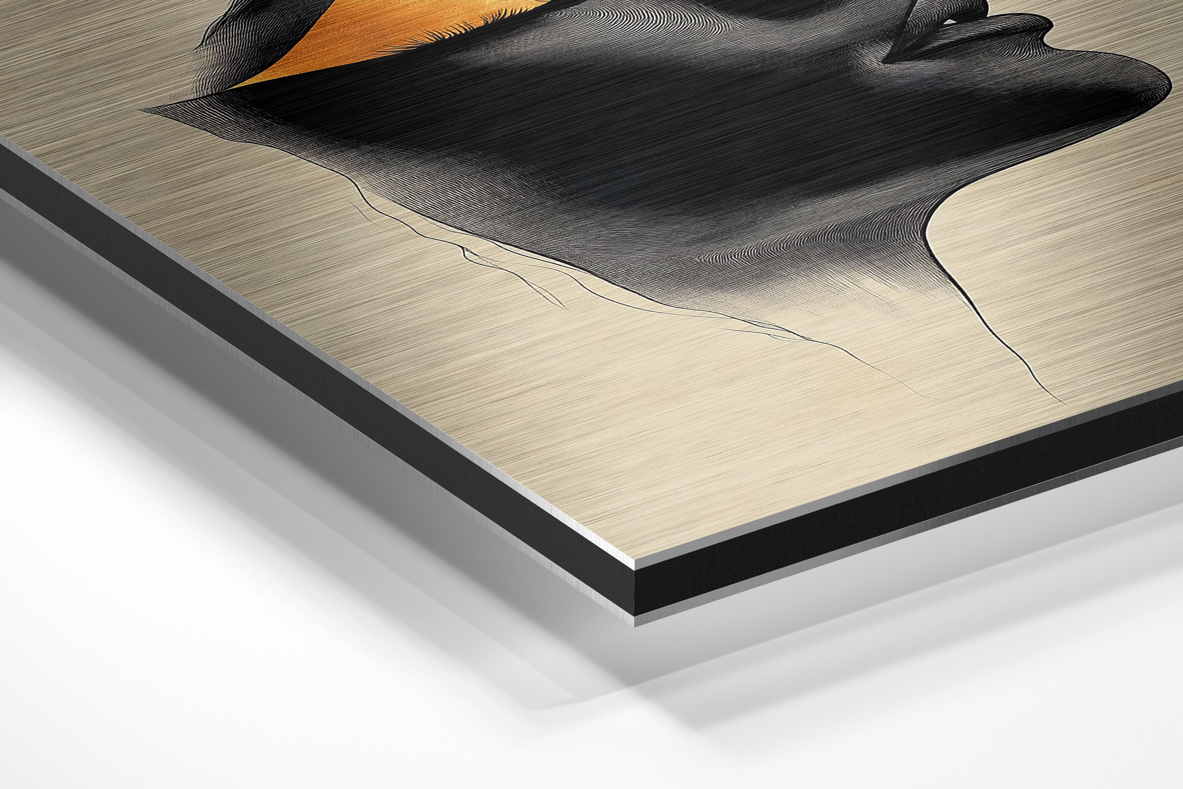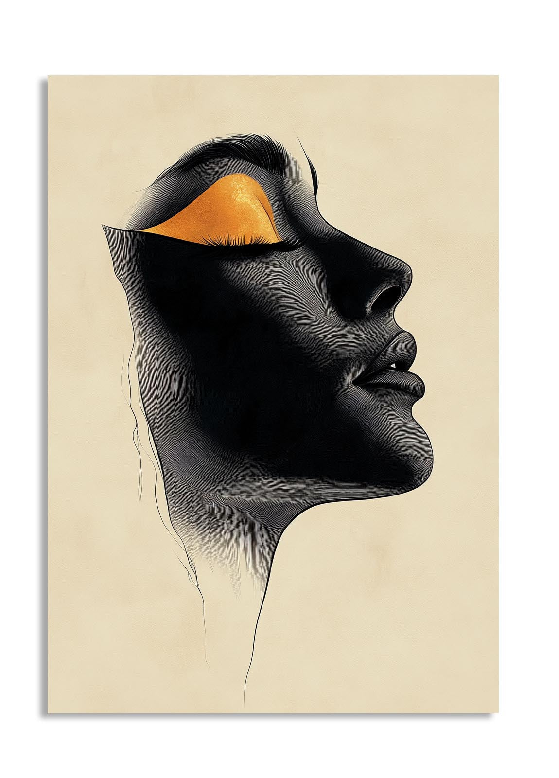 This portrait uses golden accents and deep black shadows to depict a stylized human face in profile. The design is minimalistic yet bold, making it a conversation starter for any room. The golden details evoke a sense of luxury, while the overall composition invites reflection and interpretation. Ideal for contemporary or artistic spaces, this piece complements modern décor with its clean lines and dramatic contrast. Its timeless appeal makes it suitable for homes or galleries seeking to evoke emotion and sophistication in their wall art.
