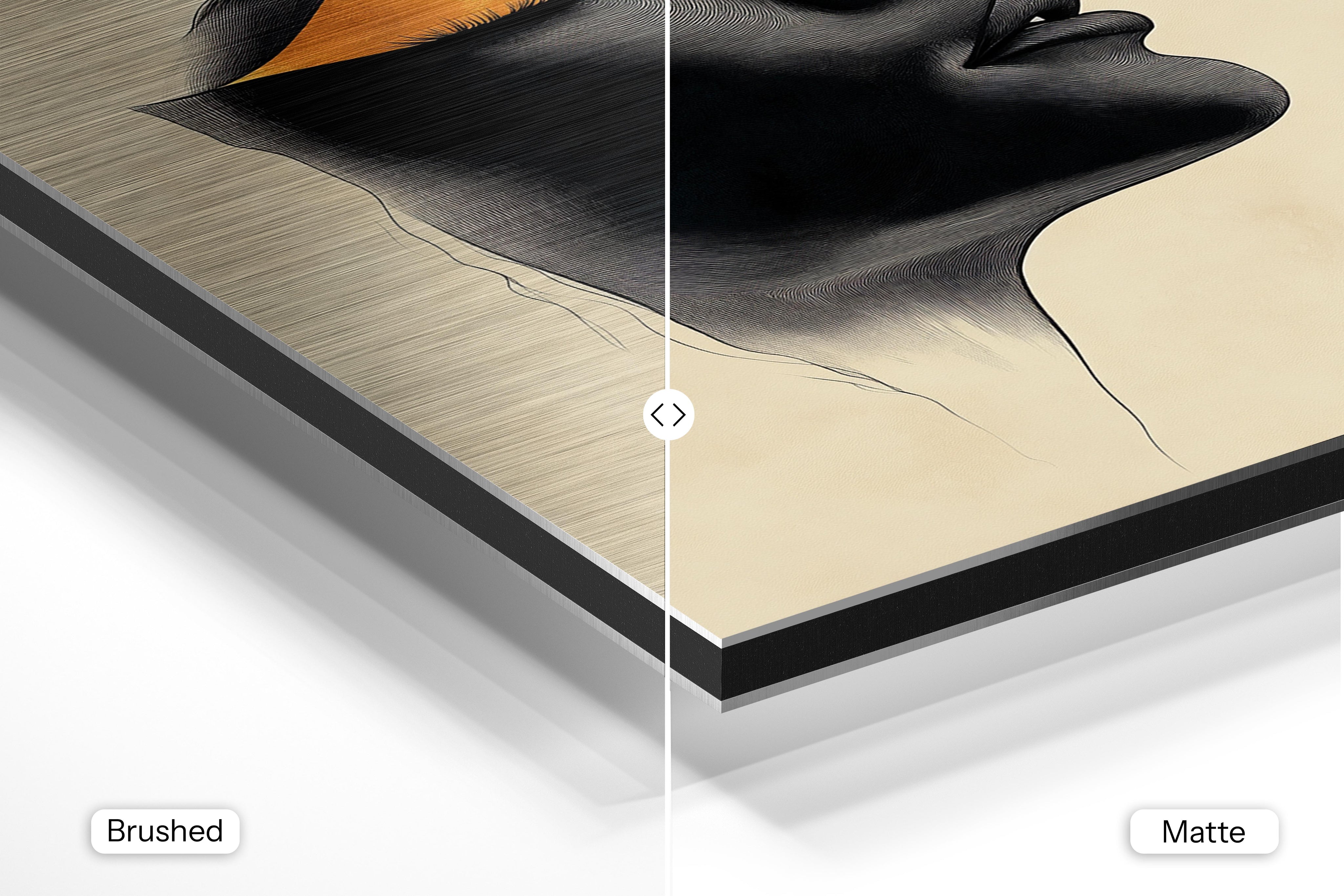- Brushed Aluminum, on the other hand, features a raw metallic texture with visible brush strokes. Whites and highlights in your image let the silver surface show through, adding a dramatic, shimmering effect. Ideal for black-and-white images, minimalist designs, or abstract art, it creates a bold, industrial vibe with a modern edge.