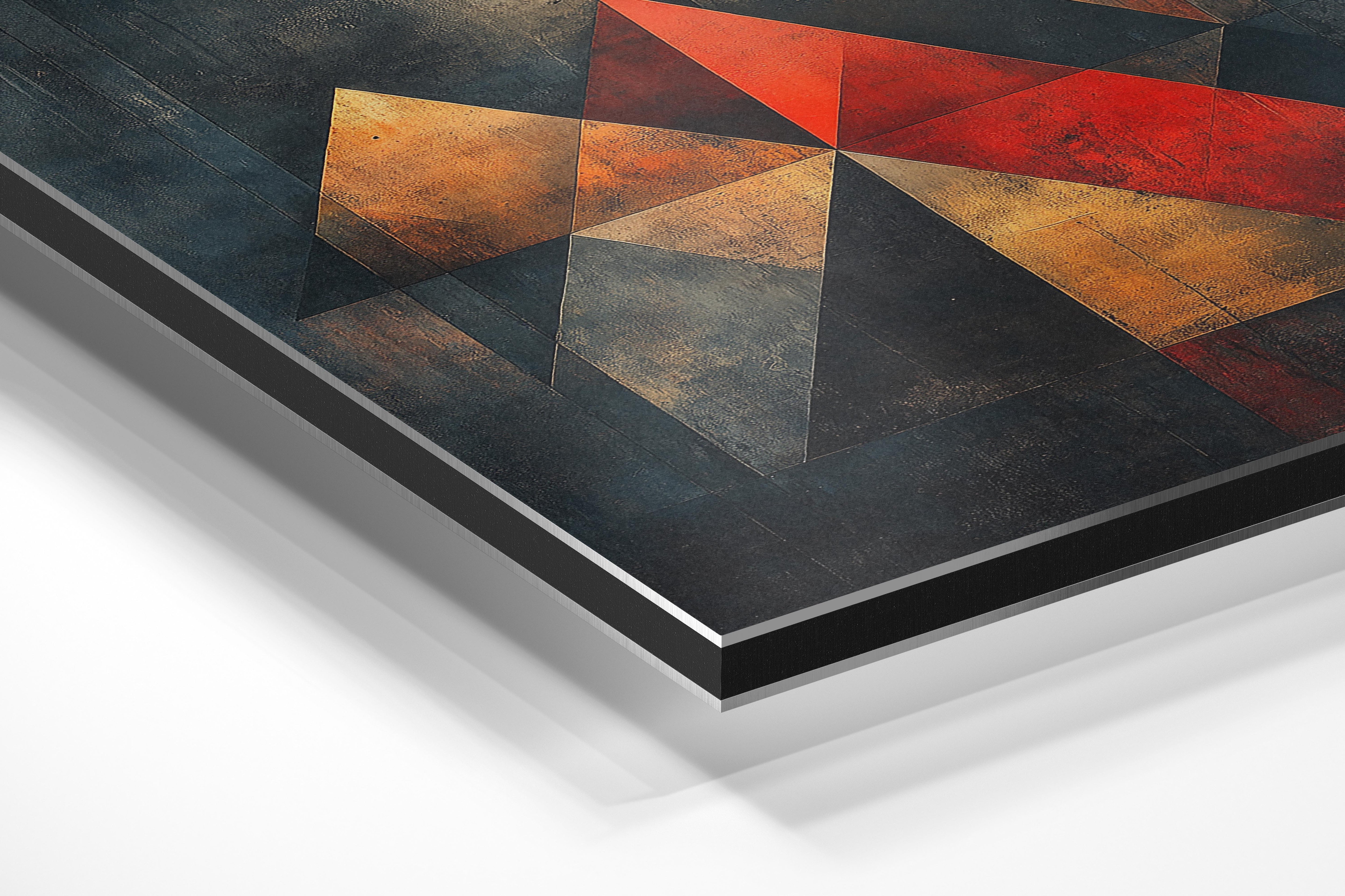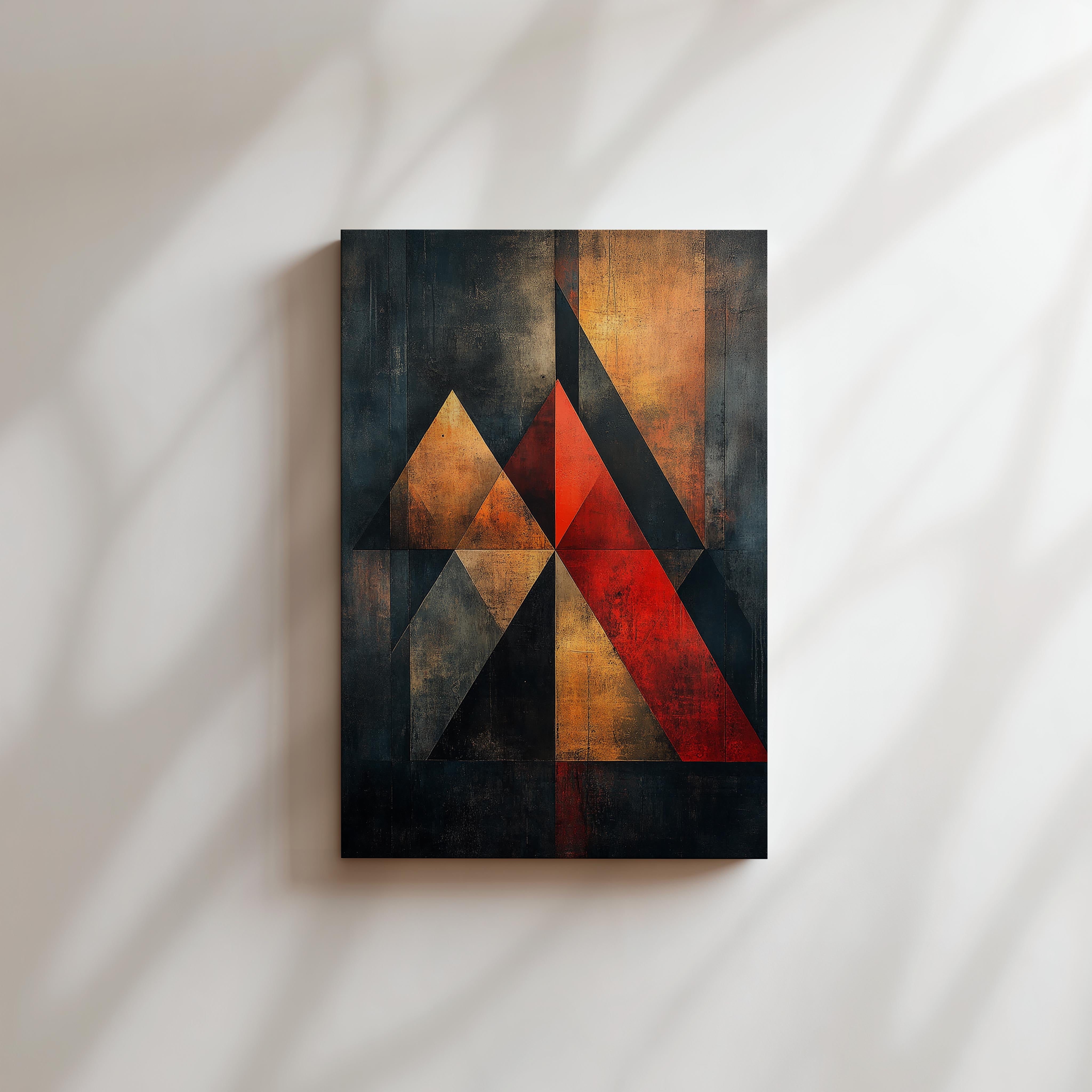 This bold geometric piece combines red and gold triangles with sharp lines and dramatic contrasts, creating a visually impactful design. Its modern and luxurious feel makes it perfect for sophisticated spaces like offices, living rooms, or galleries. The rich colors and structured composition evoke strength and elegance, making it a standout addition to contemporary decor.