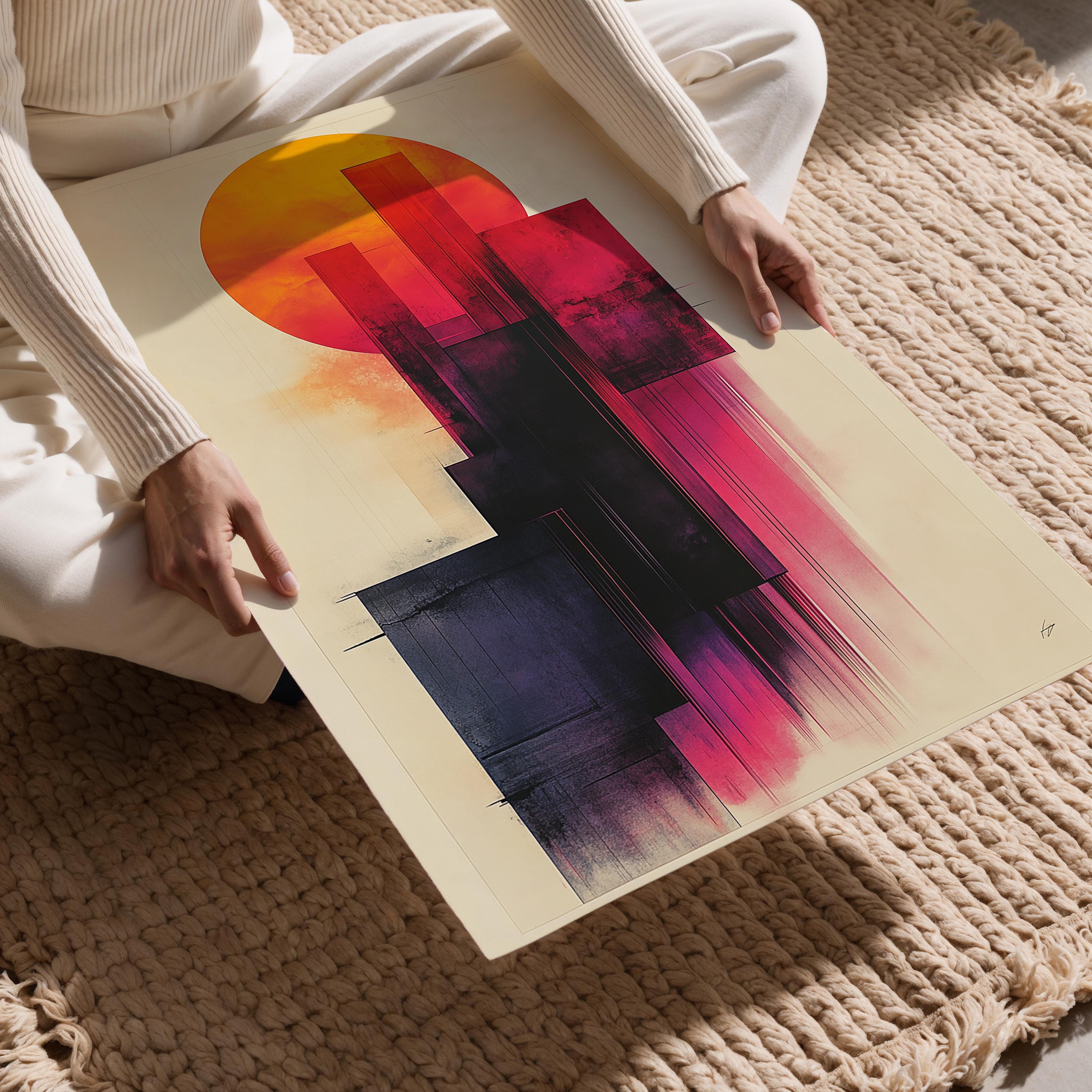 A captivating abstract artwork depicting a vivid sunset behind geometric skyscrapers. The bold contrasts of fiery reds, deep blacks, and subtle yellows create a modern yet emotive composition. Perfect for urban-themed interiors, creative workspaces, or contemporary galleries, this piece evokes both the energy of a bustling city and the tranquility of a setting sun. It appeals to lovers of abstract art and architecture, making it a versatile addition to any modern decor. The bold color palette makes a striking focal point on any wall.