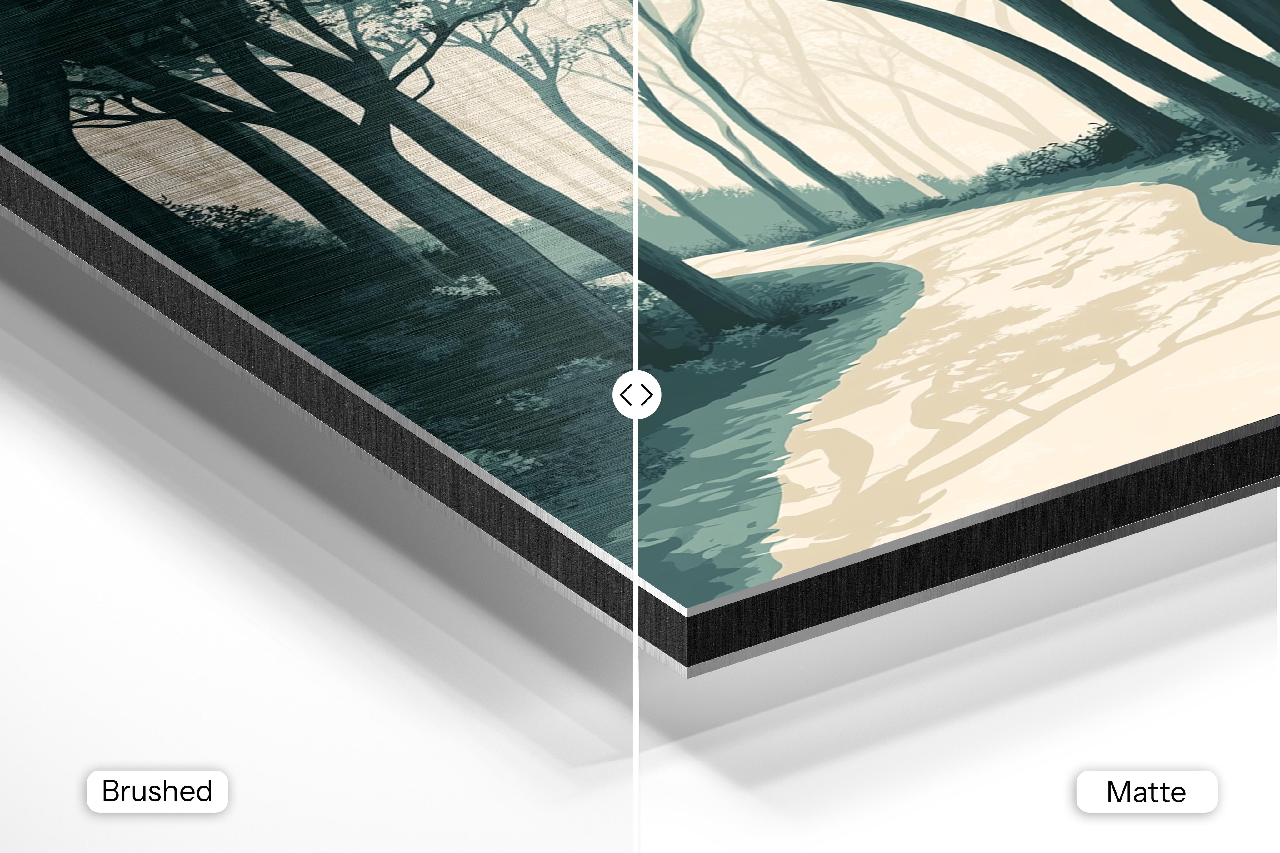 - Brushed Aluminum, on the other hand, features a raw metallic texture with visible brush strokes. Whites and highlights in your image let the silver surface show through, adding a dramatic, shimmering effect. Ideal for black-and-white images, minimalist designs, or abstract art, it creates a bold, industrial vibe with a modern edge.