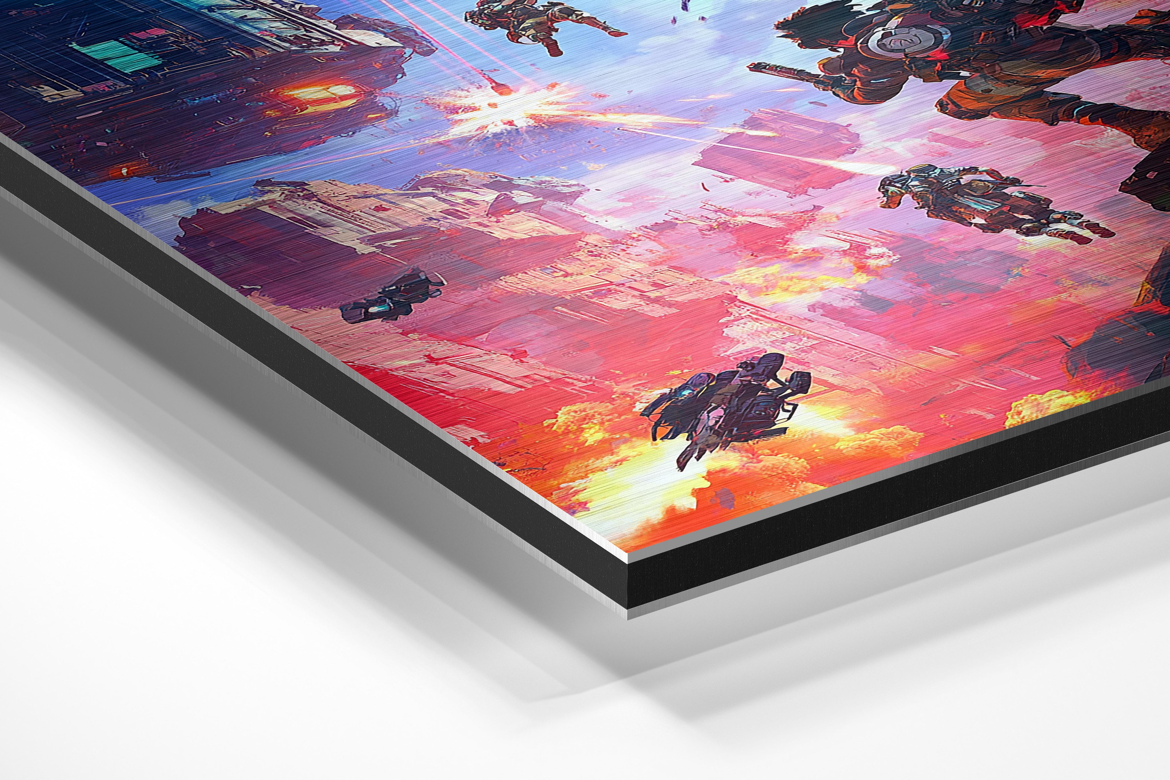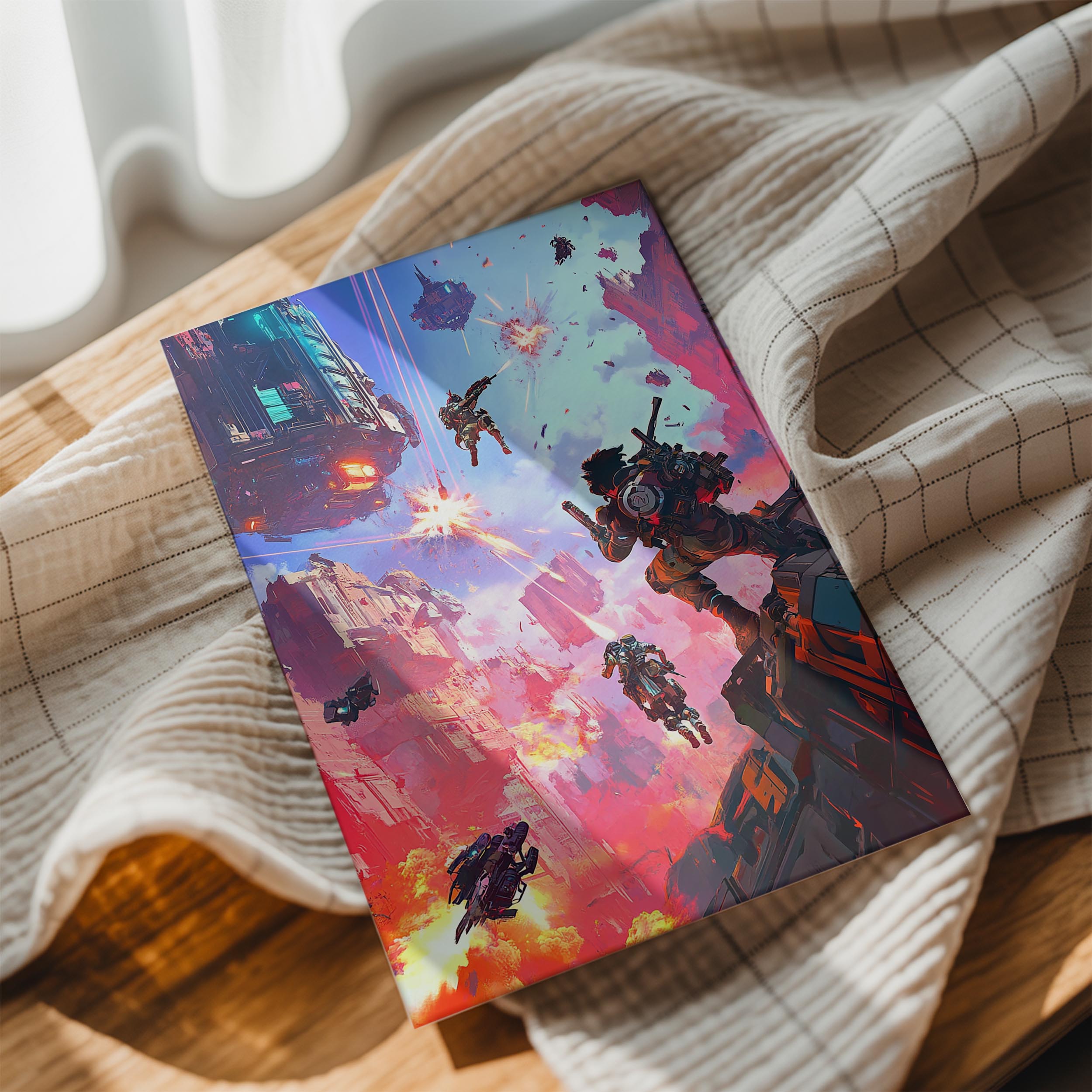 A high-intensity sci-fi battle unfolds in a futuristic sky city, where armored soldiers equipped with jetpacks engage in an all-out aerial firefight. The vibrant hues of the explosions contrast against the deep blue sky, while floating structures provide a dramatic battlefield. This image captures a sense of urgency and chaos, making it ideal for sci-fi lovers or gaming enthusiasts. It would be perfect for a gaming room, an action-themed workspace, or as a dynamic centerpiece in a modern setting.