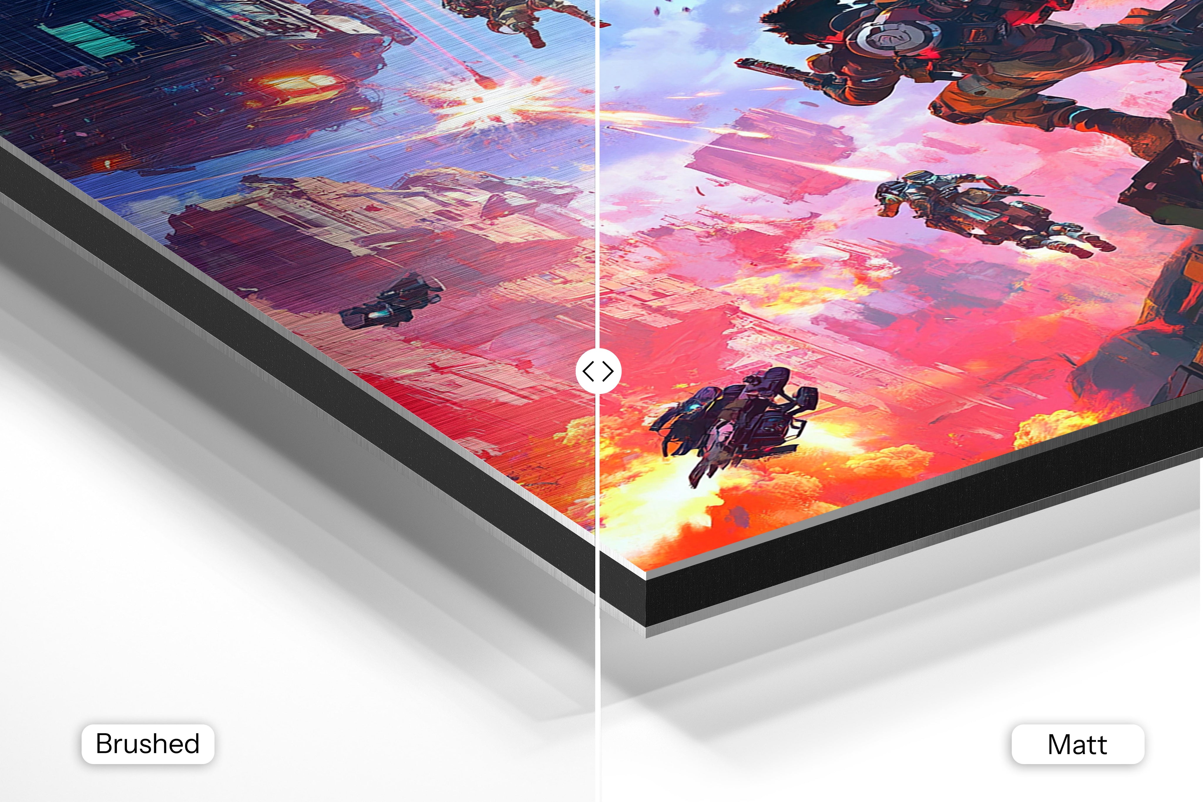 - Brushed Aluminum, on the other hand, features a raw metallic texture with visible brush strokes. Whites and highlights in your image let the silver surface show through, adding a dramatic, shimmering effect. Ideal for black-and-white images, minimalist designs, or abstract art, it creates a bold, industrial vibe with a modern edge.