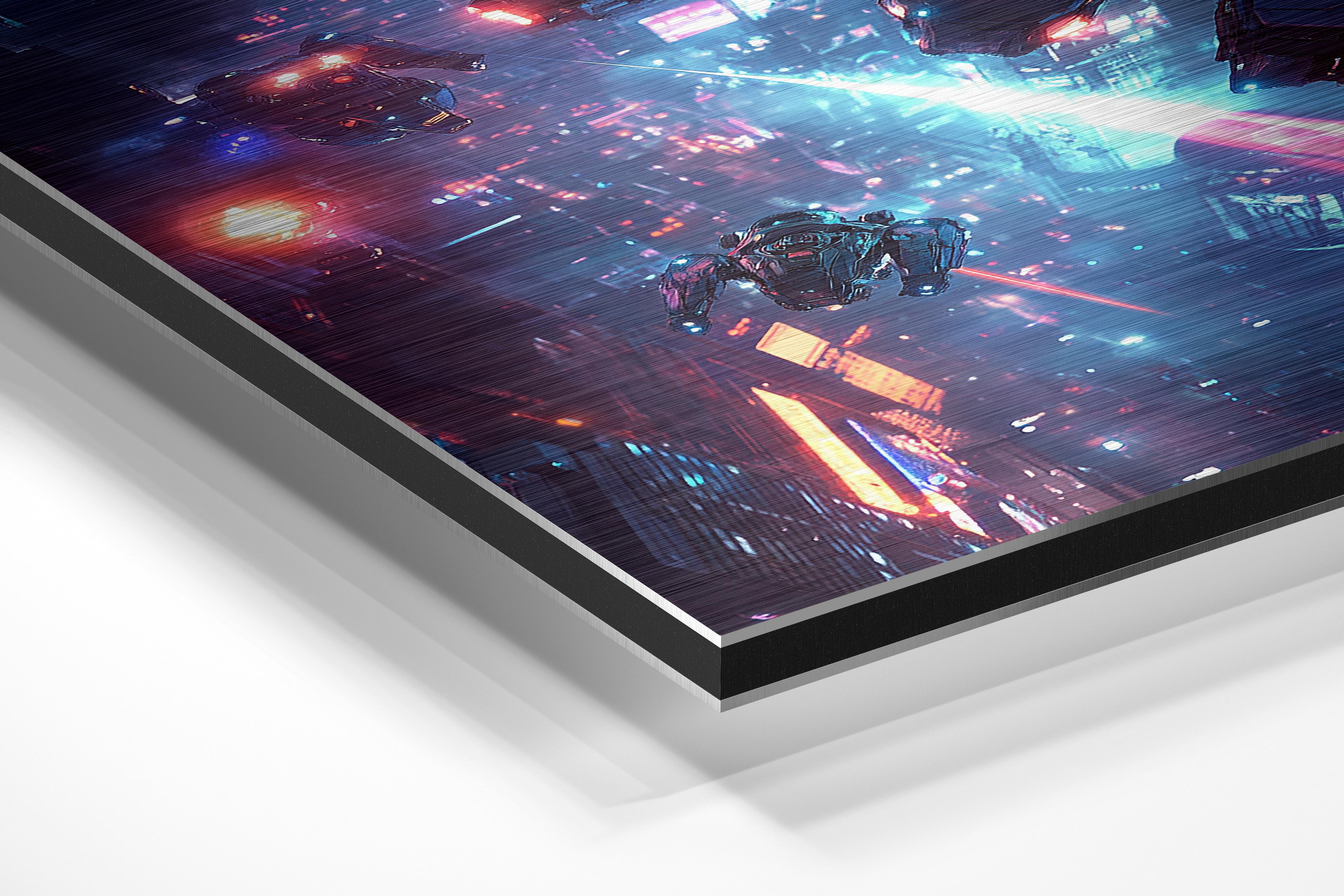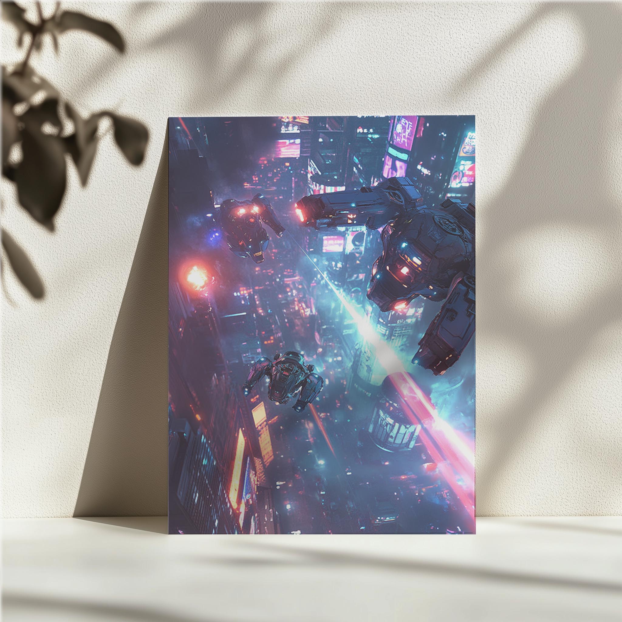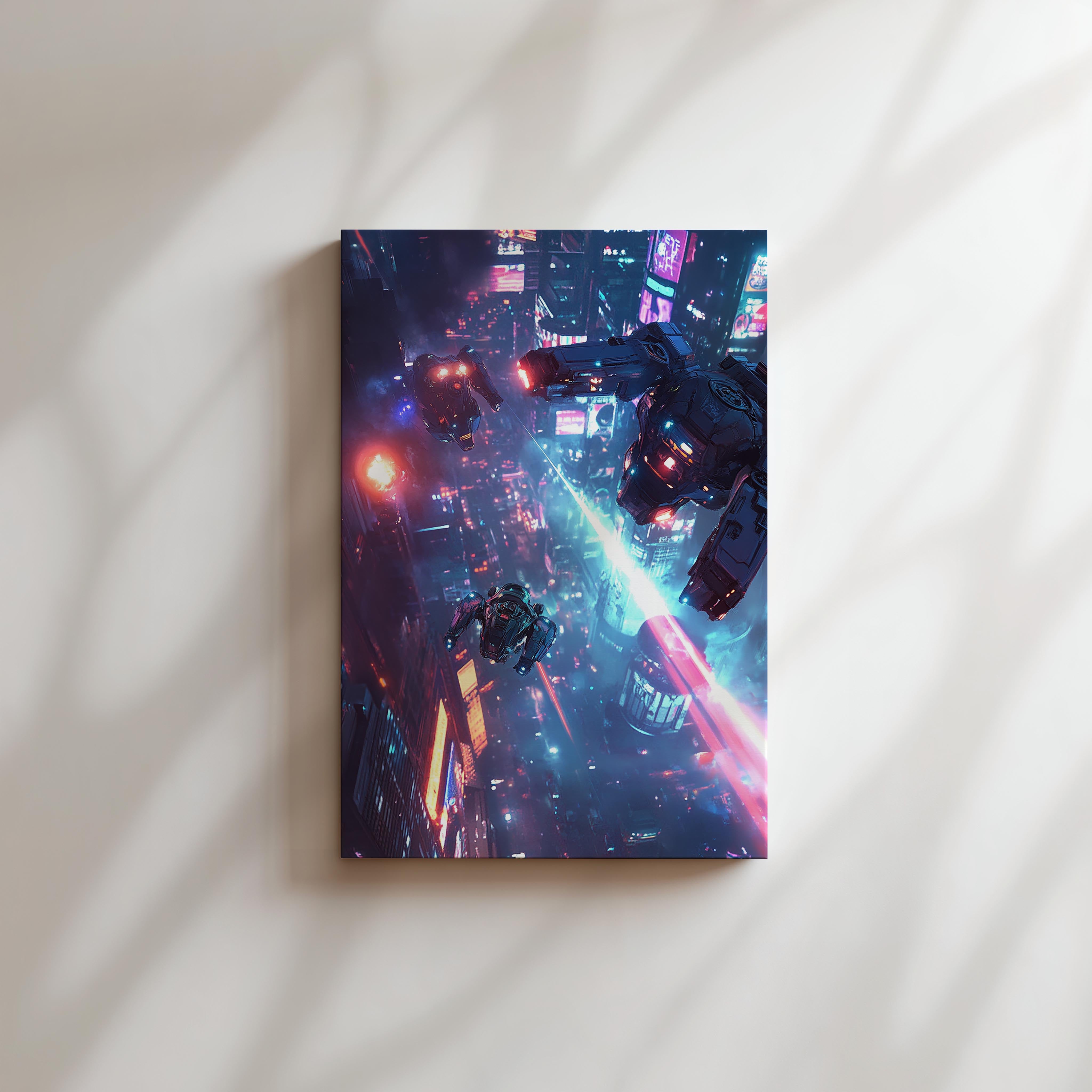 High-tech drones and mechas engage in a breathtaking battle above a glowing cyberpunk city. The vivid neon blues and pinks create a vibrant contrast against the night sky, emphasizing the futuristic setting. This piece captures the thrill of aerial combat and technological mastery, ideal for lovers of sci-fi action and dramatic compositions.