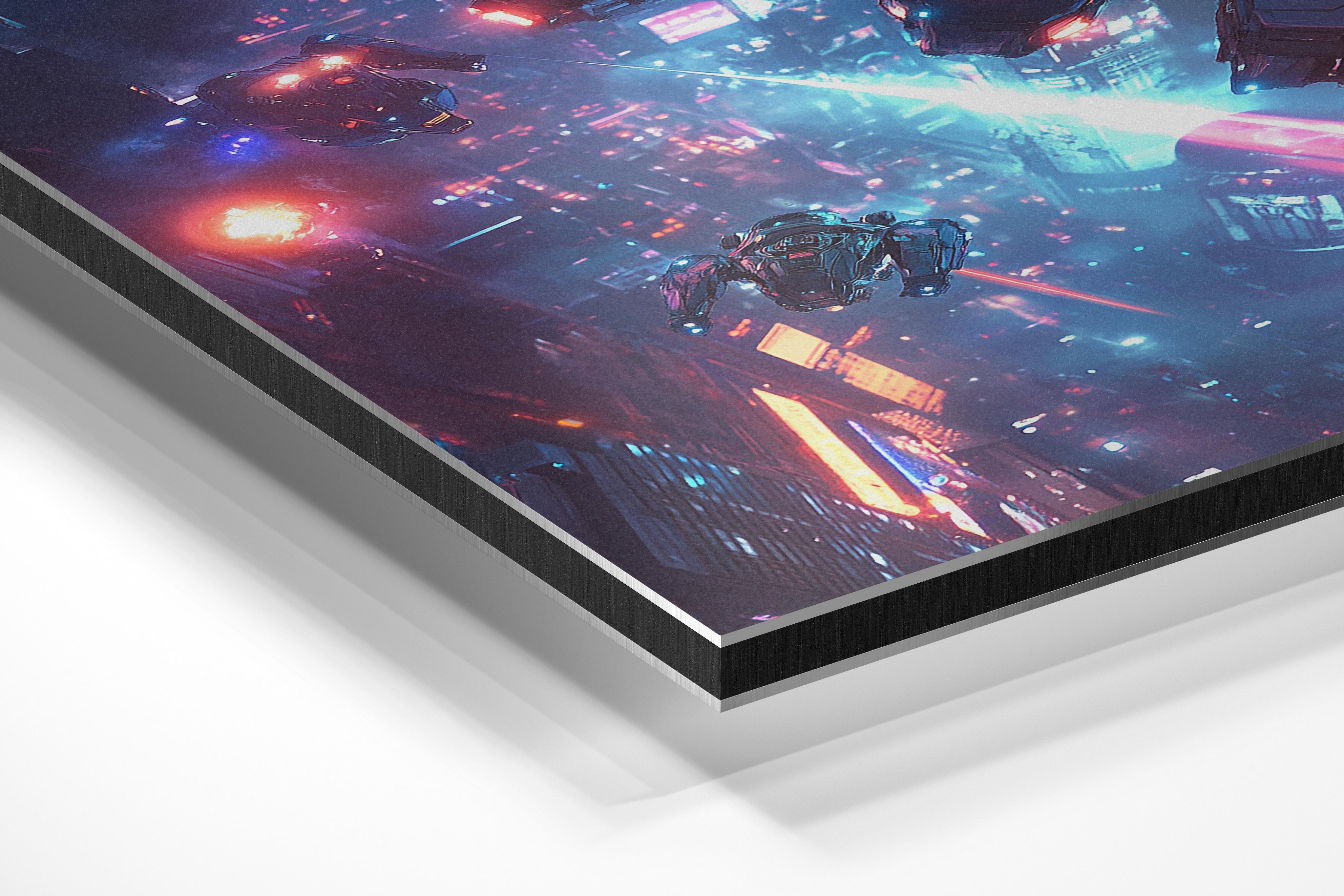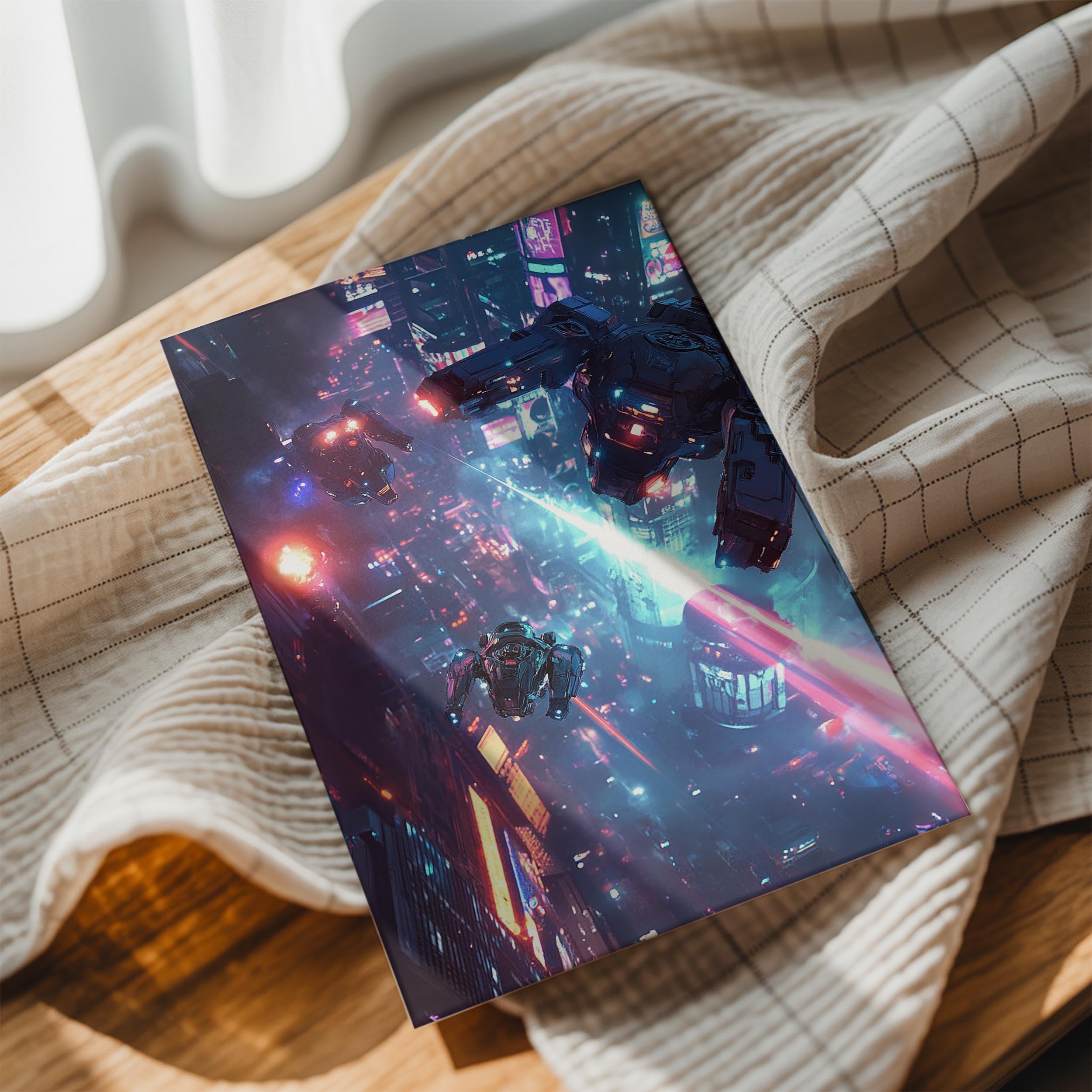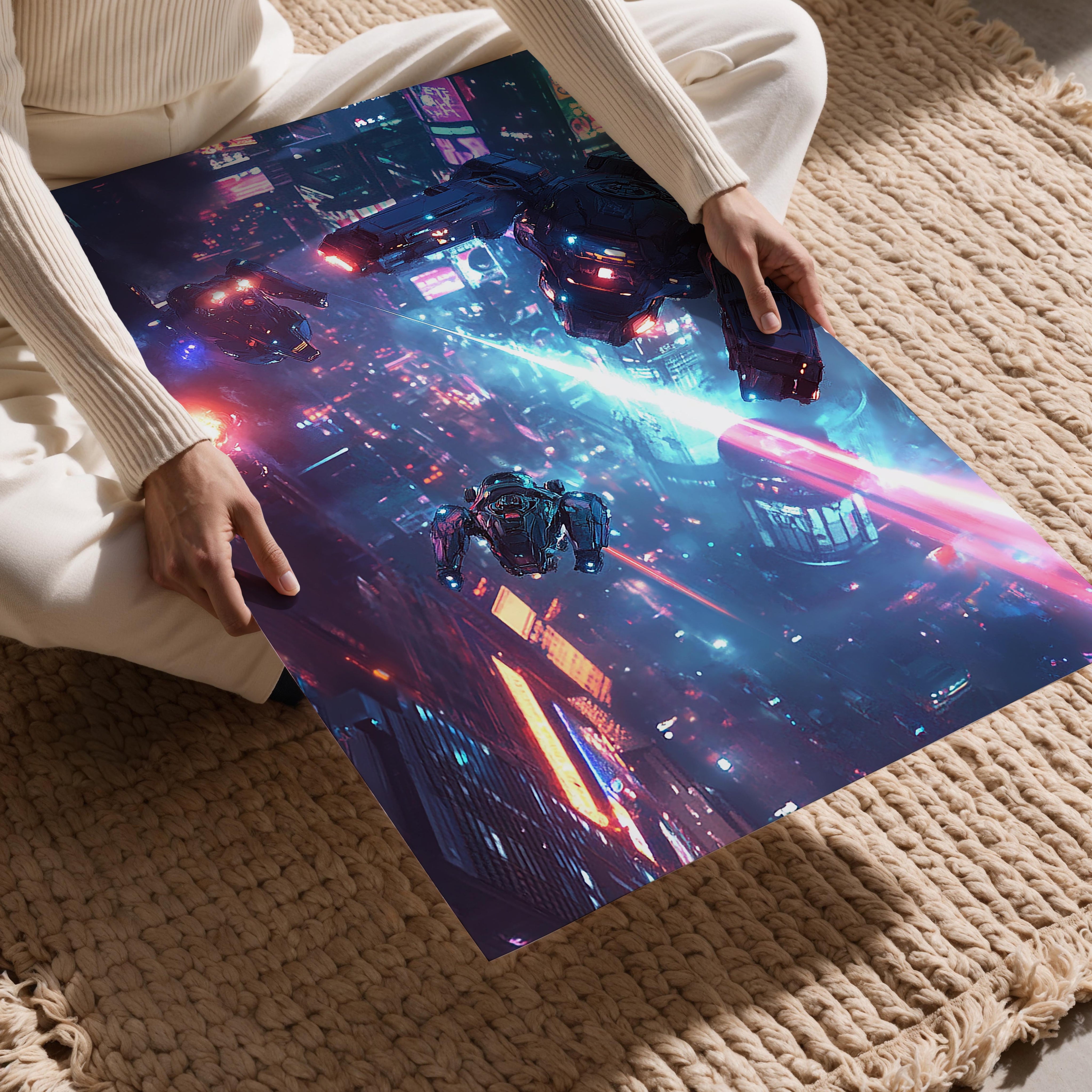 High-tech drones and mechas engage in a breathtaking battle above a glowing cyberpunk city. The vivid neon blues and pinks create a vibrant contrast against the night sky, emphasizing the futuristic setting. This piece captures the thrill of aerial combat and technological mastery, ideal for lovers of sci-fi action and dramatic compositions.