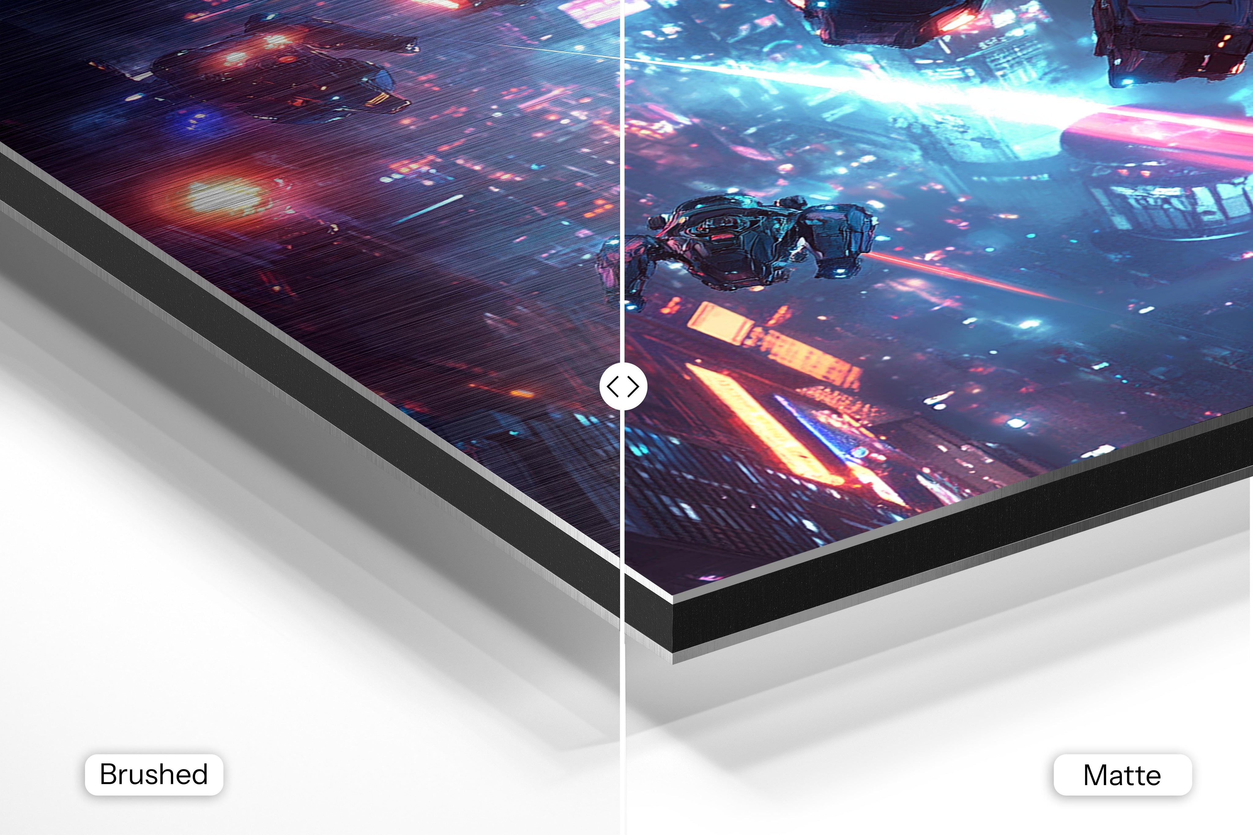 - Brushed Aluminum, on the other hand, features a raw metallic texture with visible brush strokes. Whites and highlights in your image let the silver surface show through, adding a dramatic, shimmering effect. Ideal for black-and-white images, minimalist designs, or abstract art, it creates a bold, industrial vibe with a modern edge.