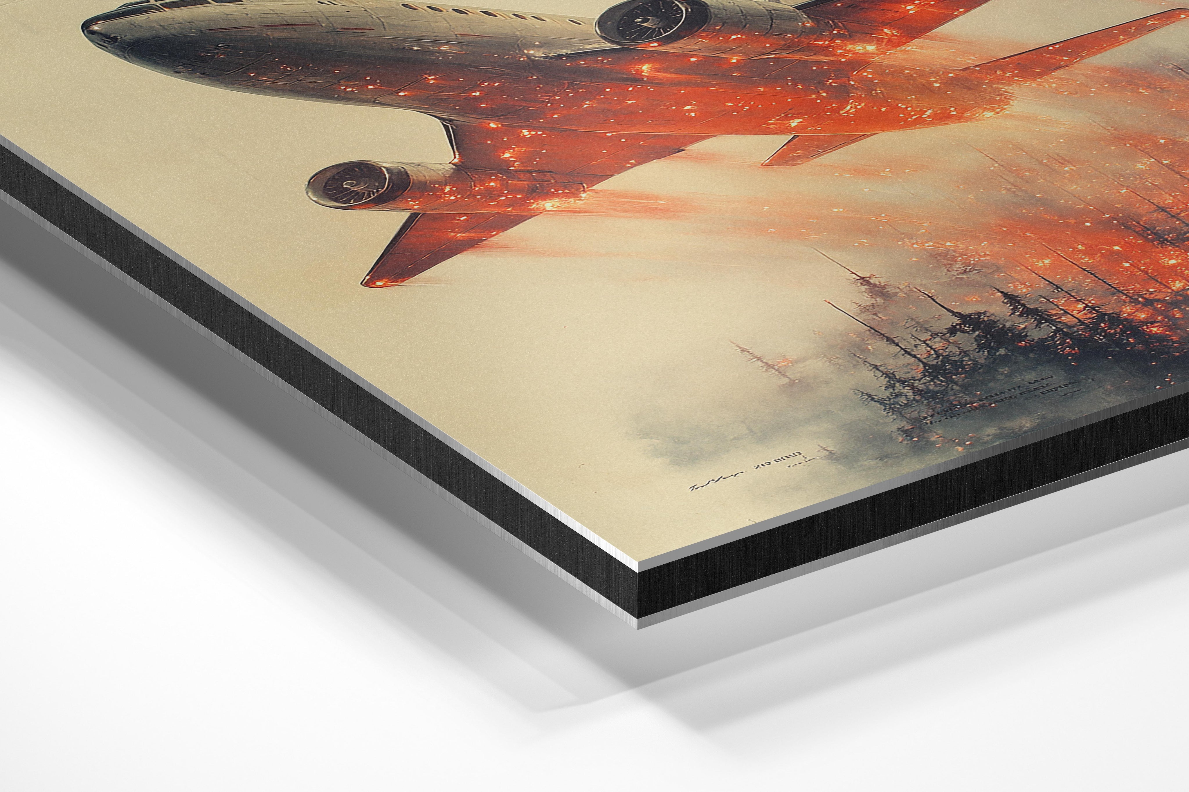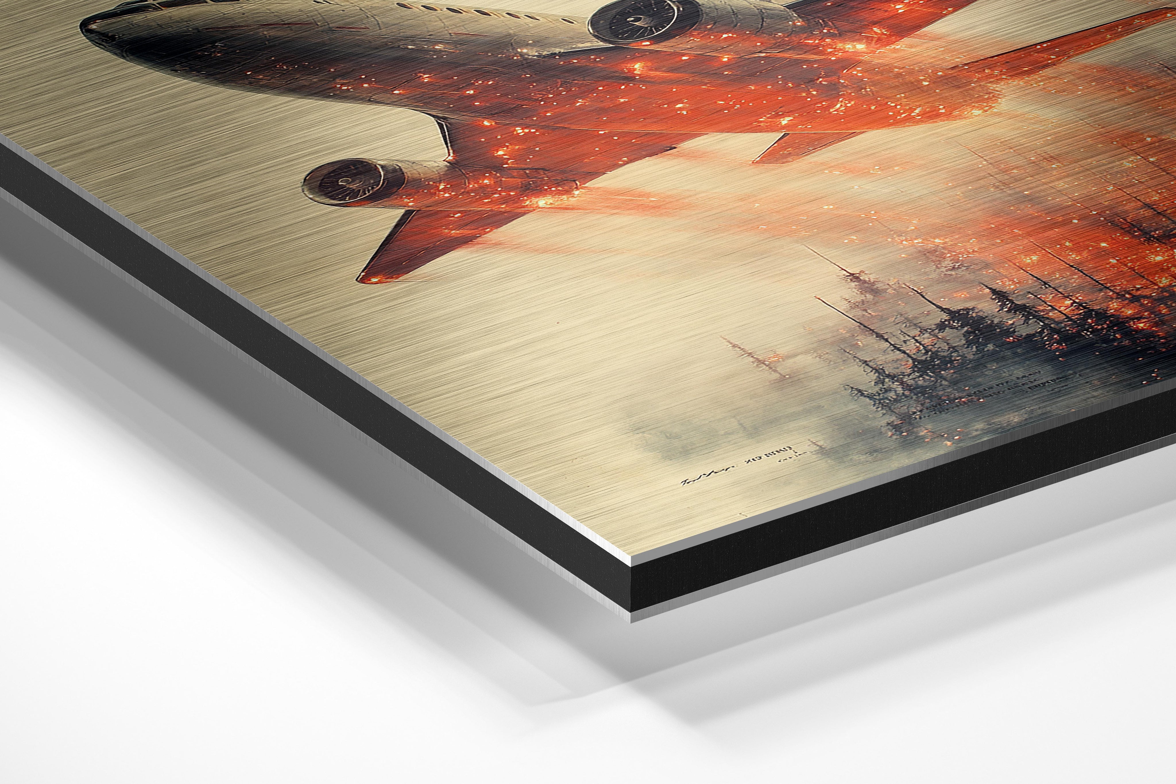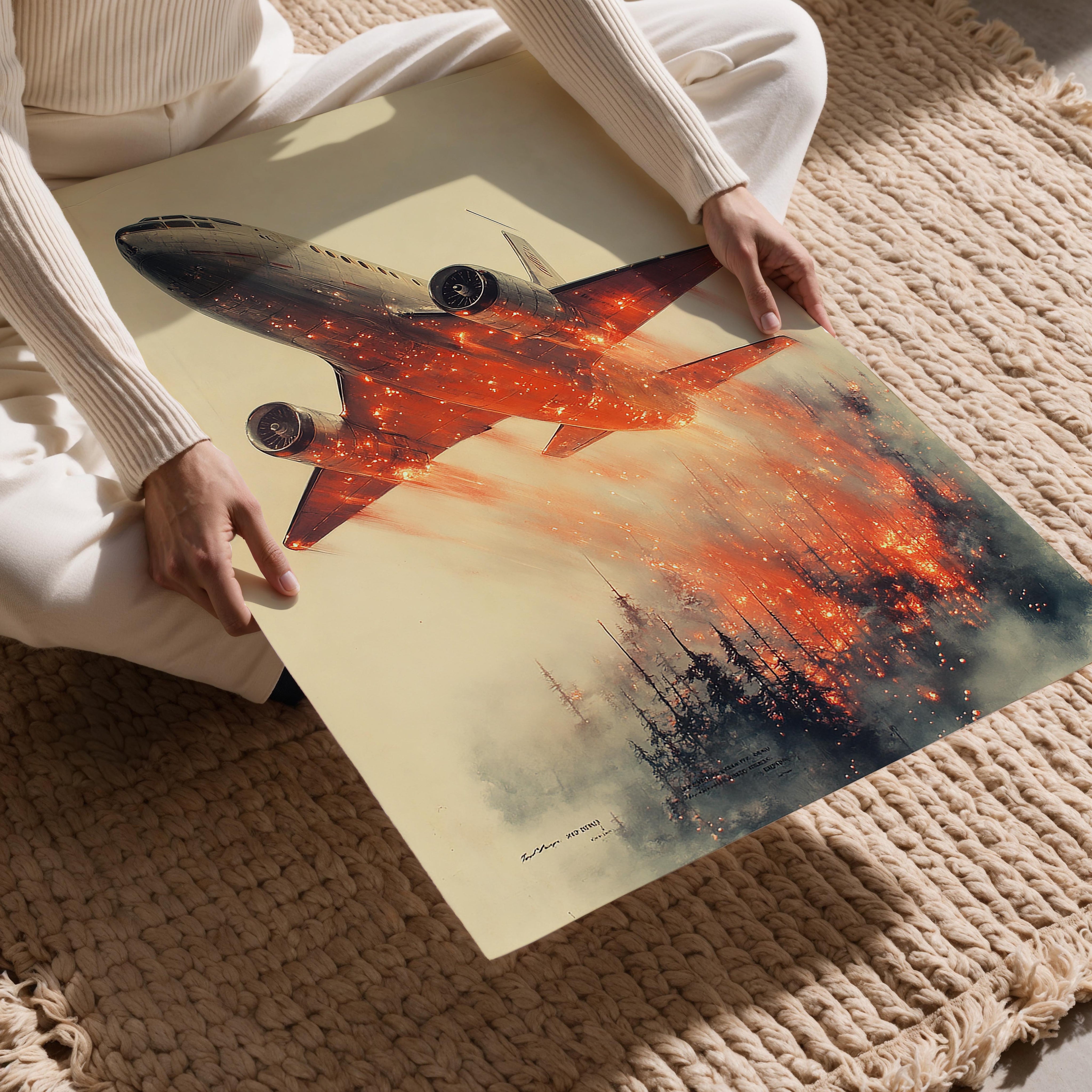 This dramatic artwork portrays an airplane soaring over a forest fire, releasing fire retardant to combat the raging flames. The vivid depiction of smoke, fire, and the aircraft’s dynamic movement captures the urgency and bravery of firefighting efforts. The image highlights both the power of technology and the fragility of nature. Ideal for aviation enthusiasts or as a bold statement about environmental issues in a modern or professional setting.