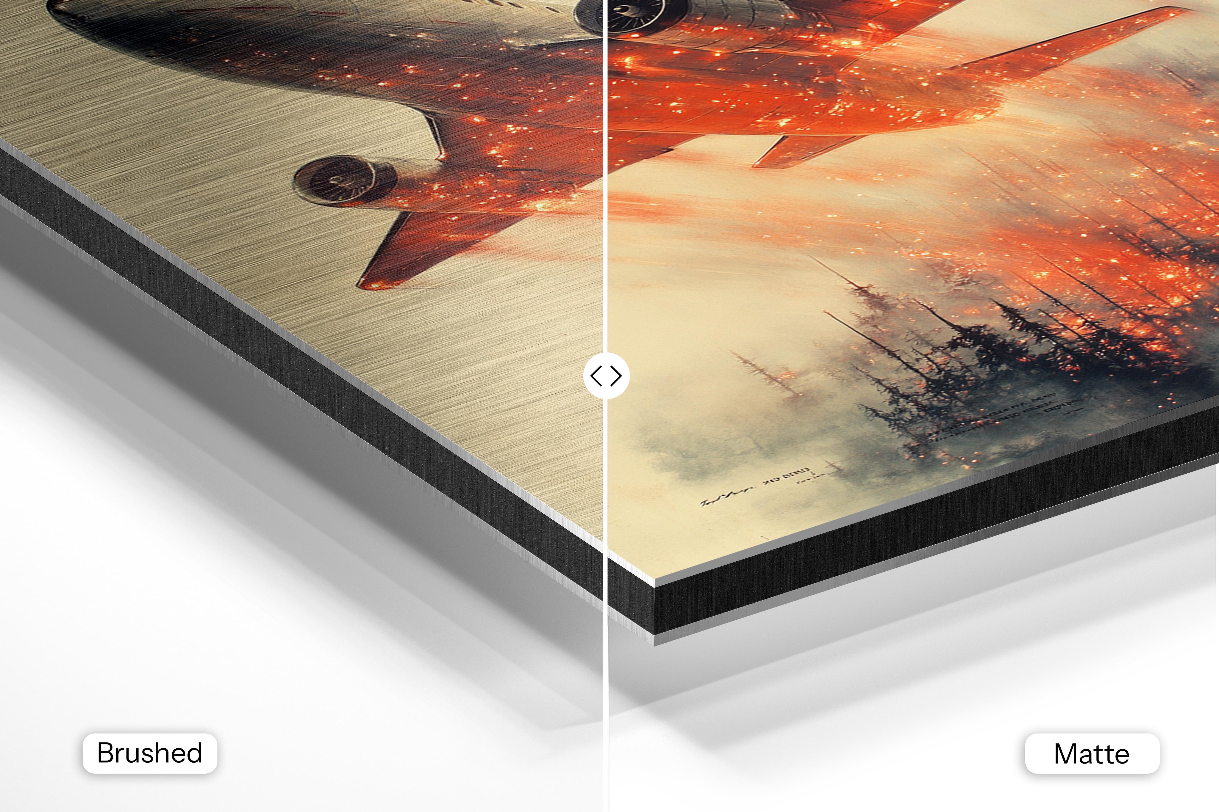 - Brushed Aluminum, on the other hand, features a raw metallic texture with visible brush strokes. Whites and highlights in your image let the silver surface show through, adding a dramatic, shimmering effect. Ideal for black-and-white images, minimalist designs, or abstract art, it creates a bold, industrial vibe with a modern edge.
