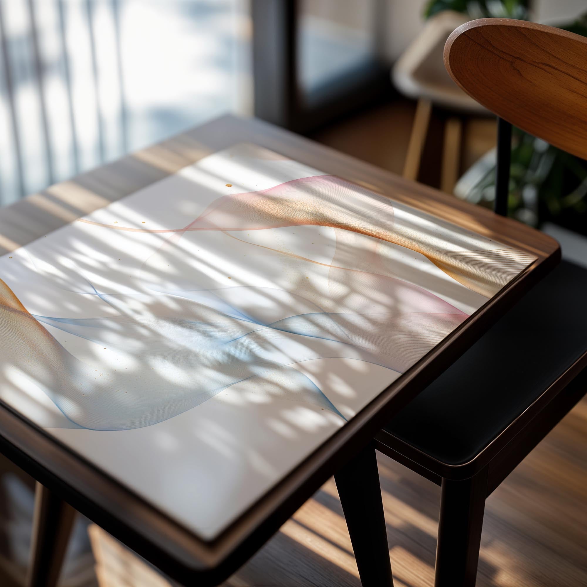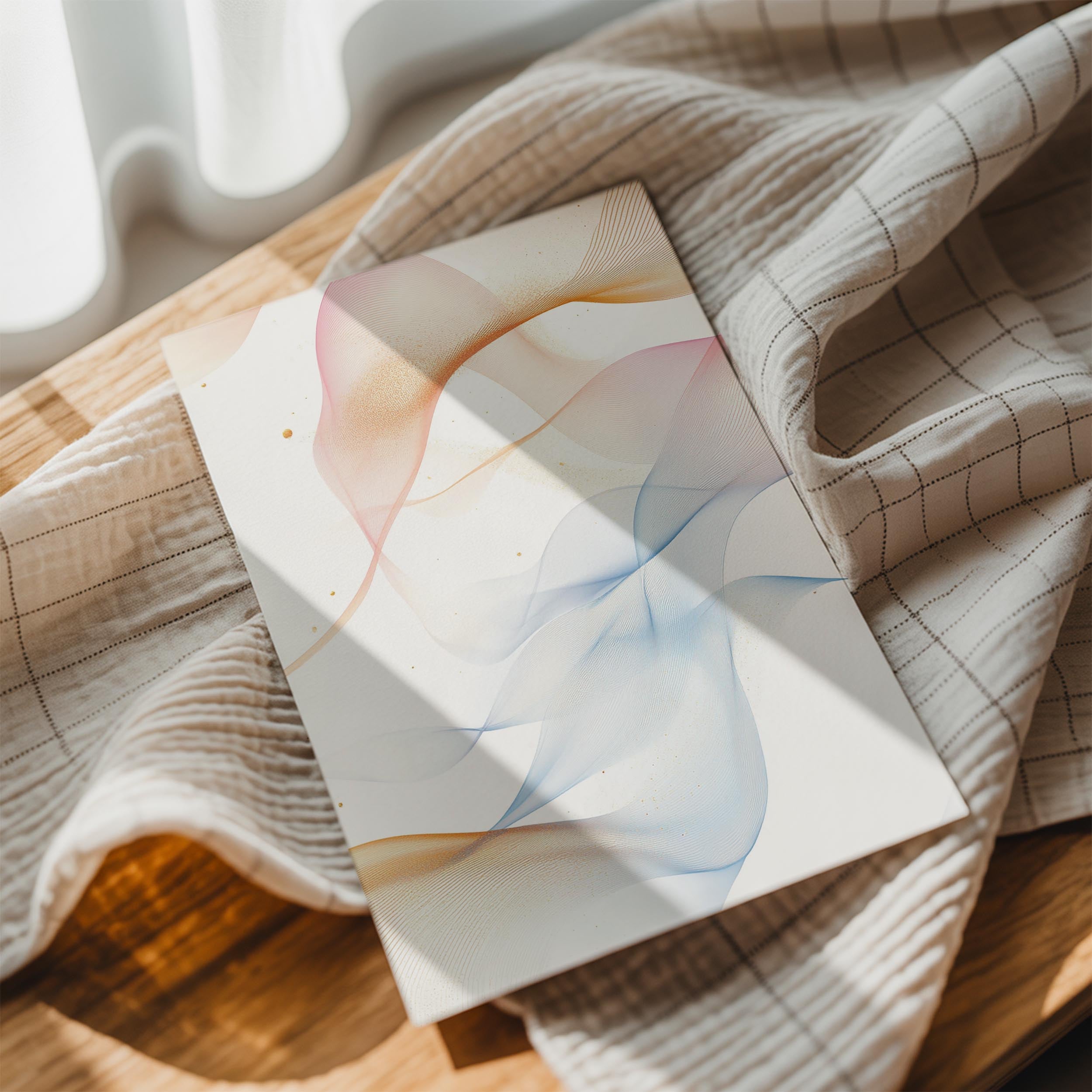 A delicate and whimsical abstract featuring soft, translucent waves of color in pale pink, blue, and gold. The light, ethereal composition exudes a sense of peace and wonder, perfect for brightening a modern or minimalist interior. Ideal for meditation rooms, bedrooms, or creative spaces, this artwork brings an airy and uplifting atmosphere to any wall. Its gentle design is both calming and visually engaging, making it a versatile addition to various decor styles.