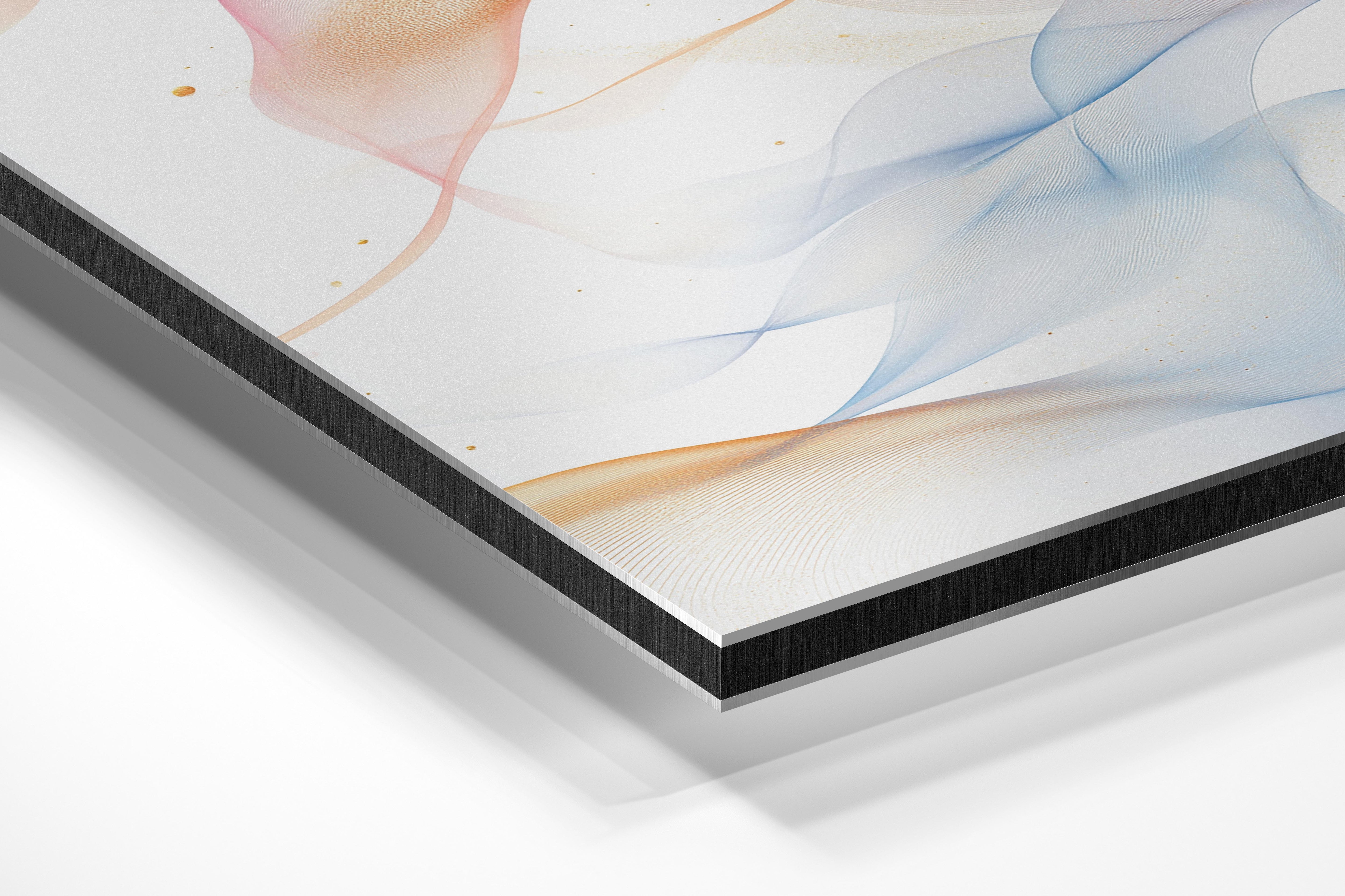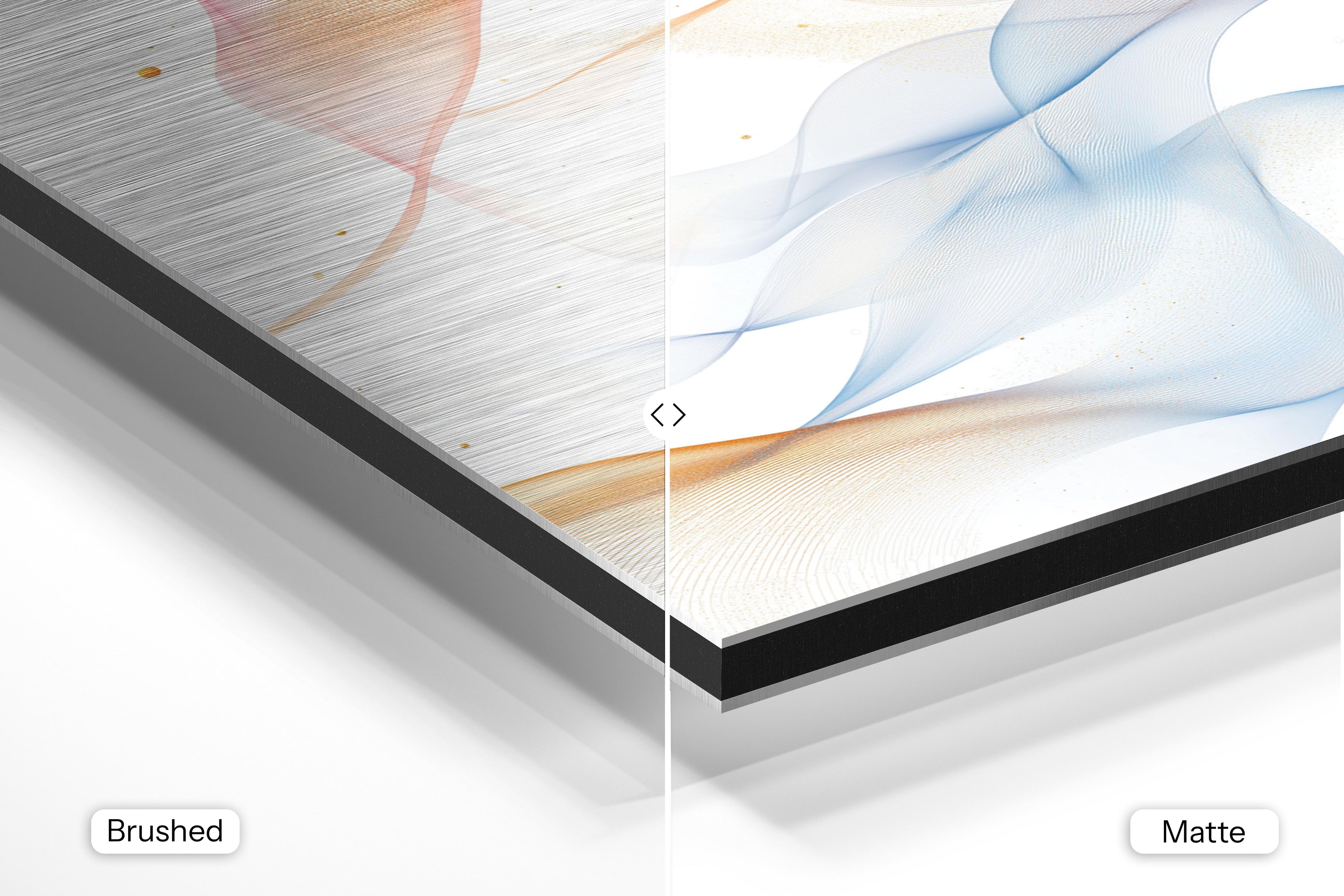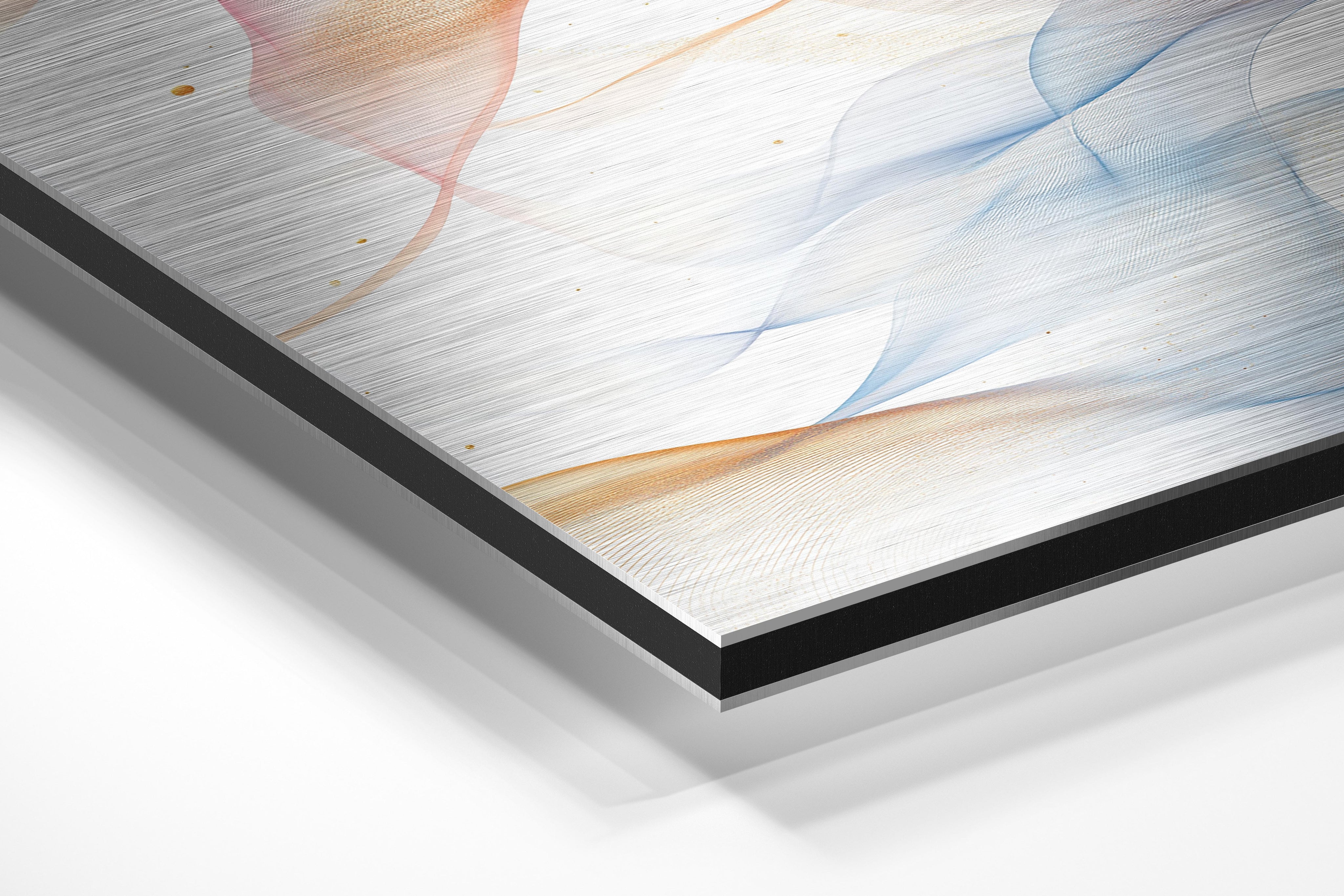 - Brushed Aluminum, on the other hand, features a raw metallic texture with visible brush strokes. Whites and highlights in your image let the silver surface show through, adding a dramatic, shimmering effect. Ideal for black-and-white images, minimalist designs, or abstract art, it creates a bold, industrial vibe with a modern edge.