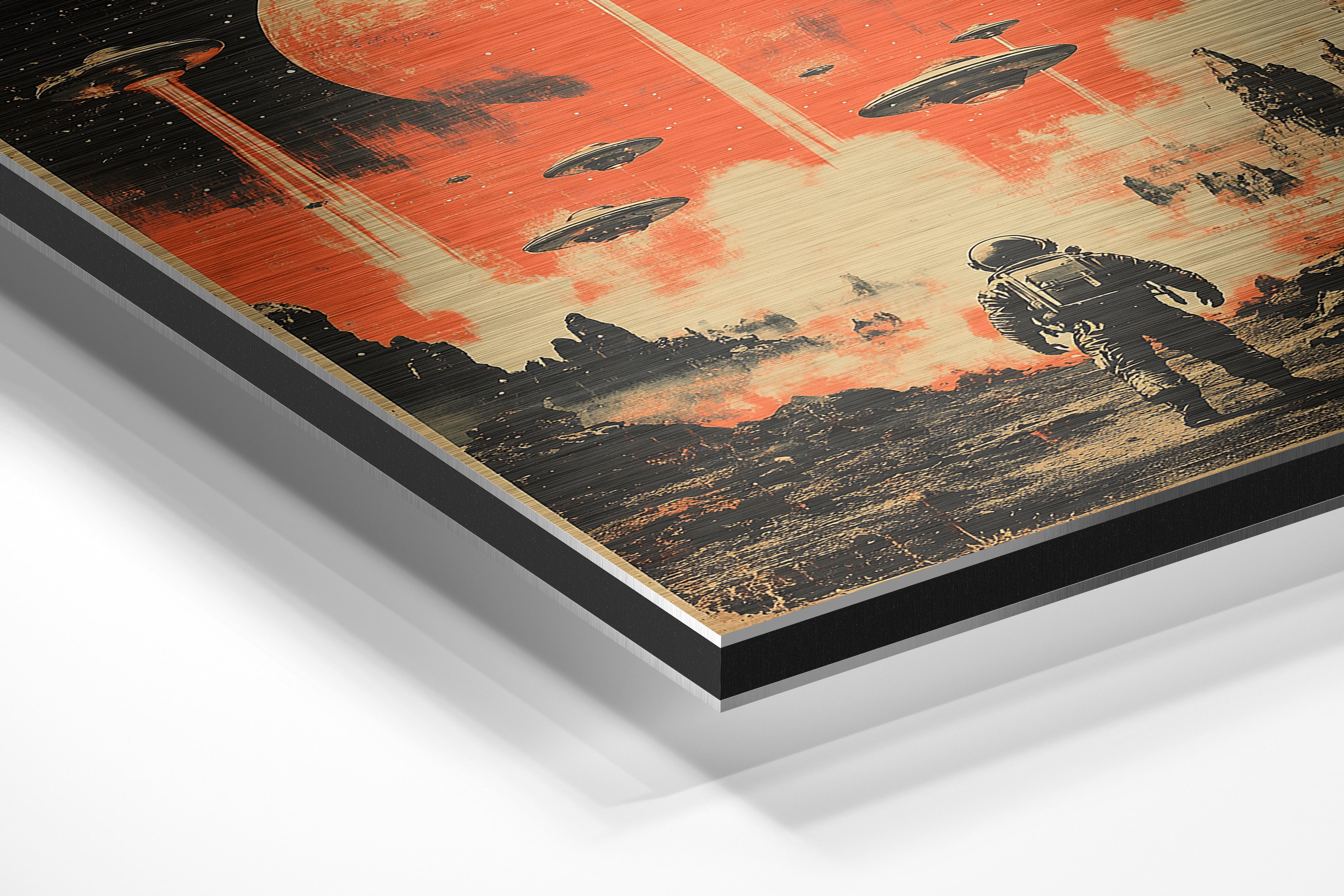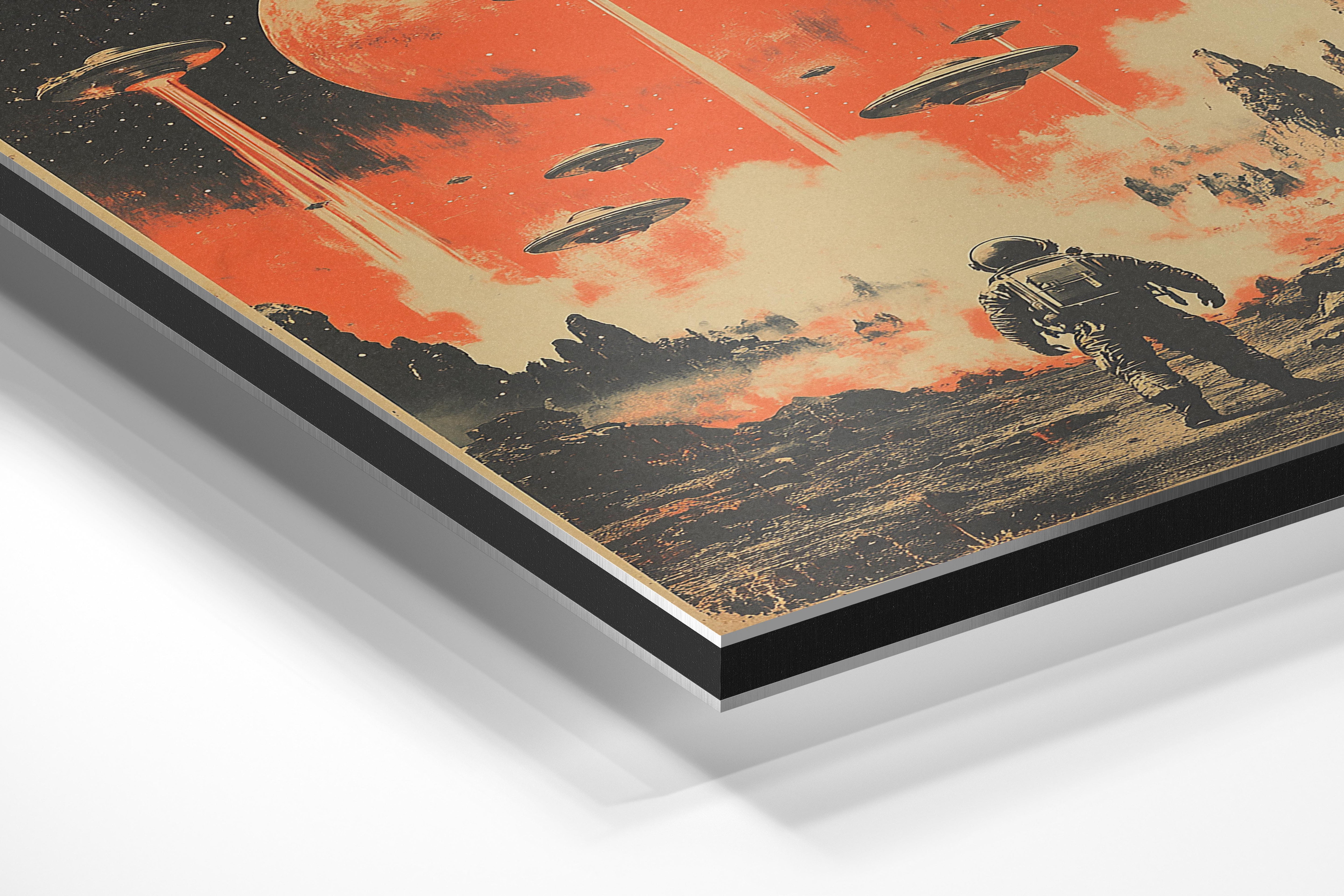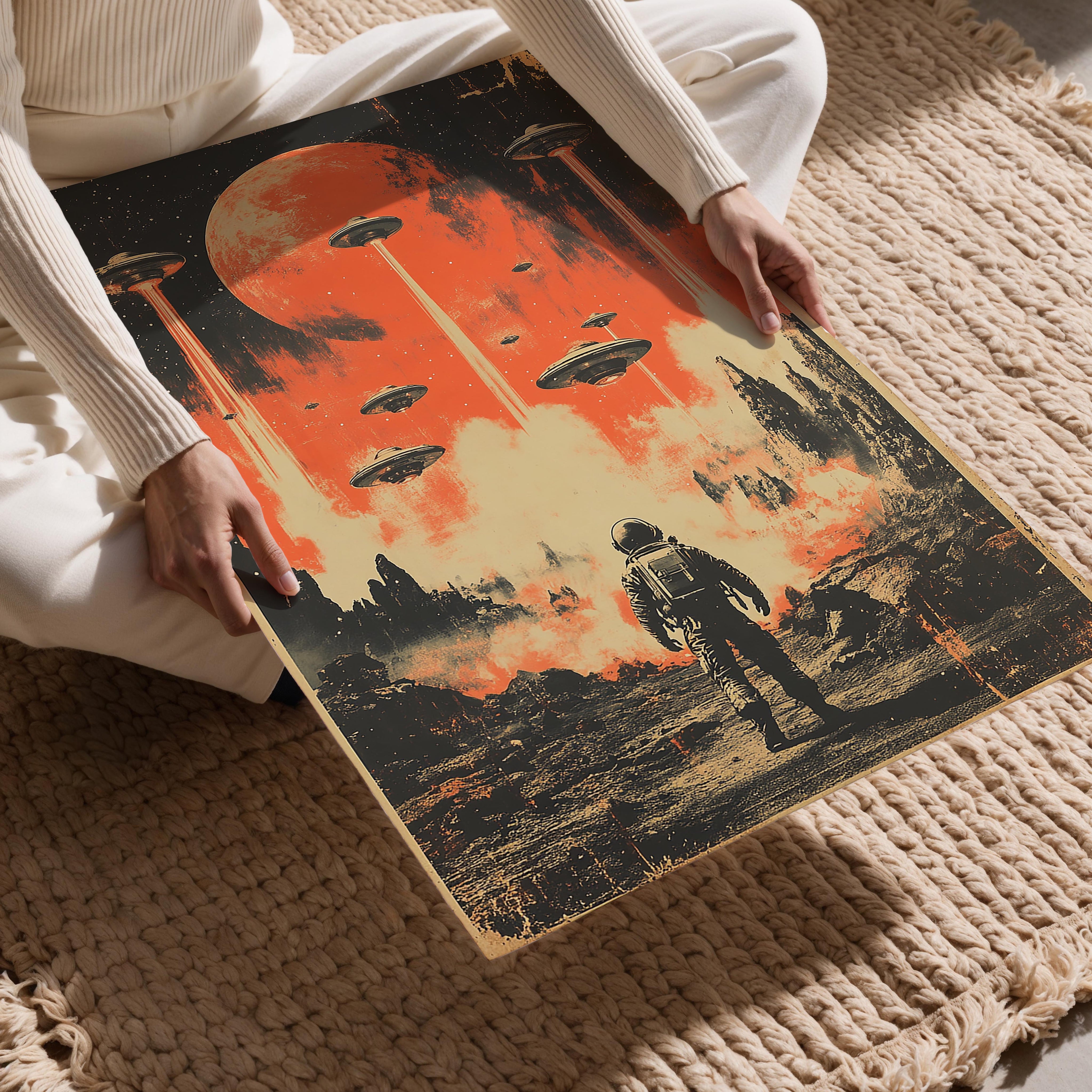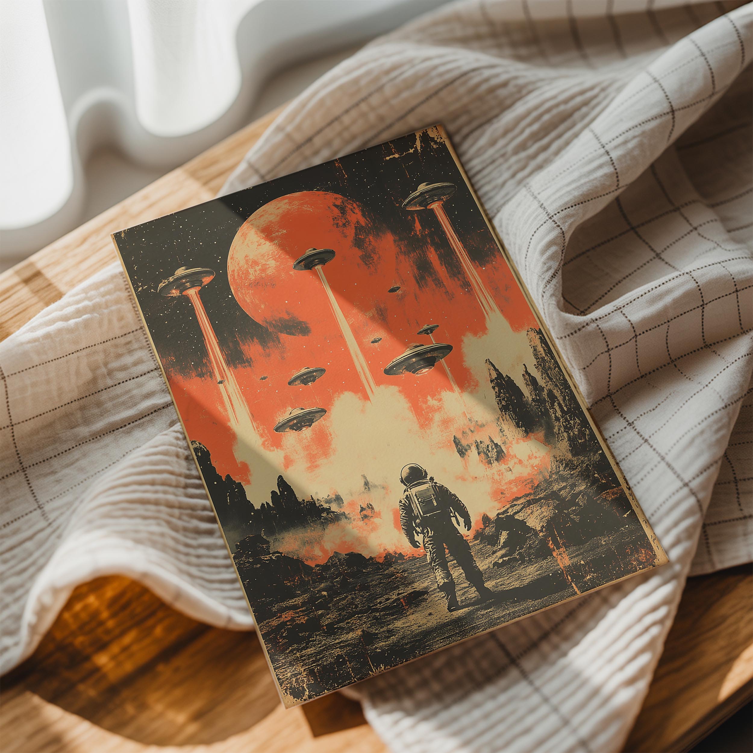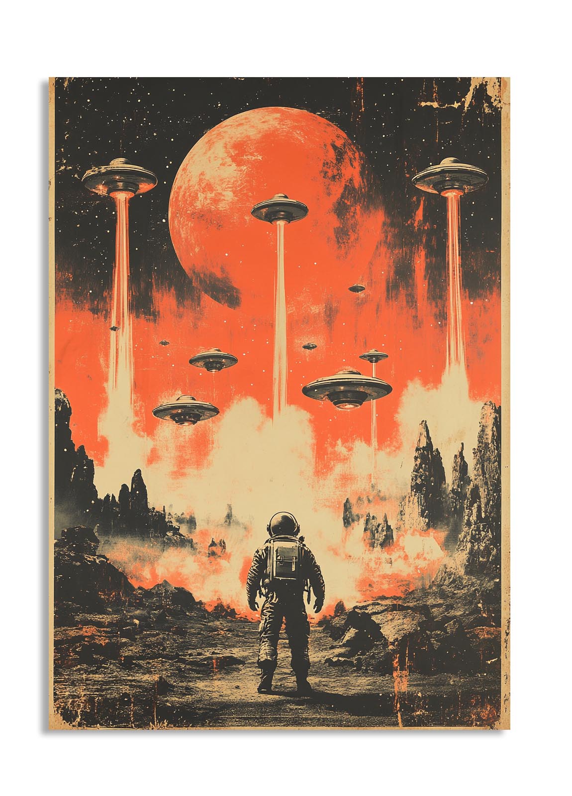 A retro sci-fi scene showing an astronaut standing on a barren, alien world as UFOs descend ominously from the sky. The oversized, glowing red planet in the background adds a sense of vastness and mystery. The eerie light from the spaceships gives the piece a cinematic, otherworldly glow. The rough, aged texture gives it a mid-century pulp magazine aesthetic, making it a great fit for sci-fi enthusiasts or collectors of retro space art. This piece would work well in a media room, a sci-fi-themed café, or as a statement piece in a modern space.