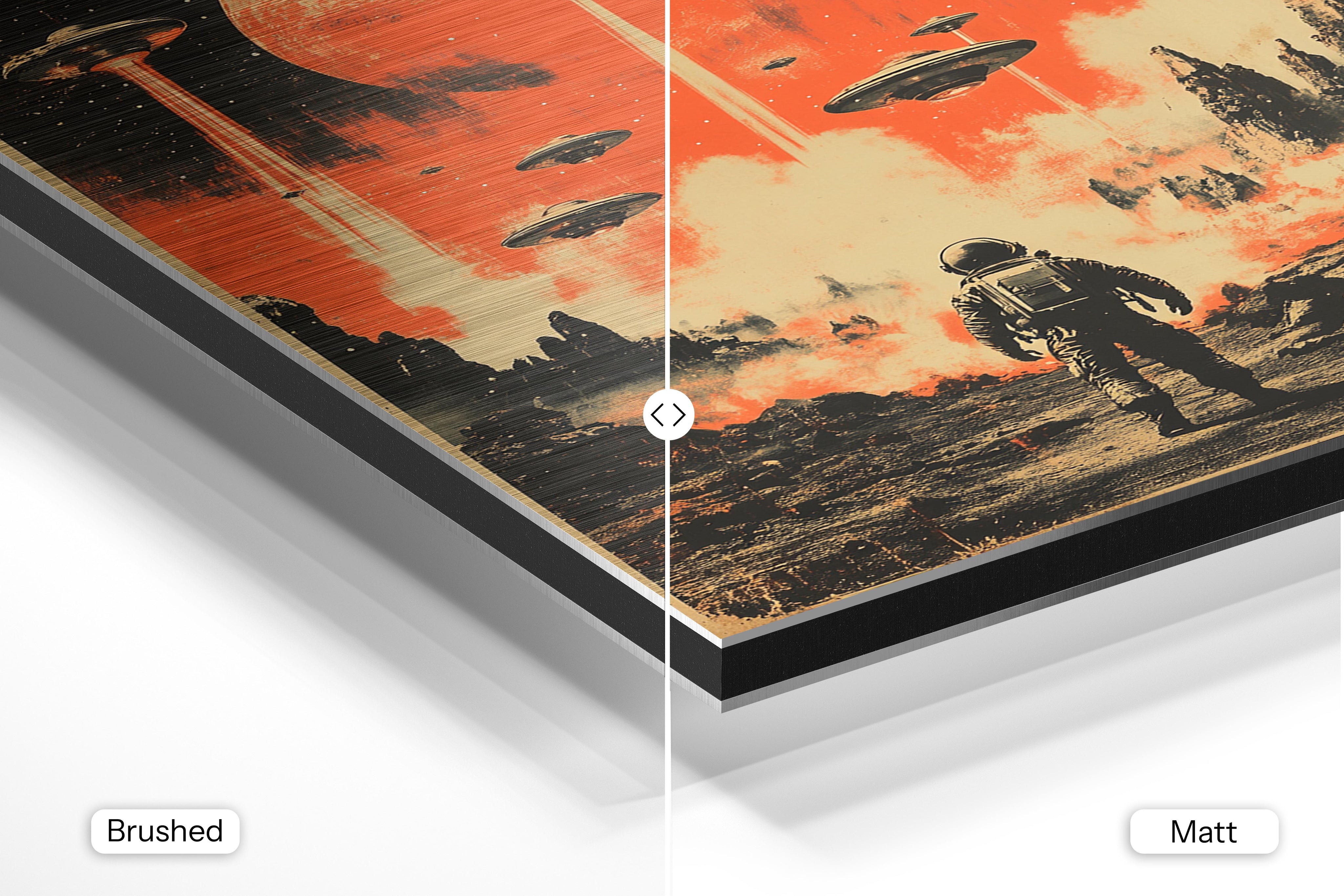 - Brushed Aluminum, on the other hand, features a raw metallic texture with visible brush strokes. Whites and highlights in your image let the silver surface show through, adding a dramatic, shimmering effect. Ideal for black-and-white images, minimalist designs, or abstract art, it creates a bold, industrial vibe with a modern edge.