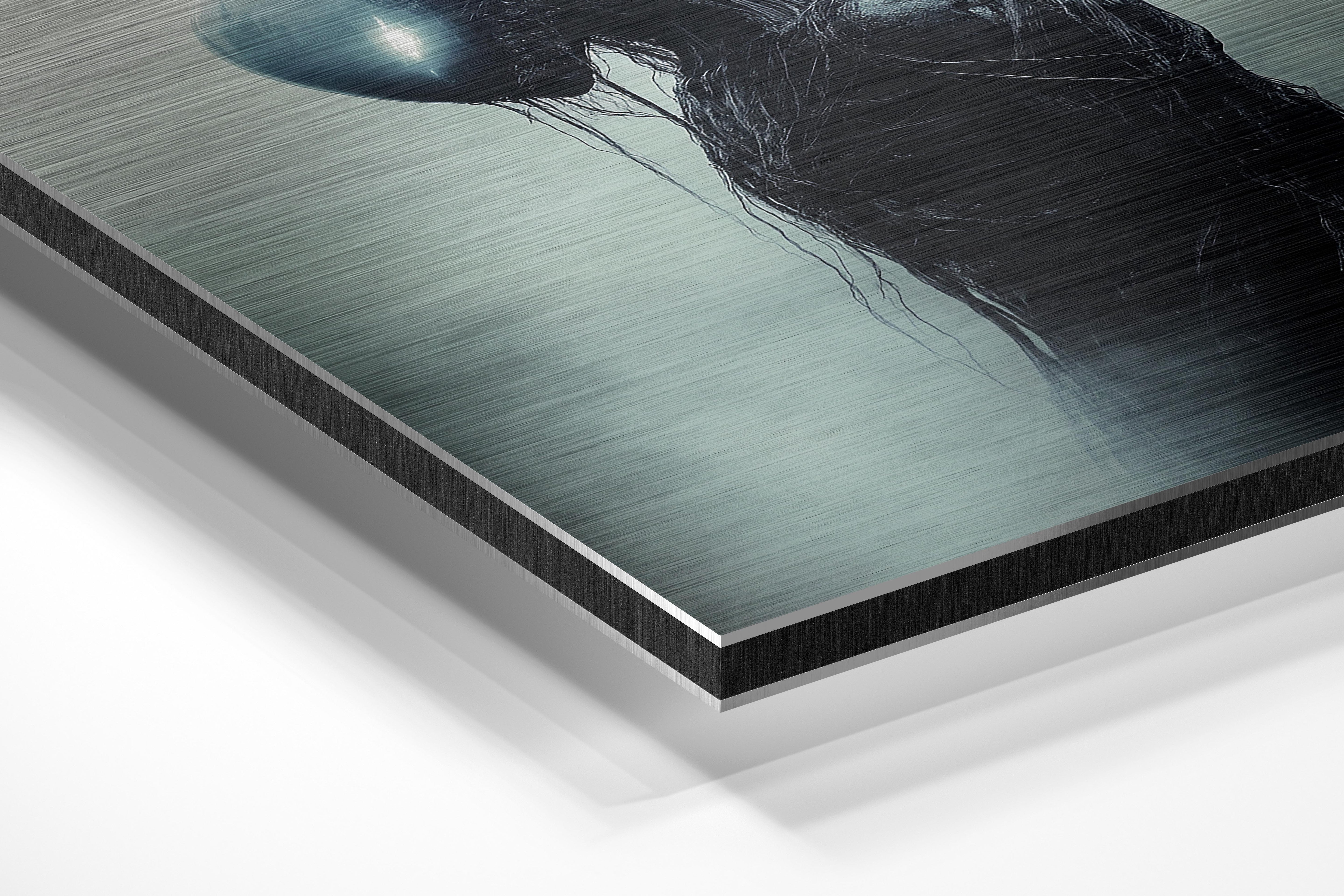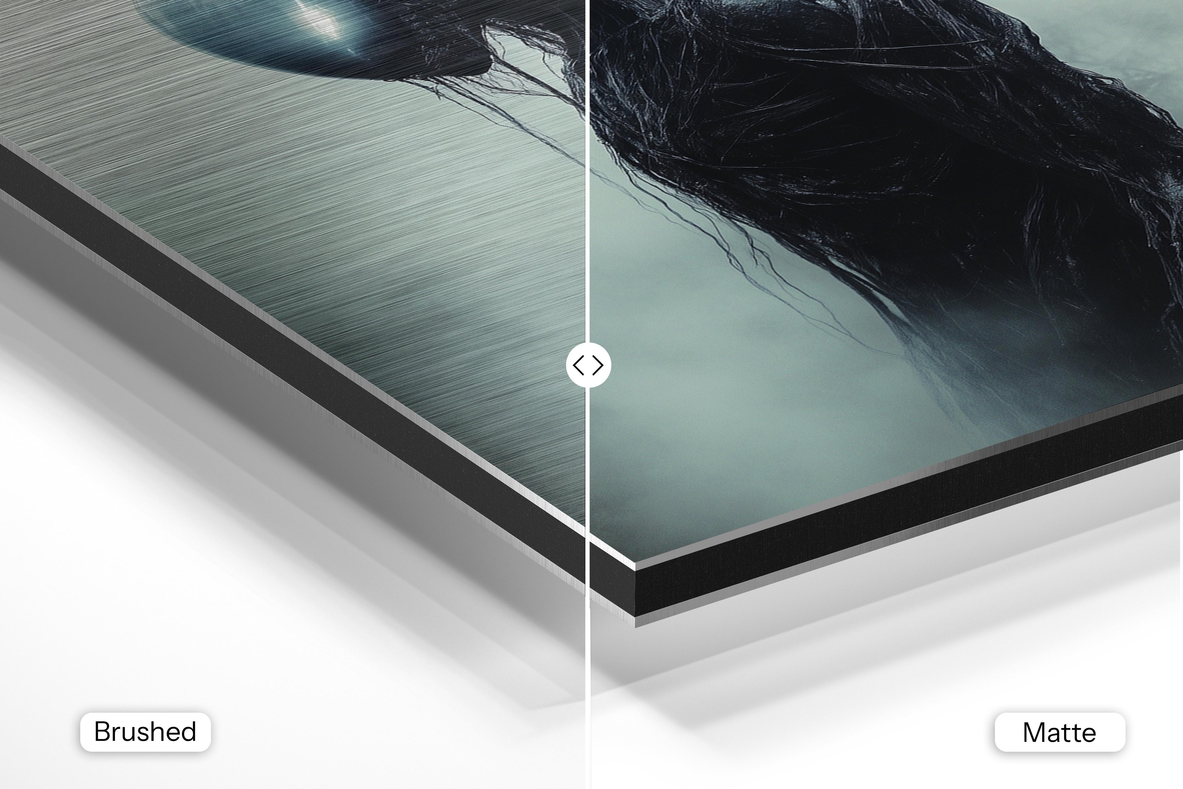 - Brushed Aluminum, on the other hand, features a raw metallic texture with visible brush strokes. Whites and highlights in your image let the silver surface show through, adding a dramatic, shimmering effect. Ideal for black-and-white images, minimalist designs, or abstract art, it creates a bold, industrial vibe with a modern edge.