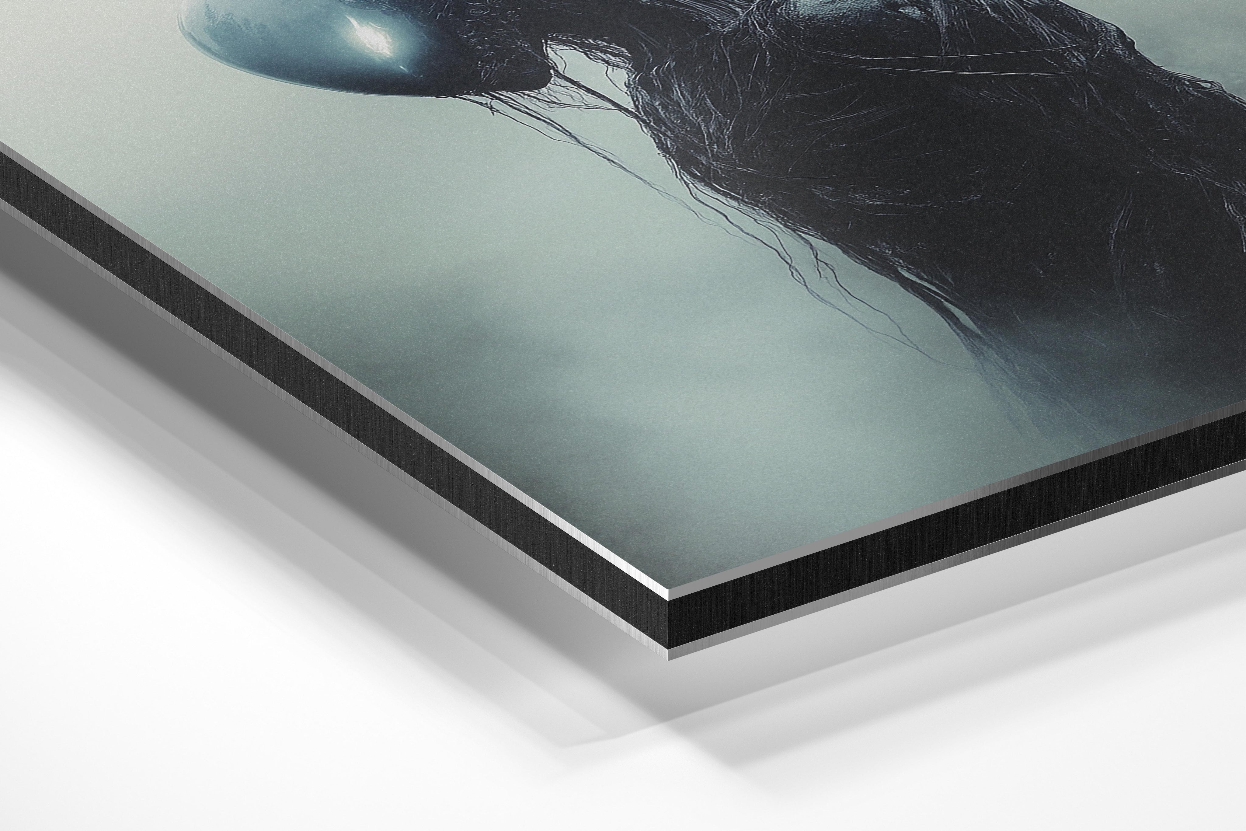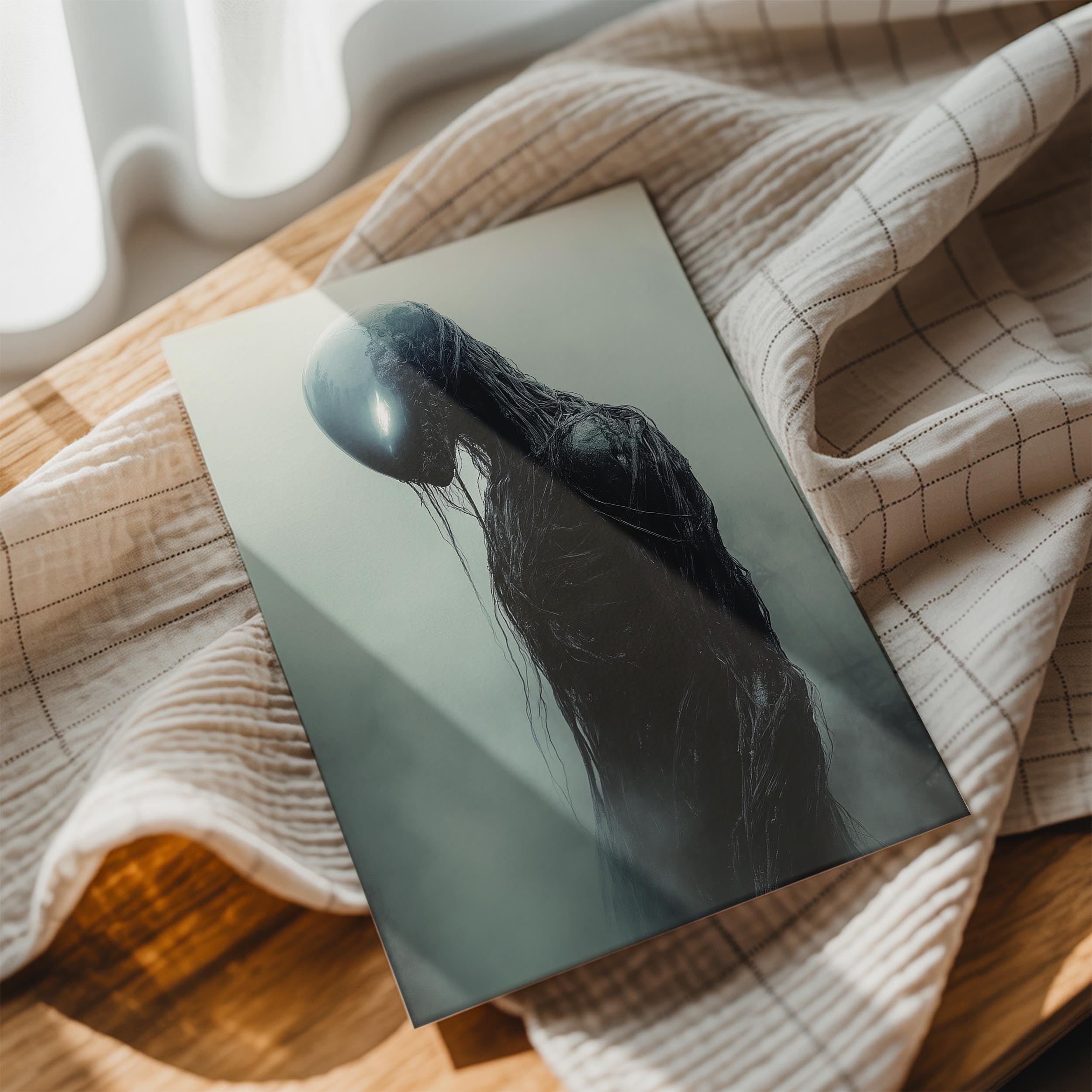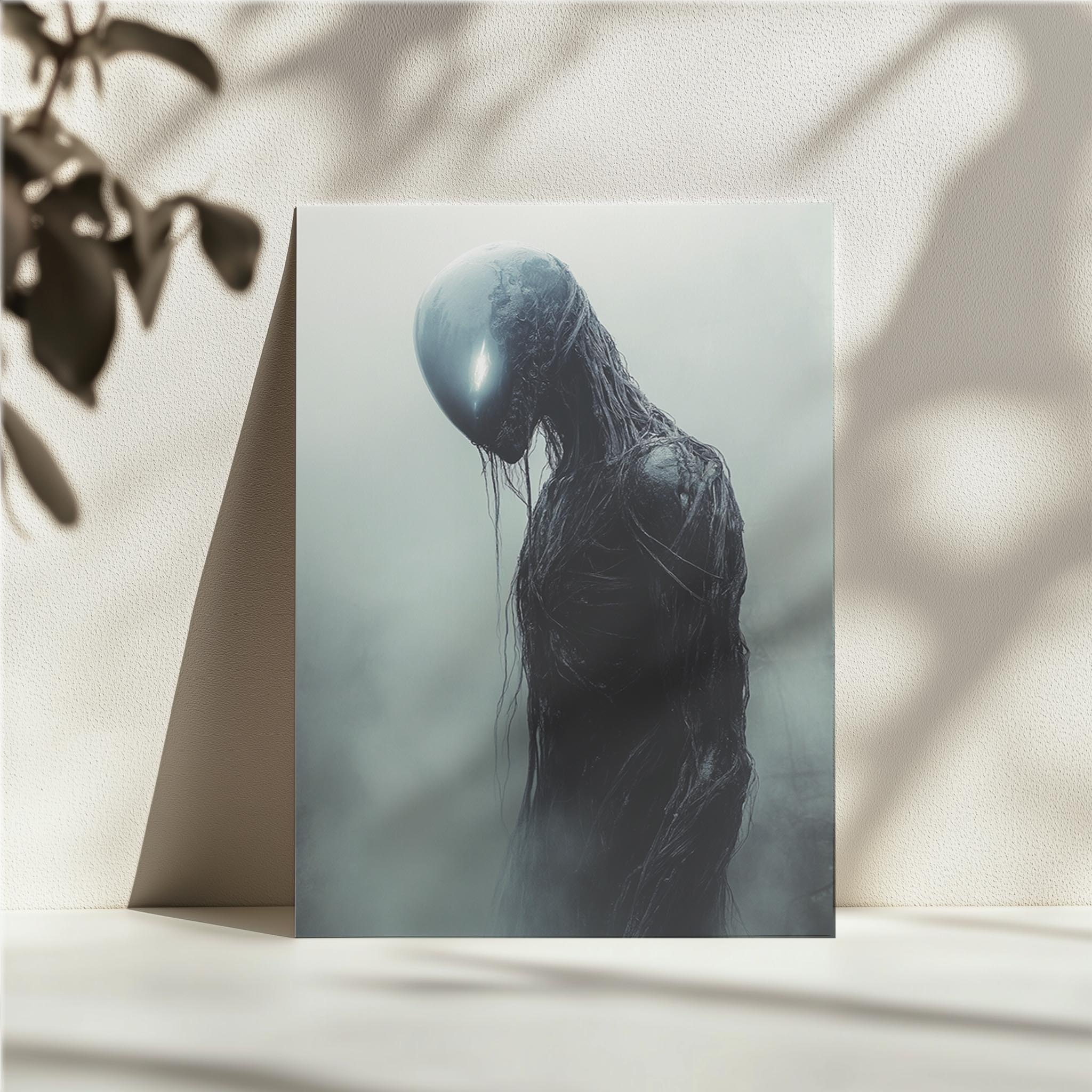 This haunting artwork depicts a tall, slender alien figure shrouded in mist. The dark, textured body contrasts starkly with the smooth, reflective helmet, creating a captivating sense of mystery. Ideal for fans of sci-fi or those seeking atmospheric art, this piece fits perfectly in modern or edgy interiors, adding intrigue and depth to the space.