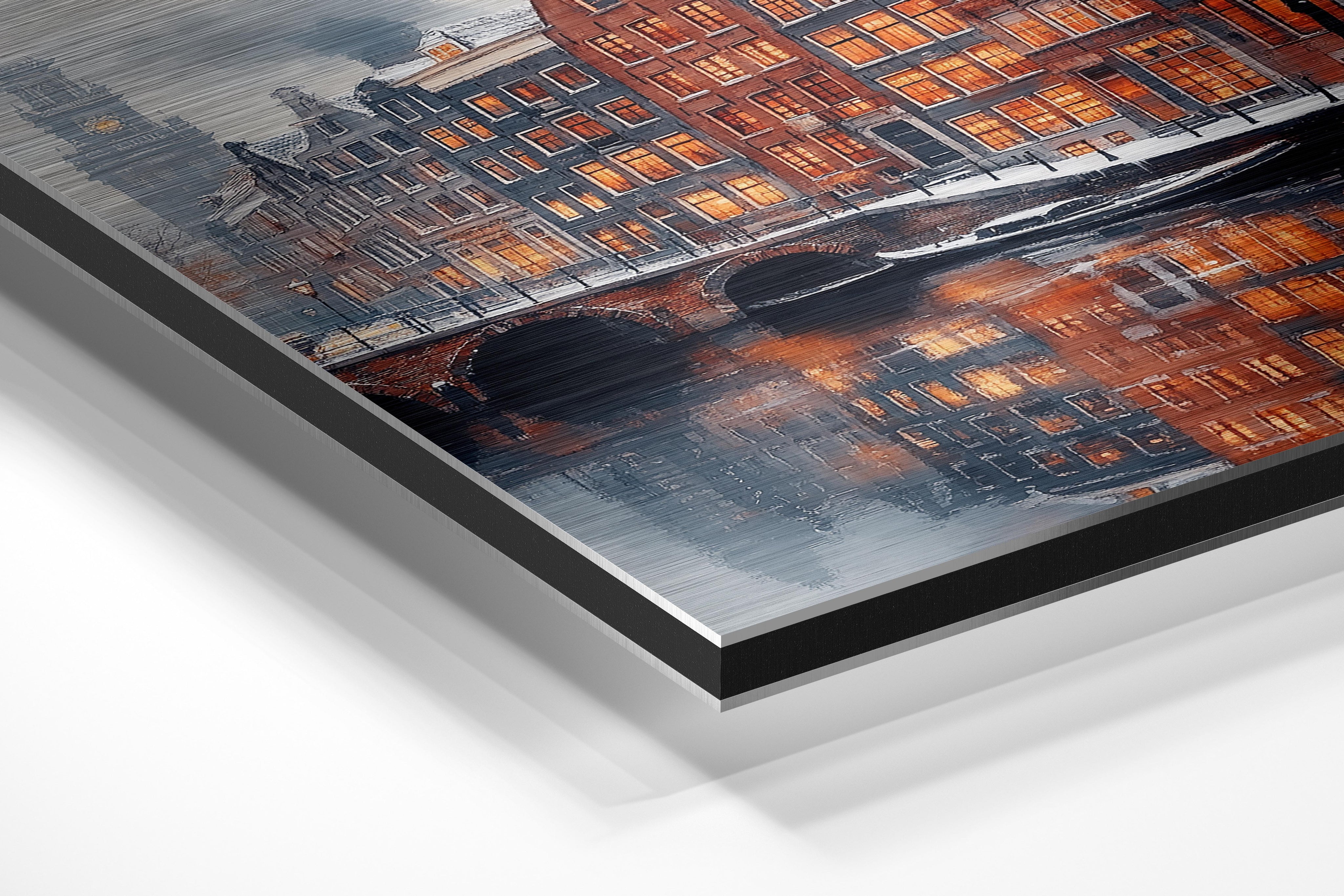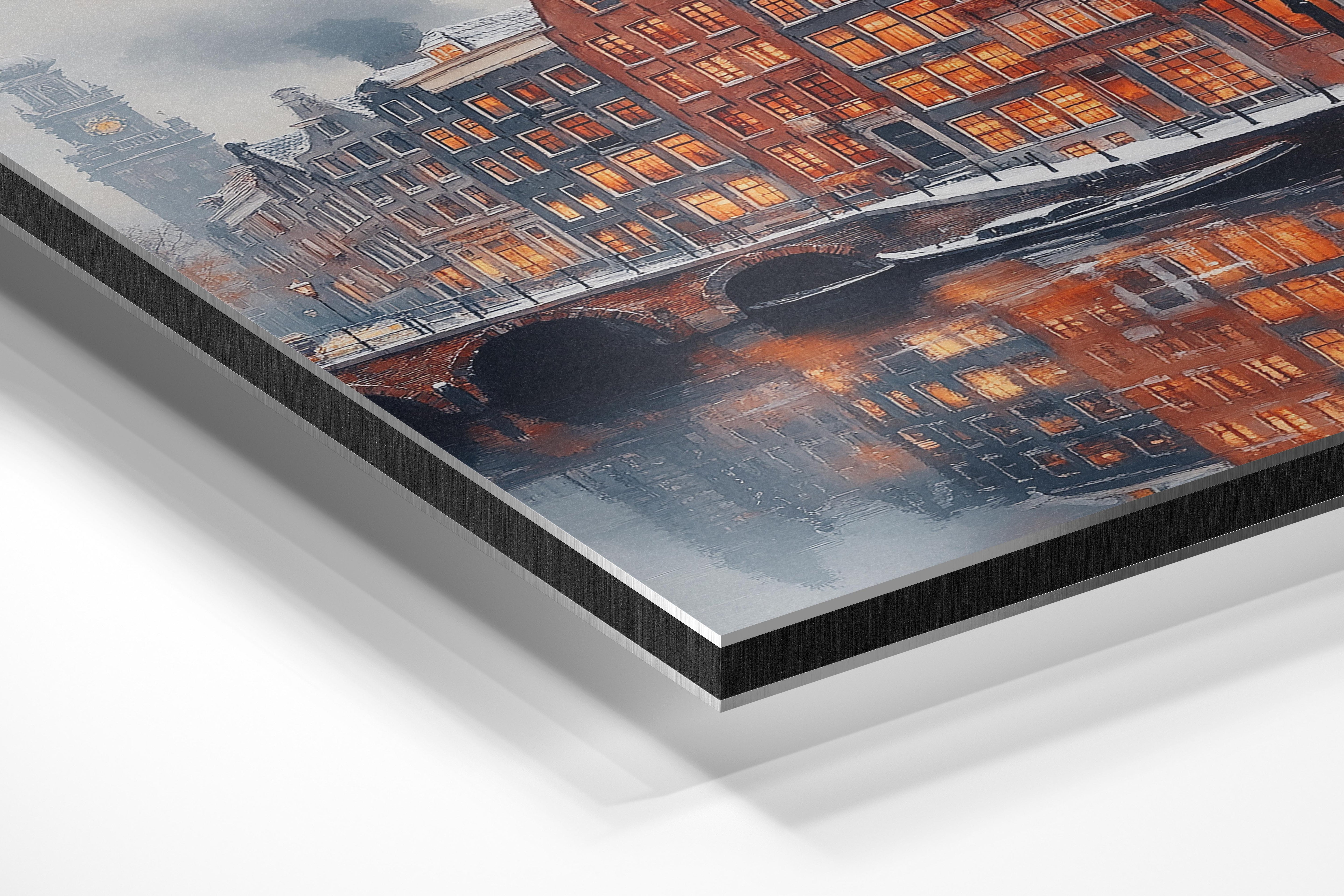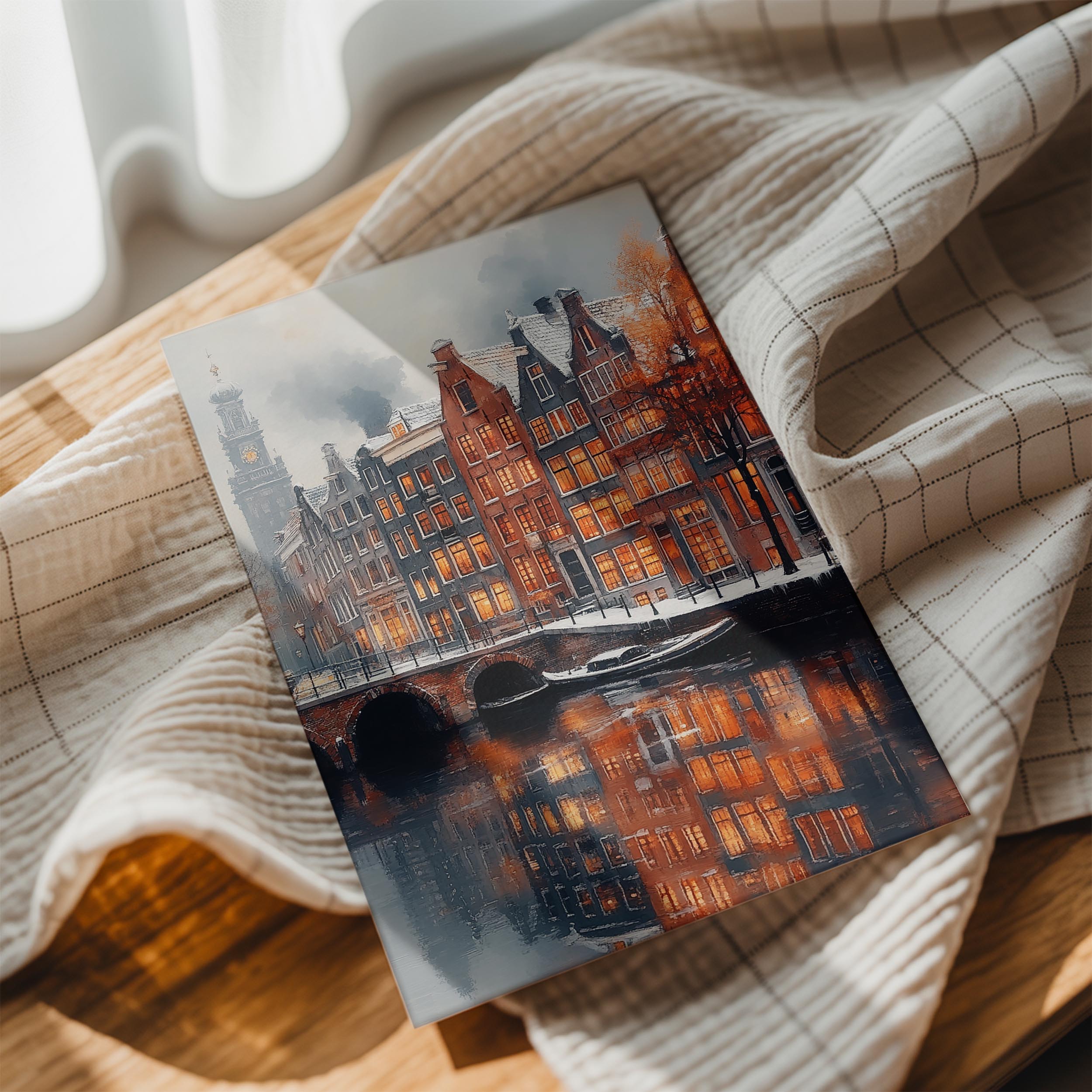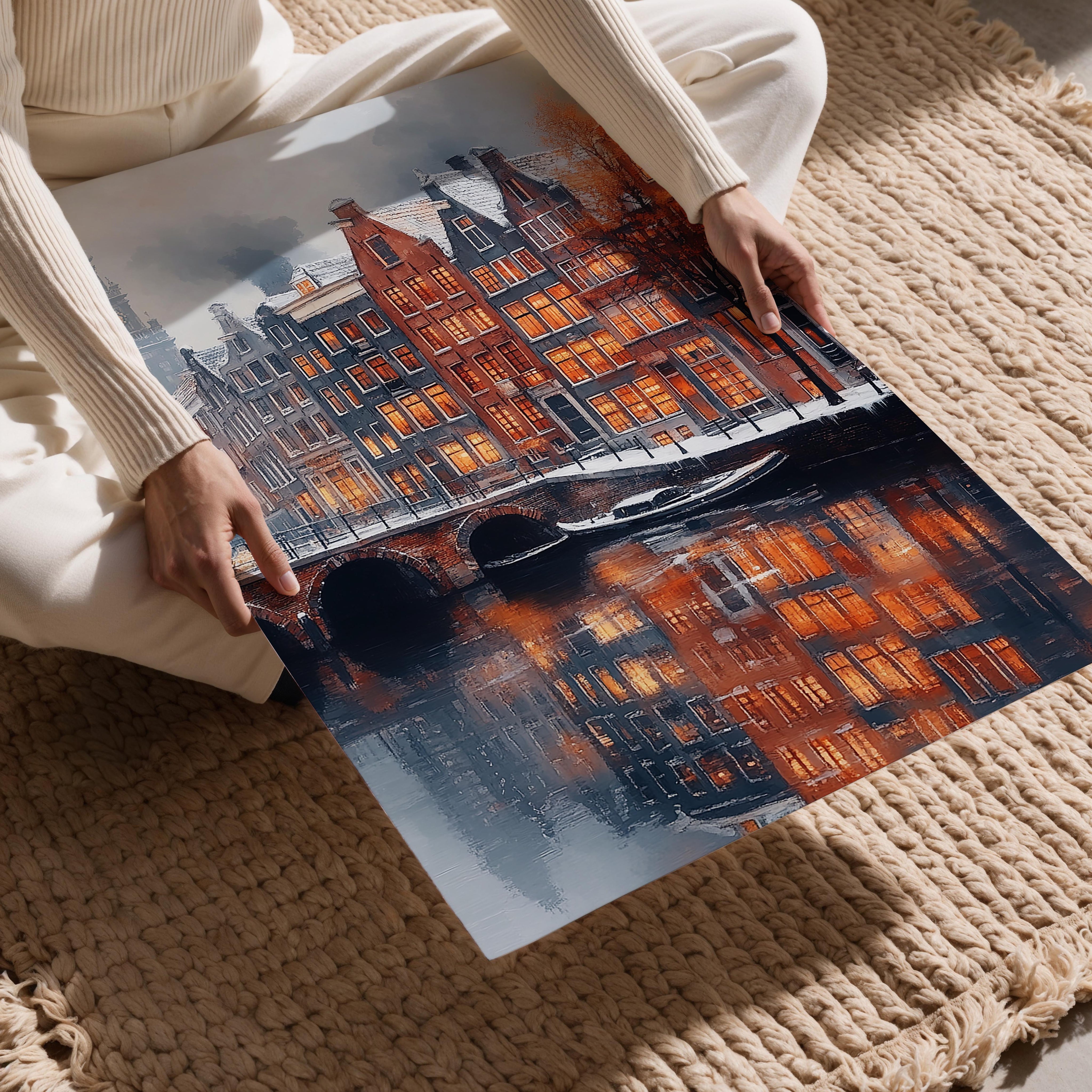A captivating scene of Amsterdam at dusk, this image highlights the warm glow emanating from the canal houses as lights reflect in the water below. The snow-dusted rooftops and orange-tinged trees add a touch of seasonal magic, while the bridge and iconic architecture evoke a timeless charm. Perfect for cozy interiors, this piece brings warmth and nostalgia, making it an ideal addition to any room looking to showcase urban beauty with a festive feel.