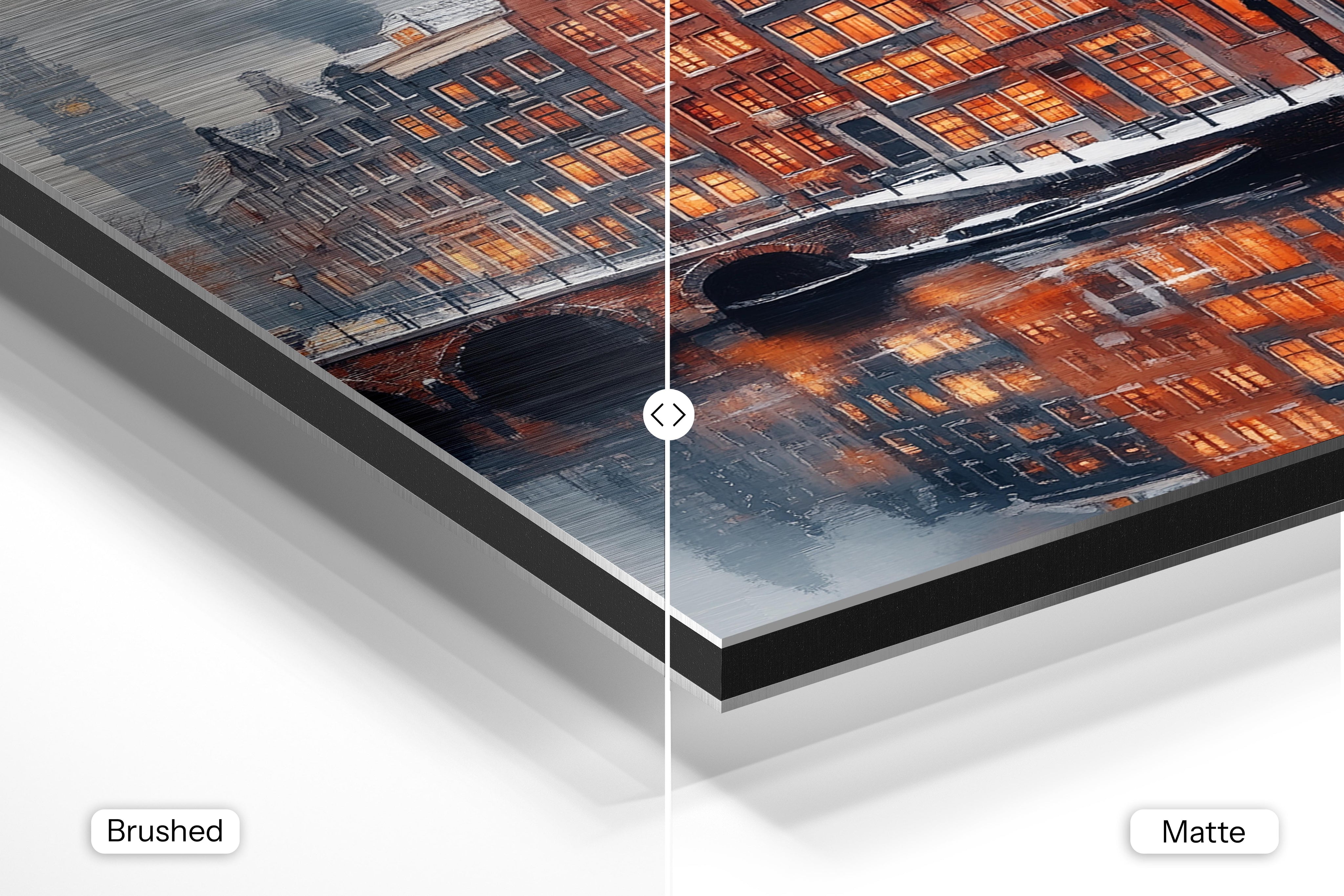 - Brushed Aluminum, on the other hand, features a raw metallic texture with visible brush strokes. Whites and highlights in your image let the silver surface show through, adding a dramatic, shimmering effect. Ideal for black-and-white images, minimalist designs, or abstract art, it creates a bold, industrial vibe with a modern edge.