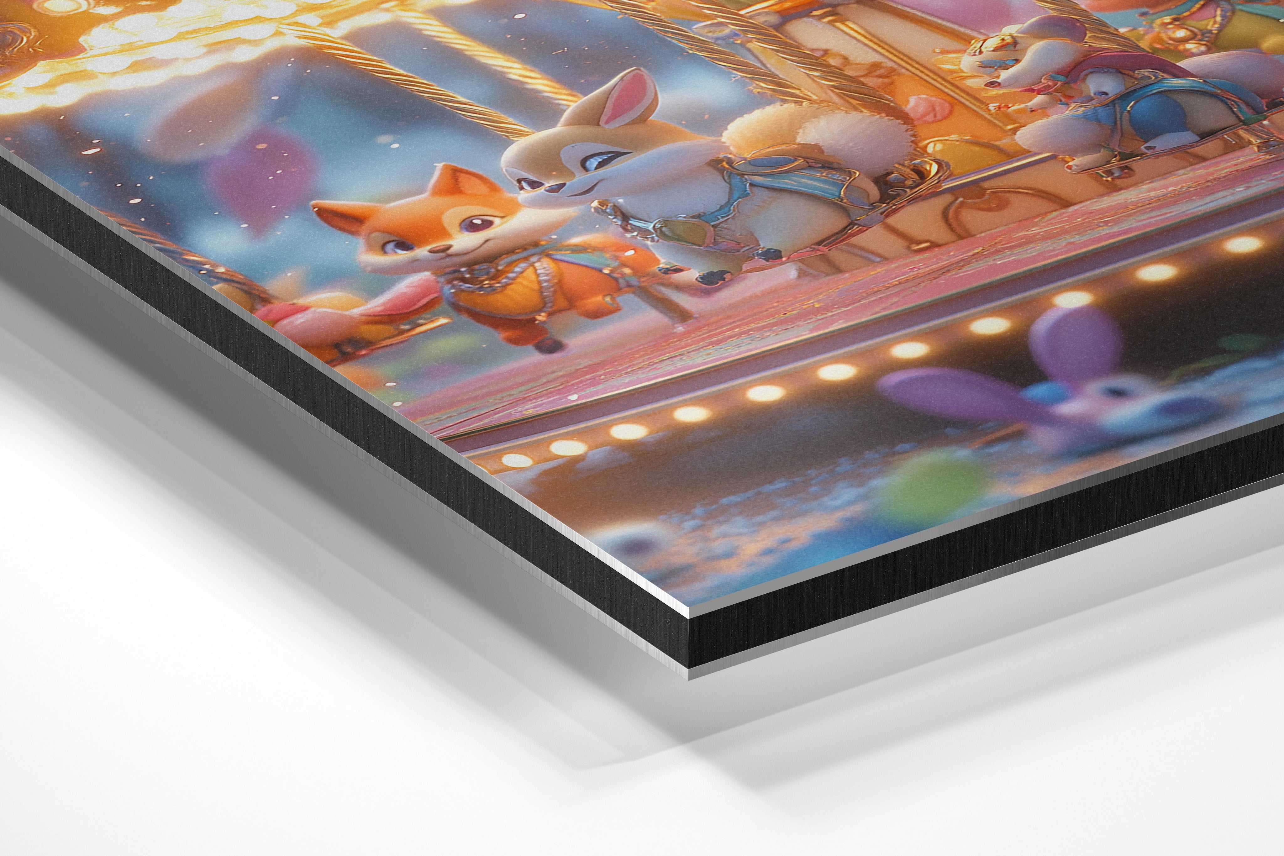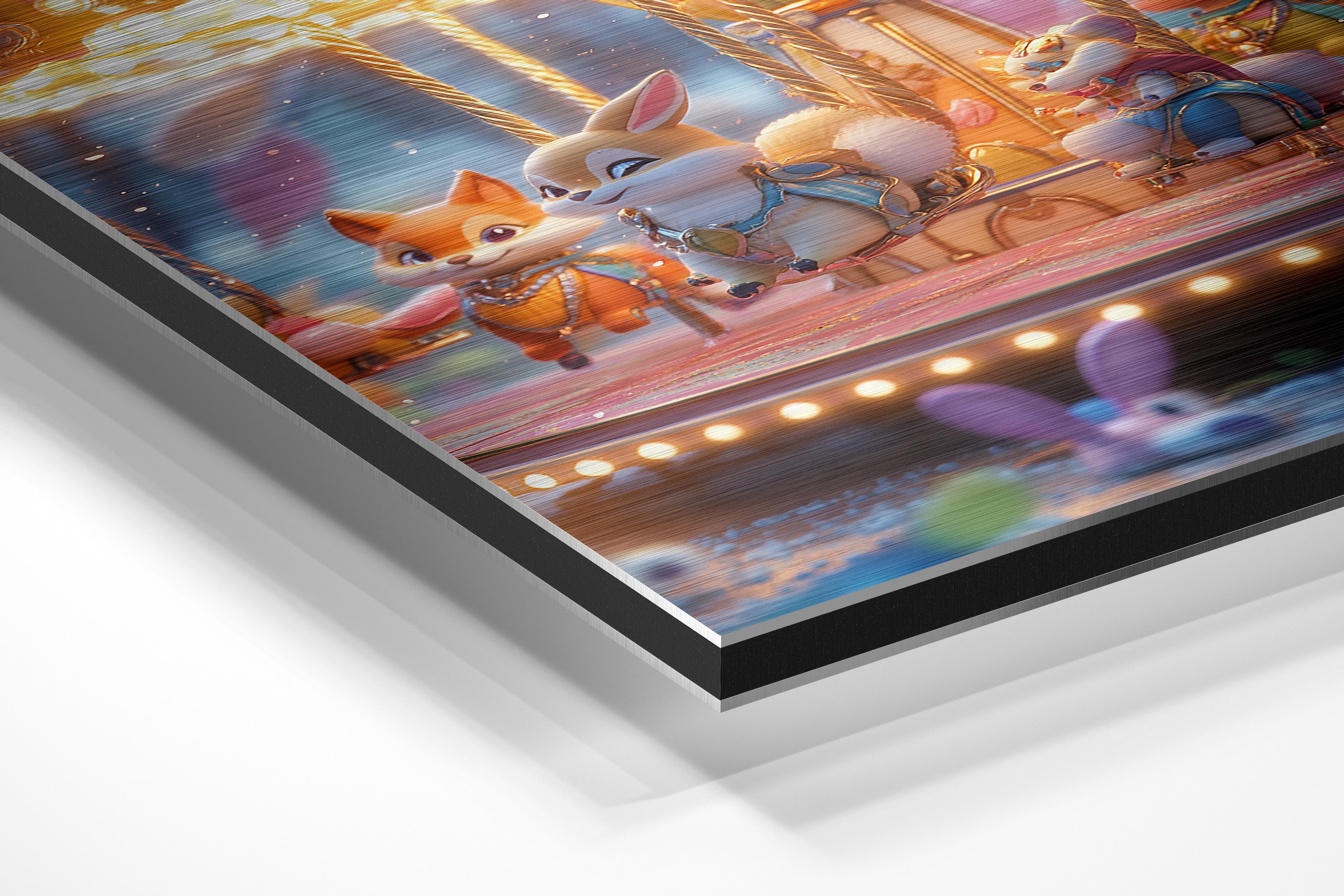 An enchanting depiction of an animal carousel bathed in a warm, golden glow. Each carousel animal, from foxes to squirrels, is adorned with ornate details, making them the highlight of the piece. The surrounding lights twinkle, enhancing the festive atmosphere. Perfect for children’s rooms or spaces needing a touch of whimsy, this artwork exudes nostalgia and joy. The attention to detail, from the ornate carousel platform to the cheerful expressions of the animals, ensures it captivates viewers of all ages. It’s a delightful celebration of childhood wonder and imagination.