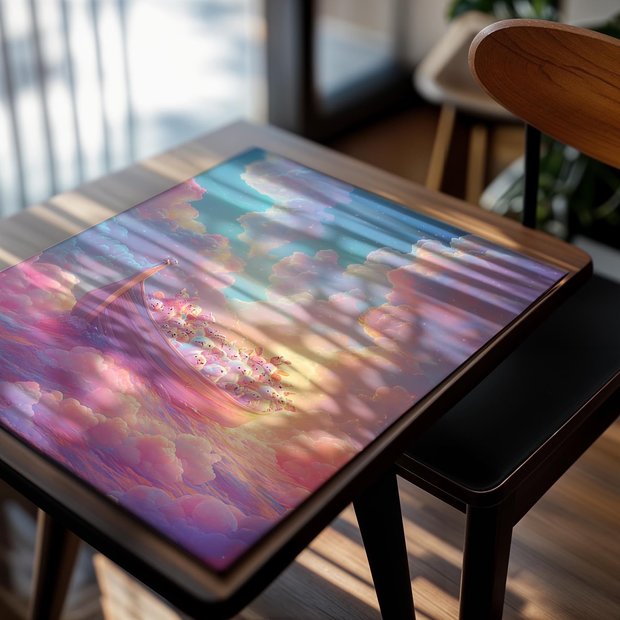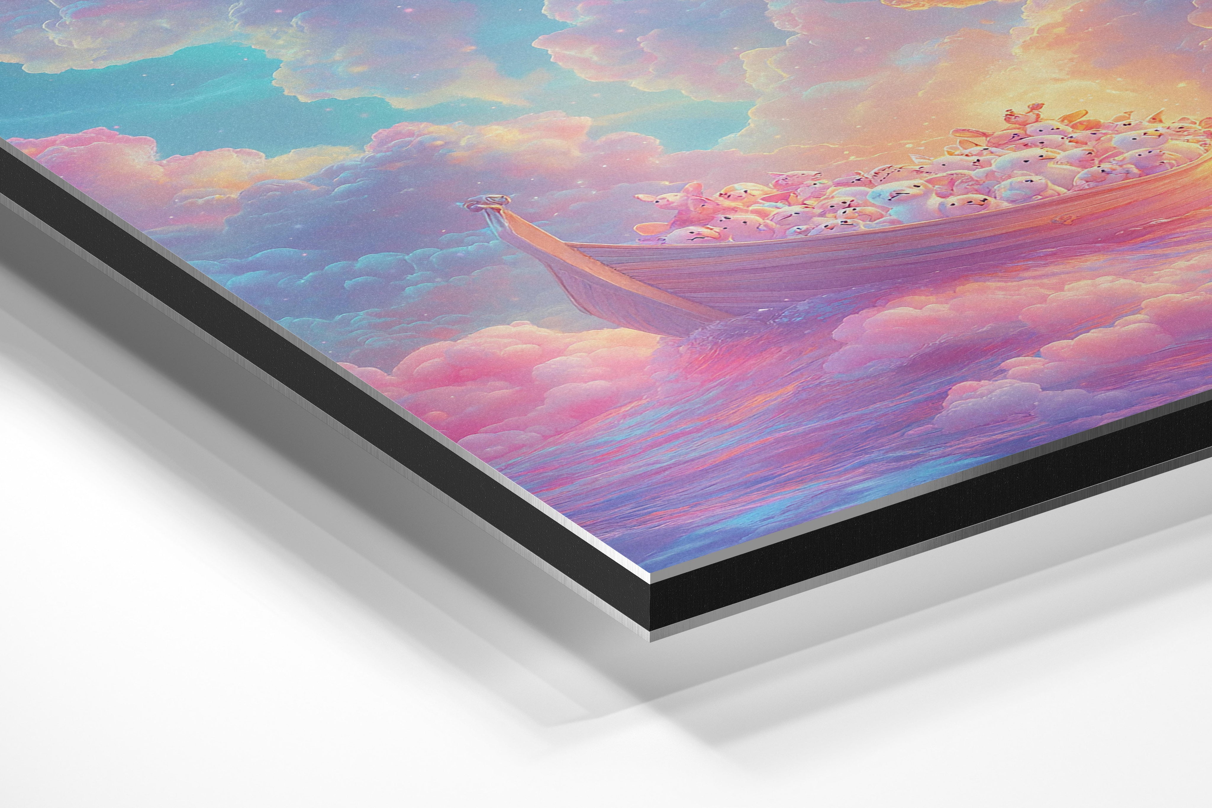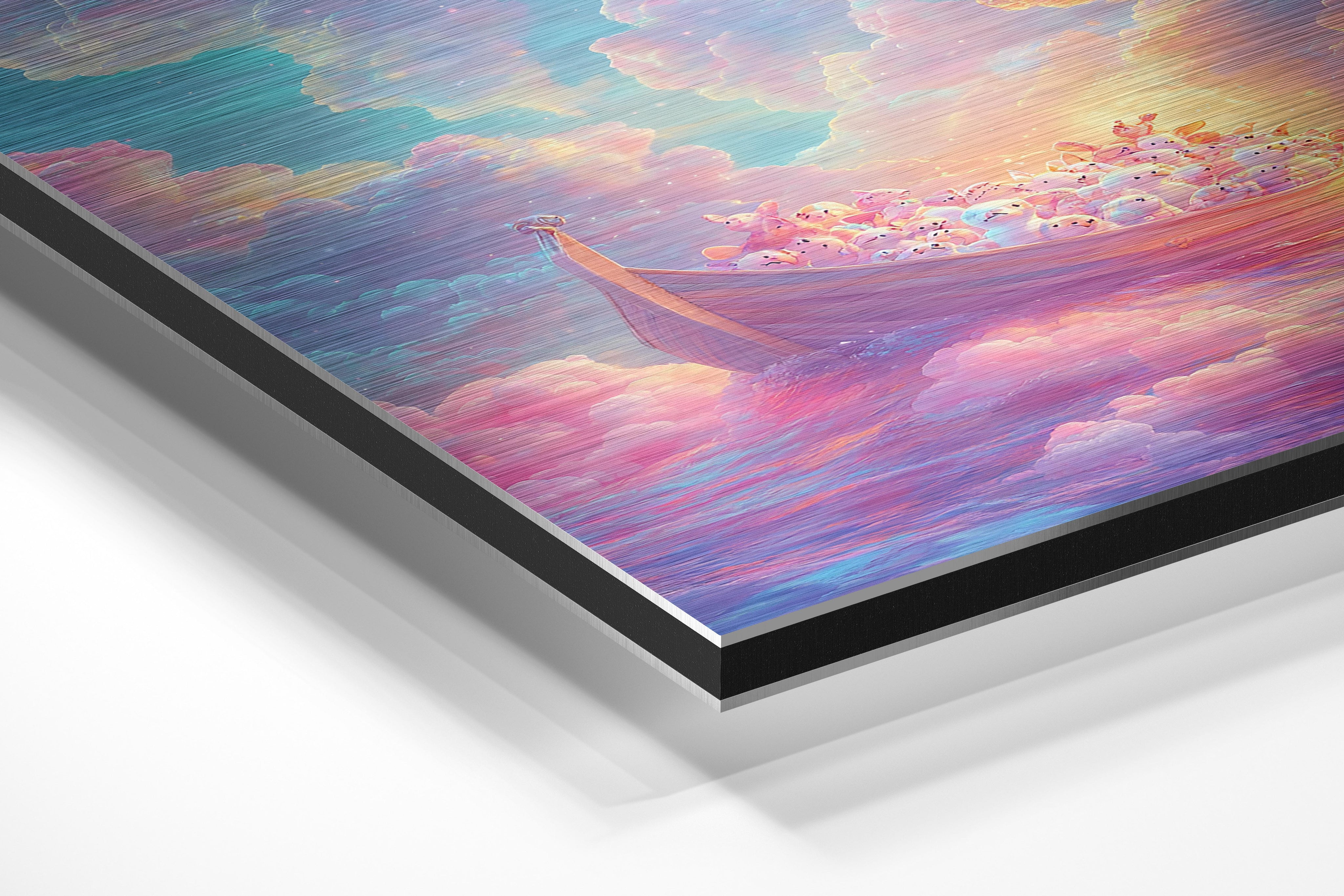 Set in a dreamy, ethereal world, this artwork depicts an adorable assortment of animals sailing in a wooden boat through fluffy pastel clouds. Radiant sunlight bathes the scene in a magical glow, highlighting the joy and adventure of the journey. The vibrant palette of pinks, blues, and golds enhances the whimsical atmosphere, drawing viewers into its fantastical realm. Ideal for children's rooms, this piece inspires creativity and wonder, offering a sense of lightheartedness and imagination. It’s a must-have for fans of playful and surreal designs.