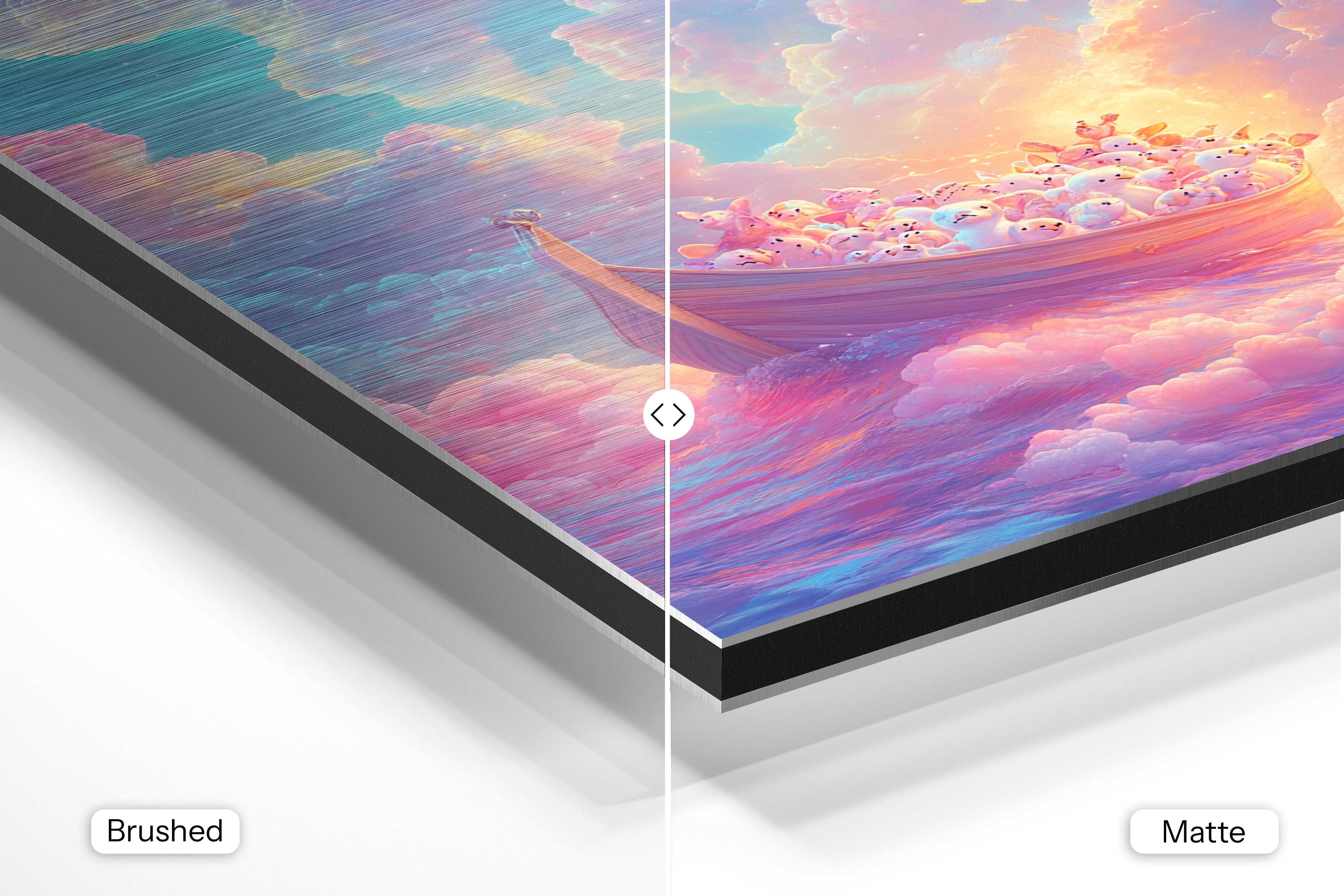 - Brushed Aluminum, on the other hand, features a raw metallic texture with visible brush strokes. Whites and highlights in your image let the silver surface show through, adding a dramatic, shimmering effect. Ideal for black-and-white images, minimalist designs, or abstract art, it creates a bold, industrial vibe with a modern edge.