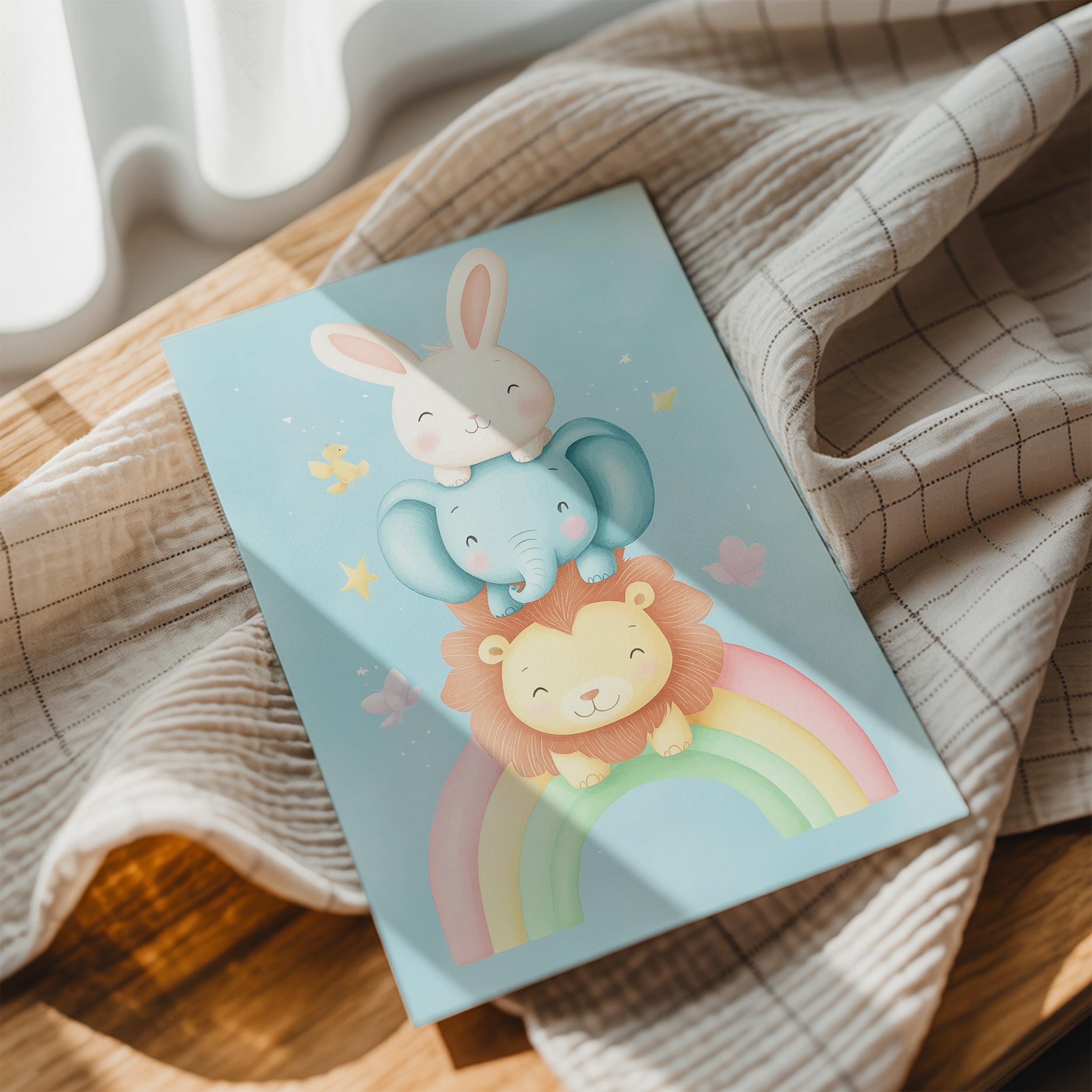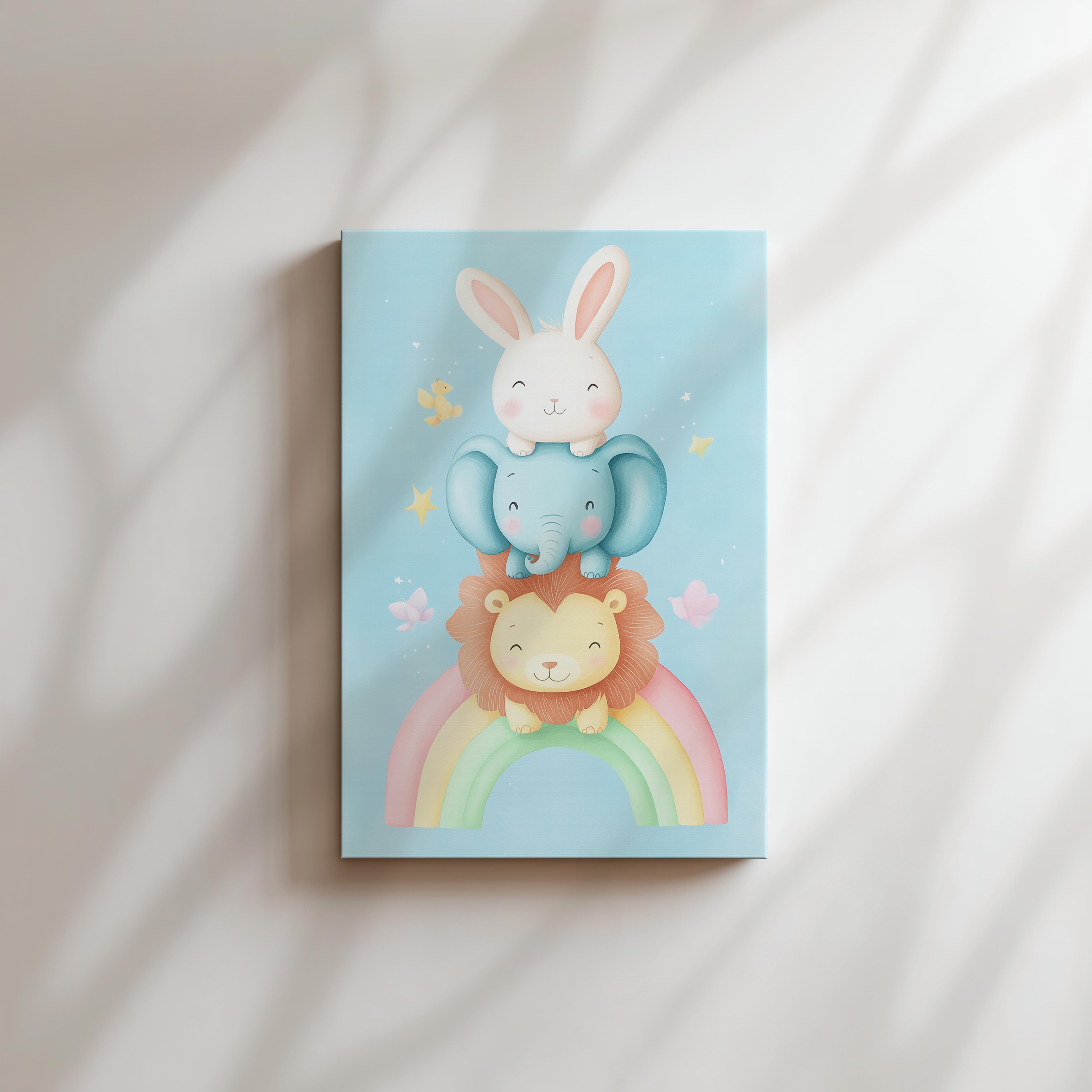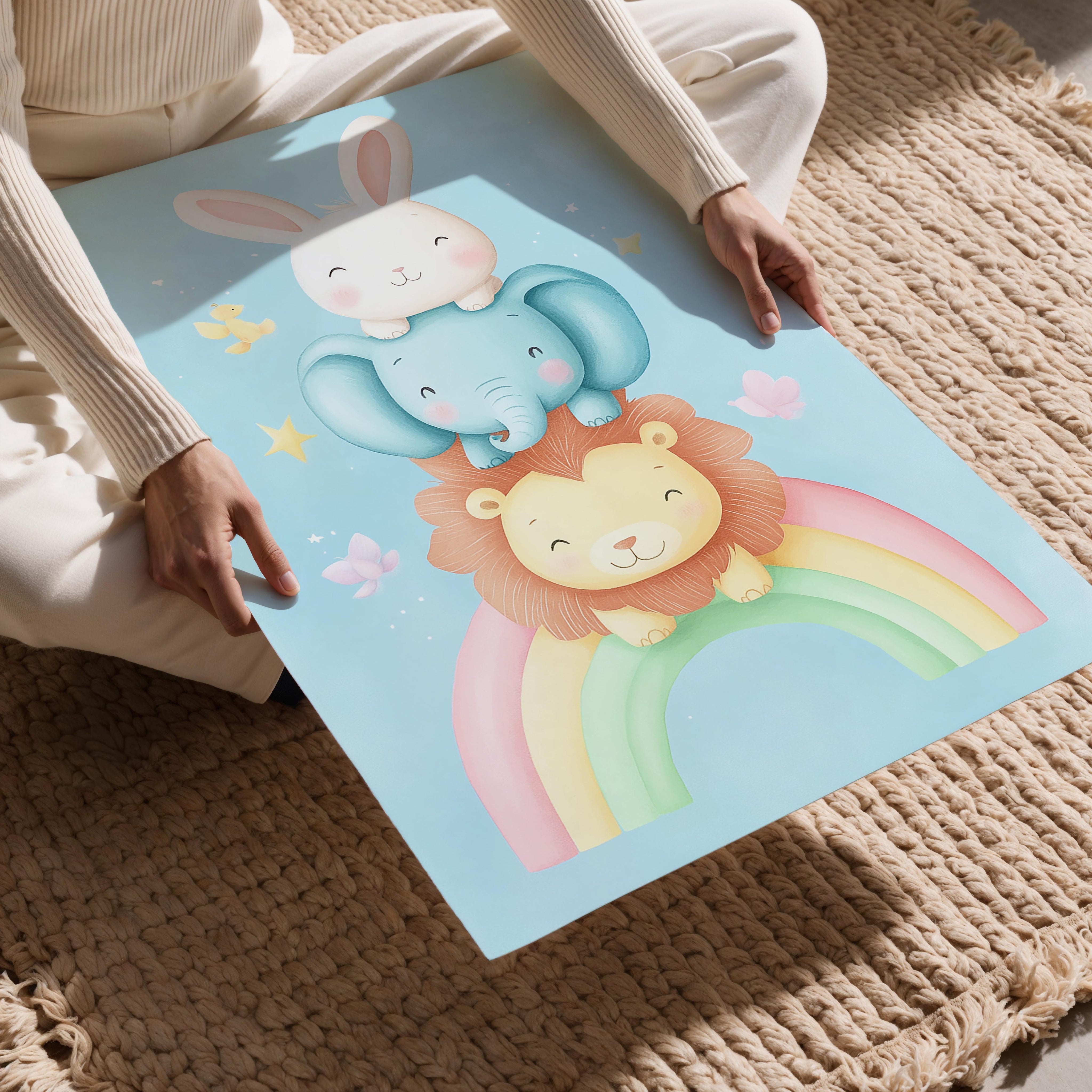A charming illustration of a rabbit, elephant, and lion stacked atop a rainbow, exuding softness and innocence. The delicate pastel colors and gentle expressions make this a heartwarming addition to nurseries or kid-friendly spaces. Stars and butterflies surrounding the animals enhance the magical quality, creating an enchanting ambiance. This artwork symbolizes harmony, happiness, and the beauty of nature, making it a delightful choice for any wall.