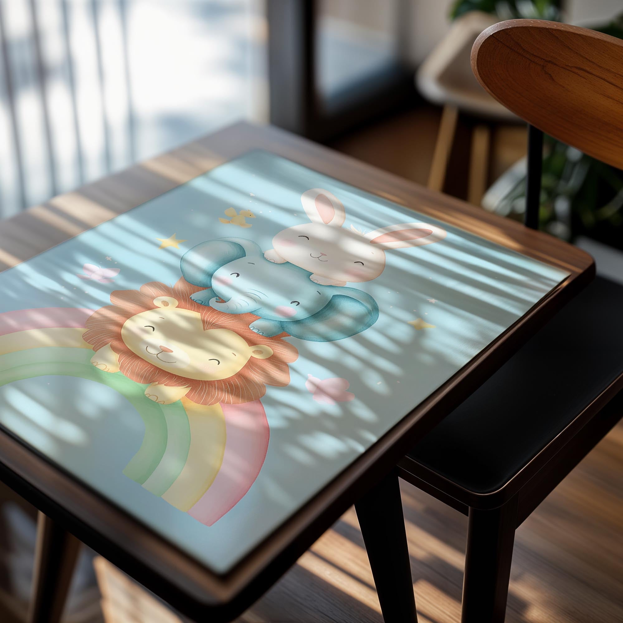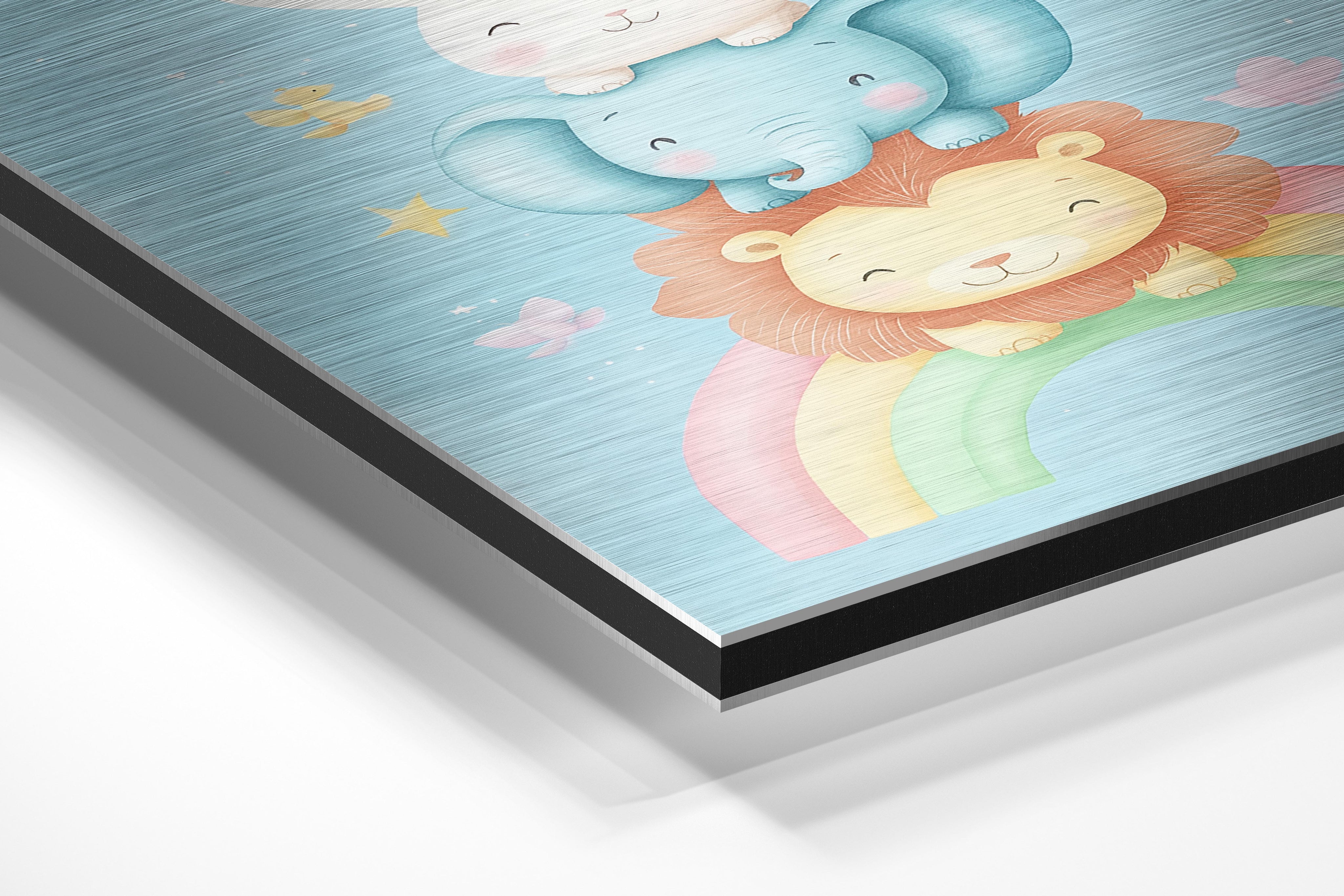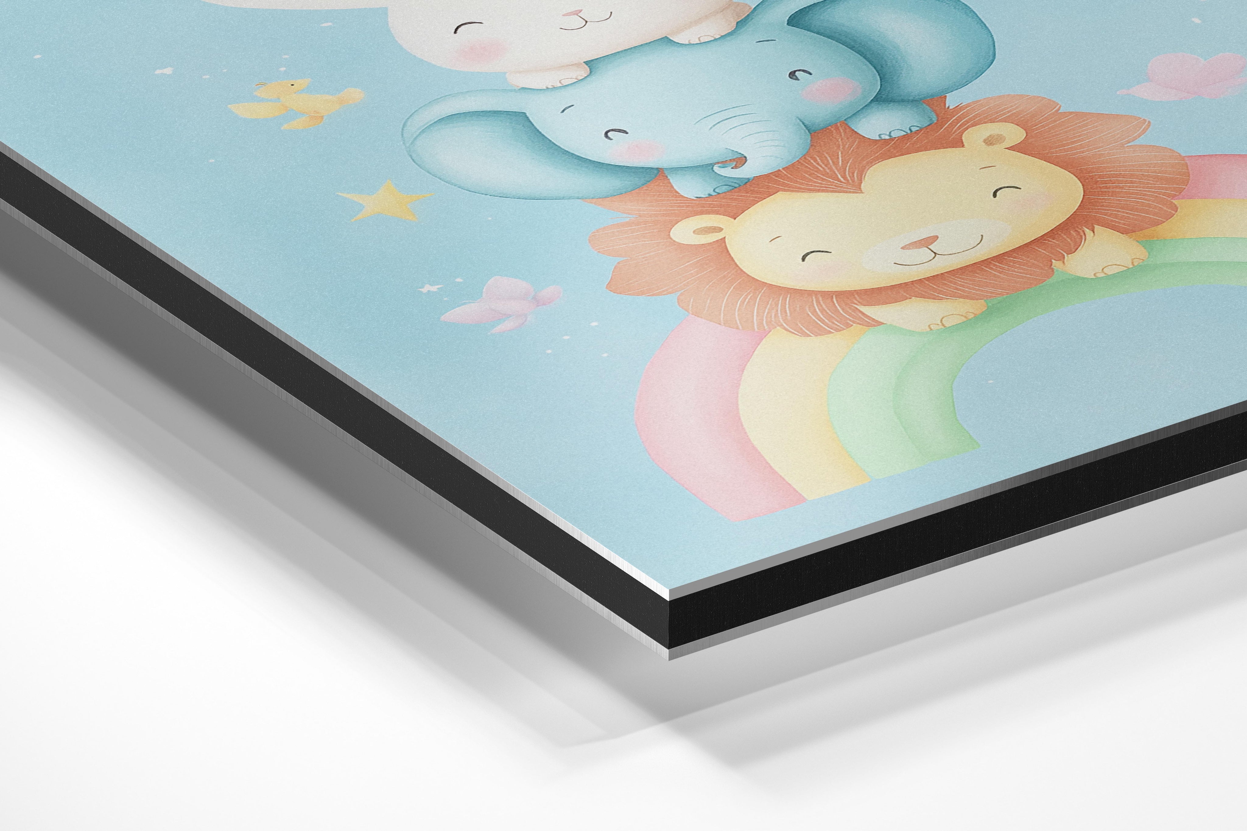 A charming illustration of a rabbit, elephant, and lion stacked atop a rainbow, exuding softness and innocence. The delicate pastel colors and gentle expressions make this a heartwarming addition to nurseries or kid-friendly spaces. Stars and butterflies surrounding the animals enhance the magical quality, creating an enchanting ambiance. This artwork symbolizes harmony, happiness, and the beauty of nature, making it a delightful choice for any wall.