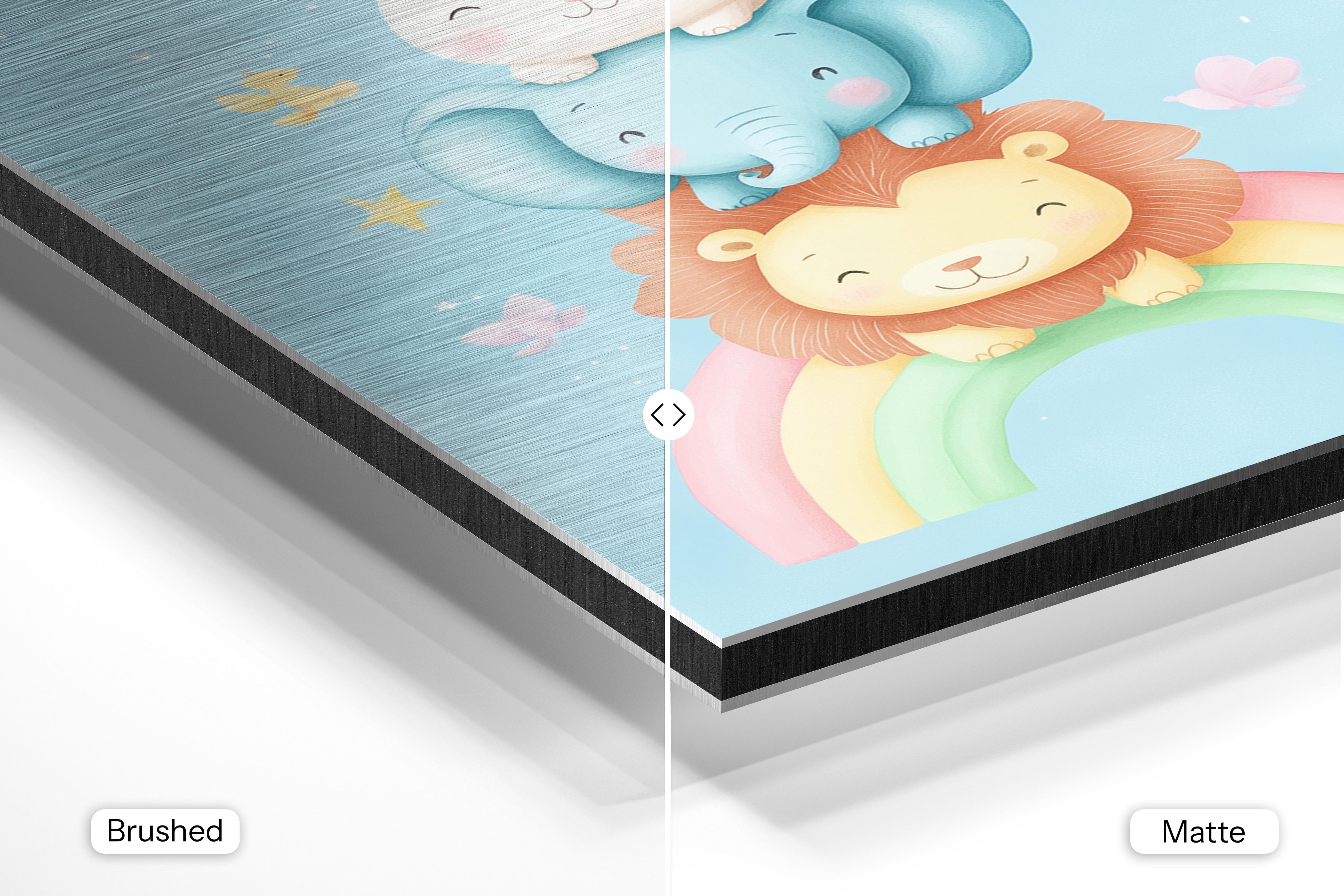 - Matte Aluminum offers a smooth, bright white surface that delivers crisp details and vibrant, true-to-life colors. With its non-reflective finish and subtle silky sheen, it’s perfect for photography, portraits, and colorful artwork—bringing a clean, polished look to any interior.
