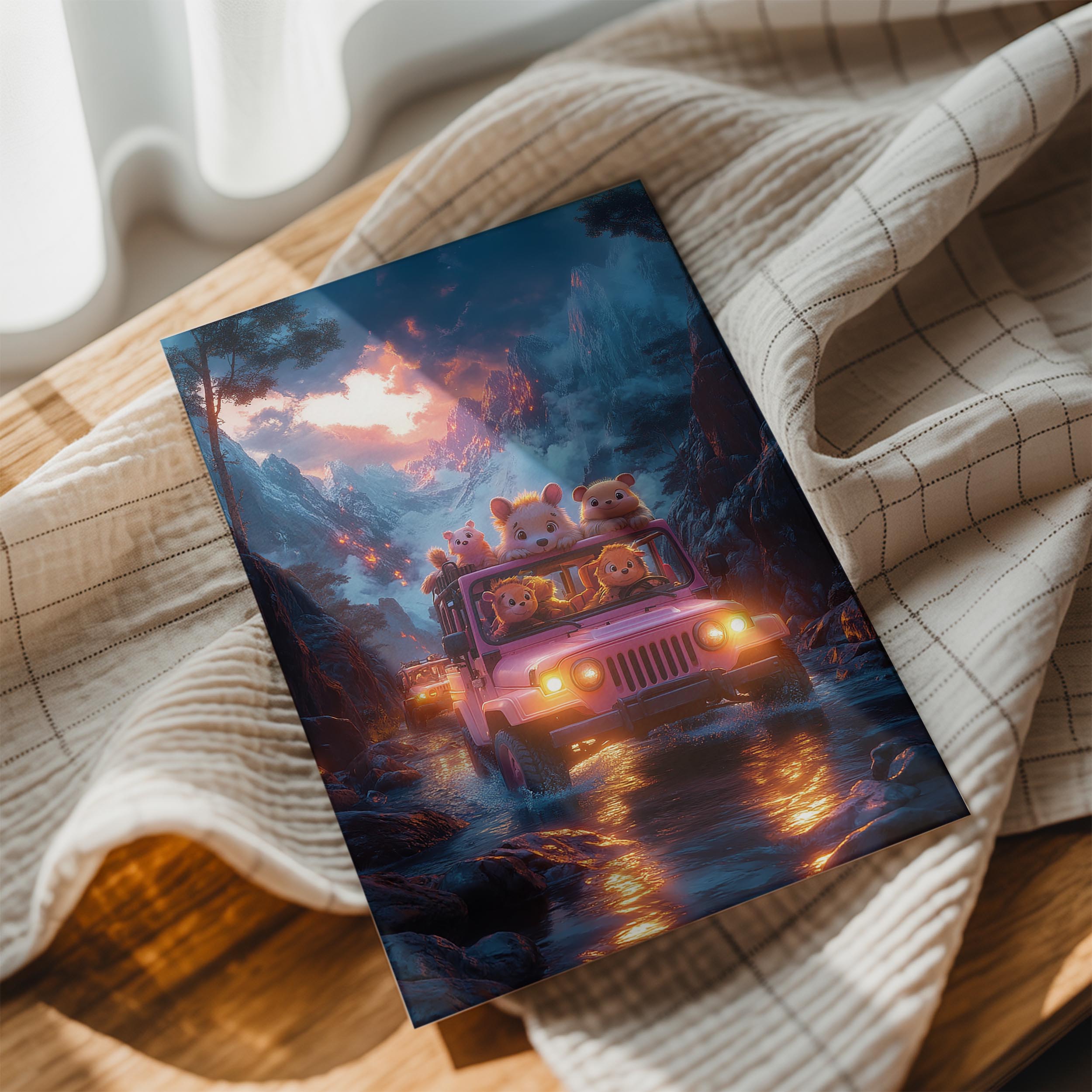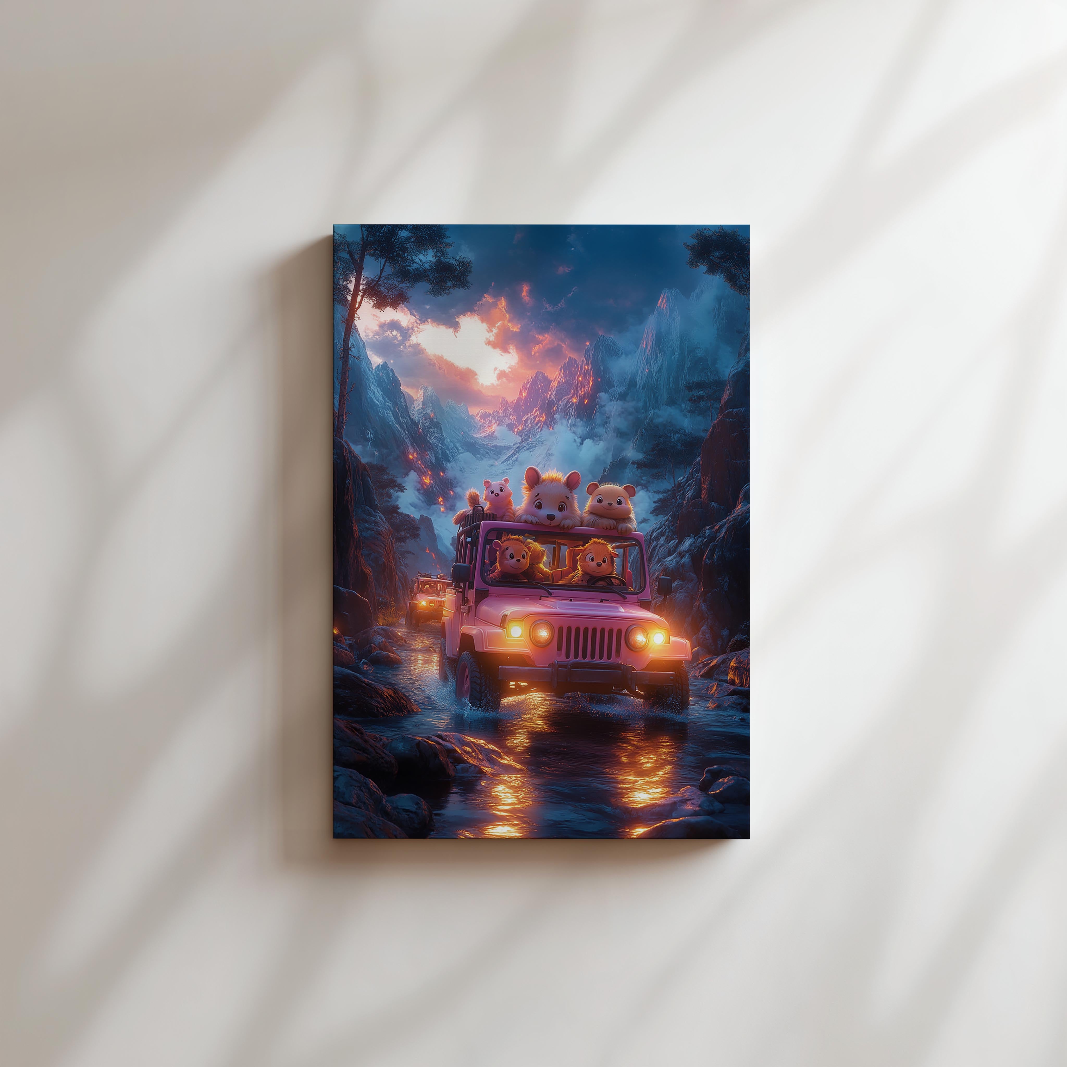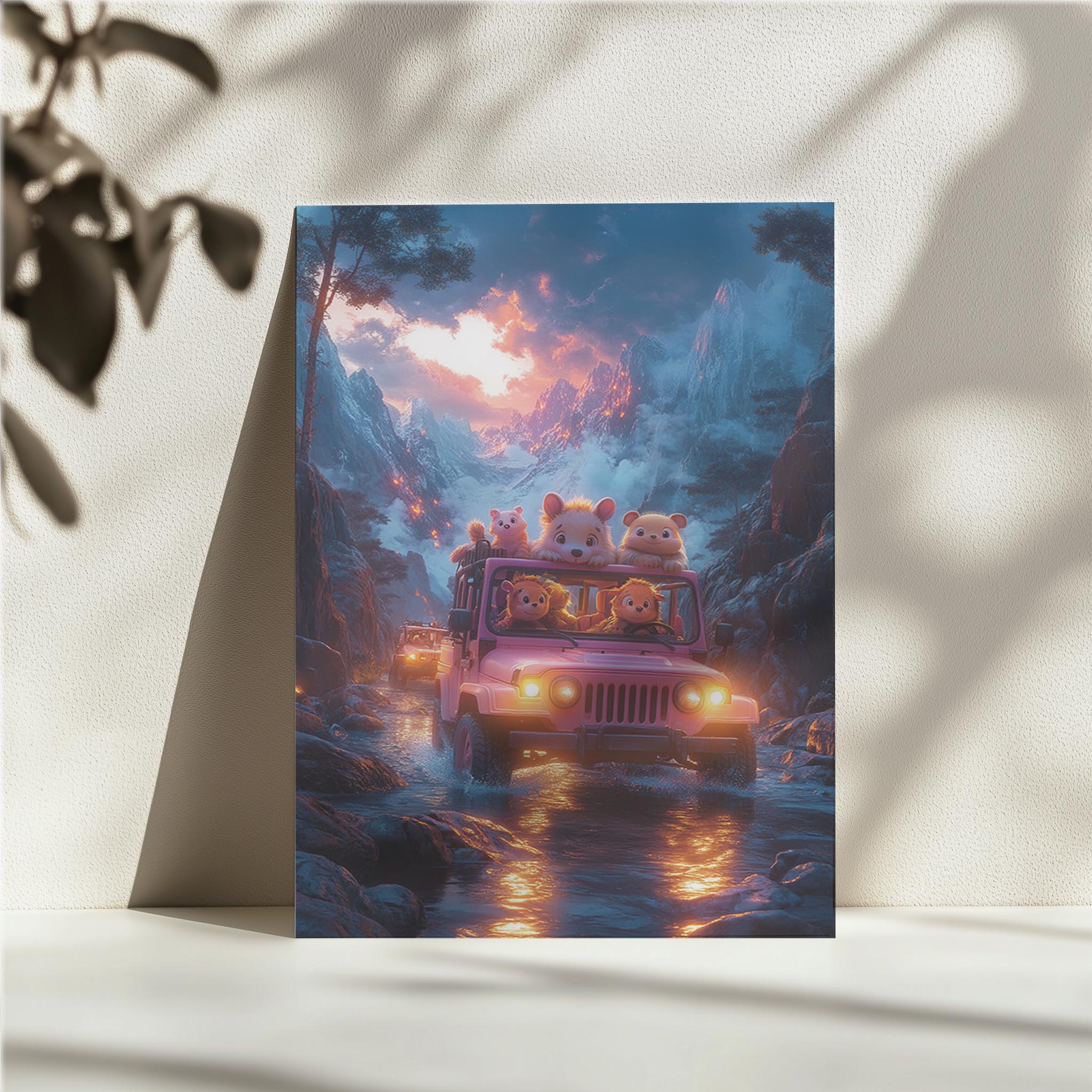 A group of adorable animals embarks on an adventurous road trip, driving through scenic mountains under a glowing sky. This artwork radiates excitement and joy, making it ideal for family rooms, children’s spaces, or adventure-themed decor. The warm tones and lively composition will appeal to all ages.