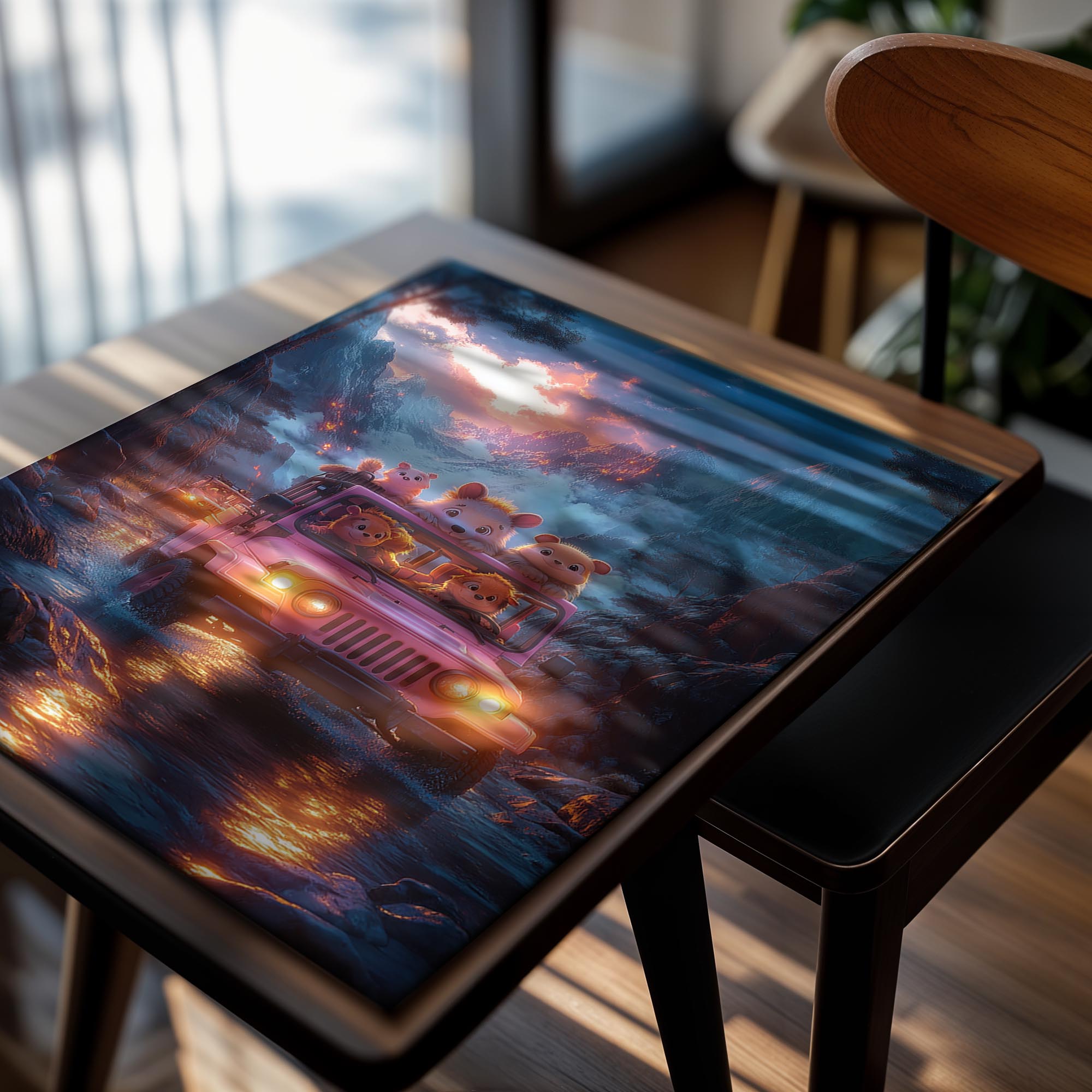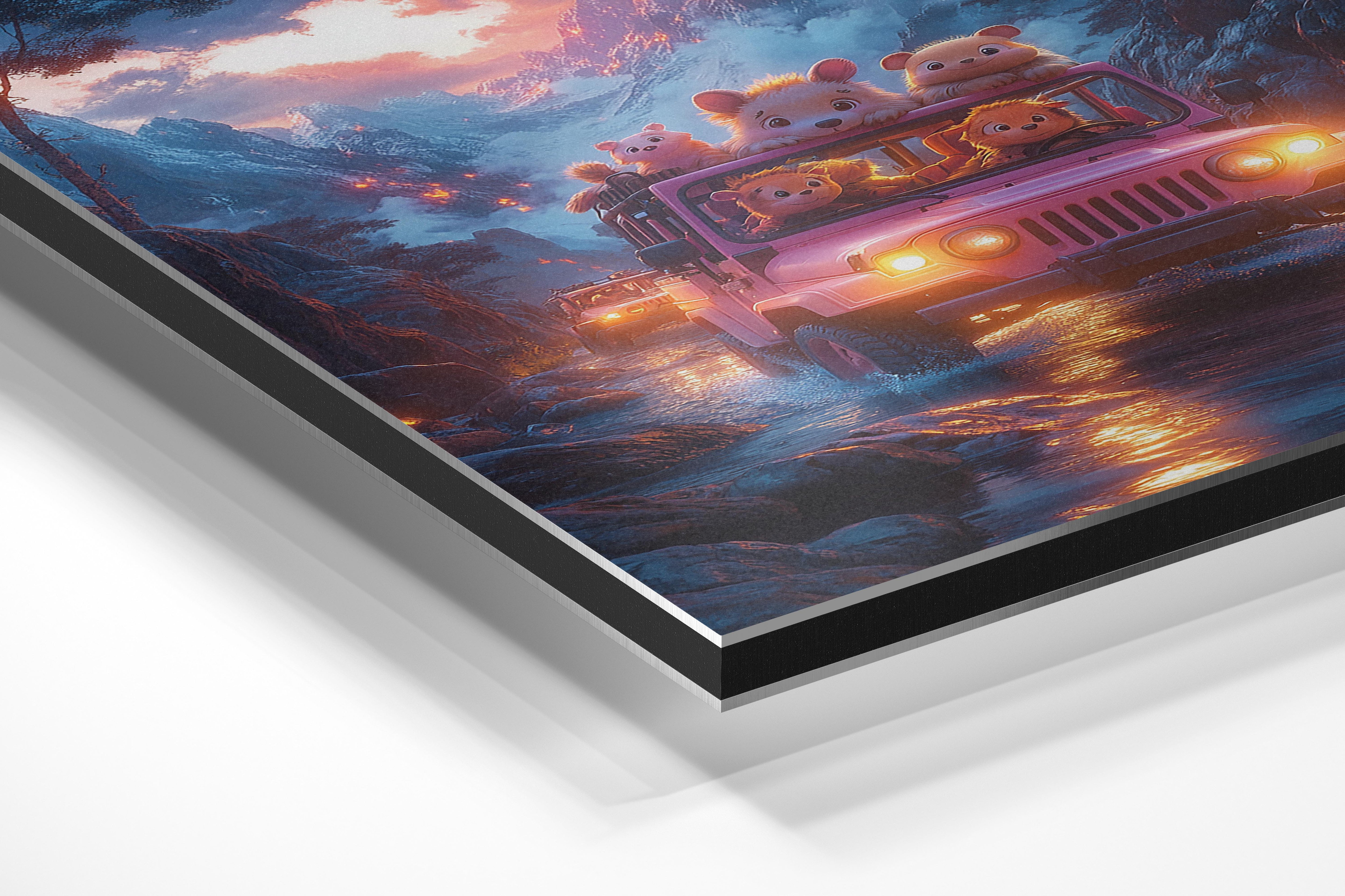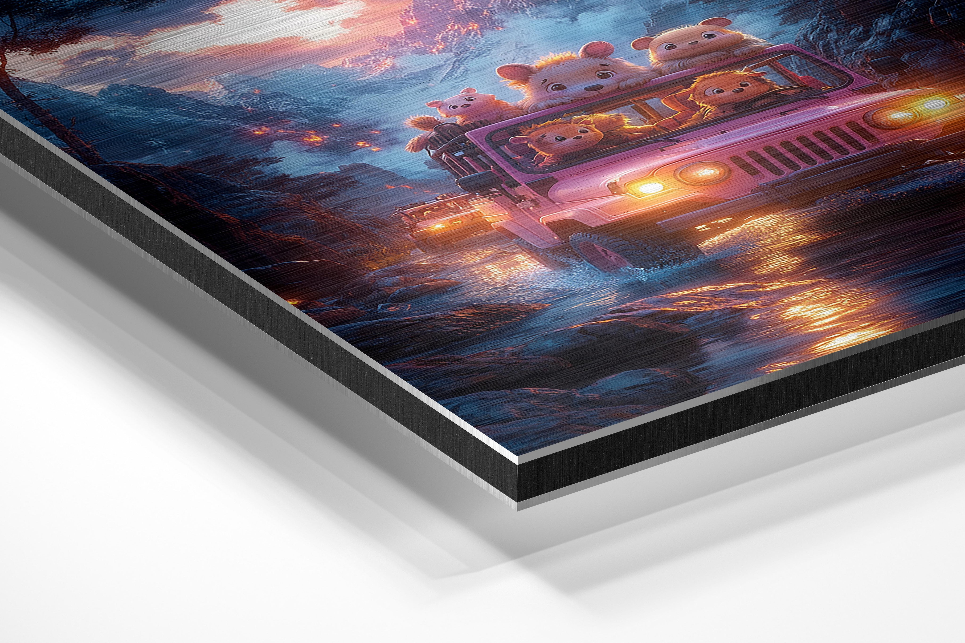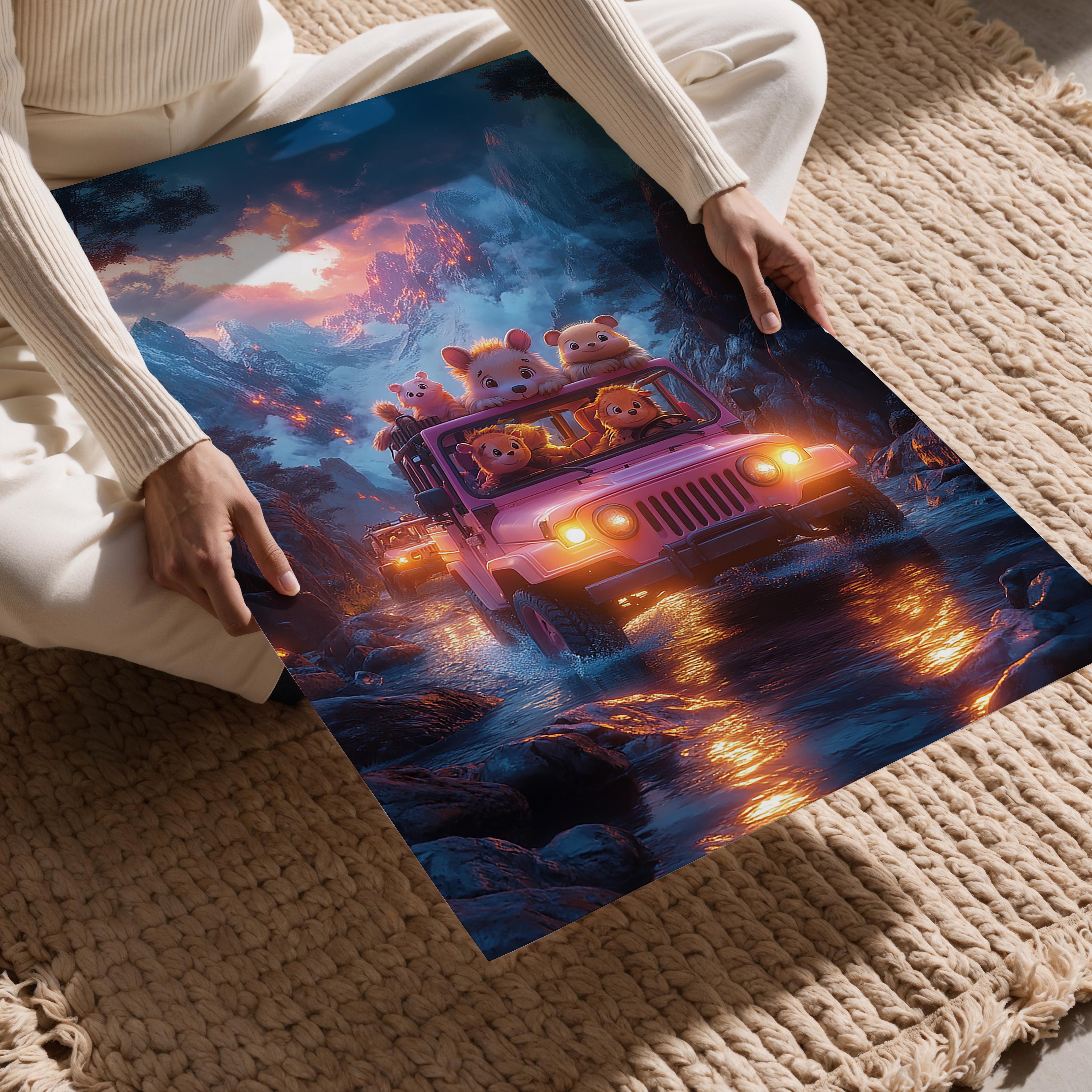 A group of adorable animals embarks on an adventurous road trip, driving through scenic mountains under a glowing sky. This artwork radiates excitement and joy, making it ideal for family rooms, children’s spaces, or adventure-themed decor. The warm tones and lively composition will appeal to all ages.