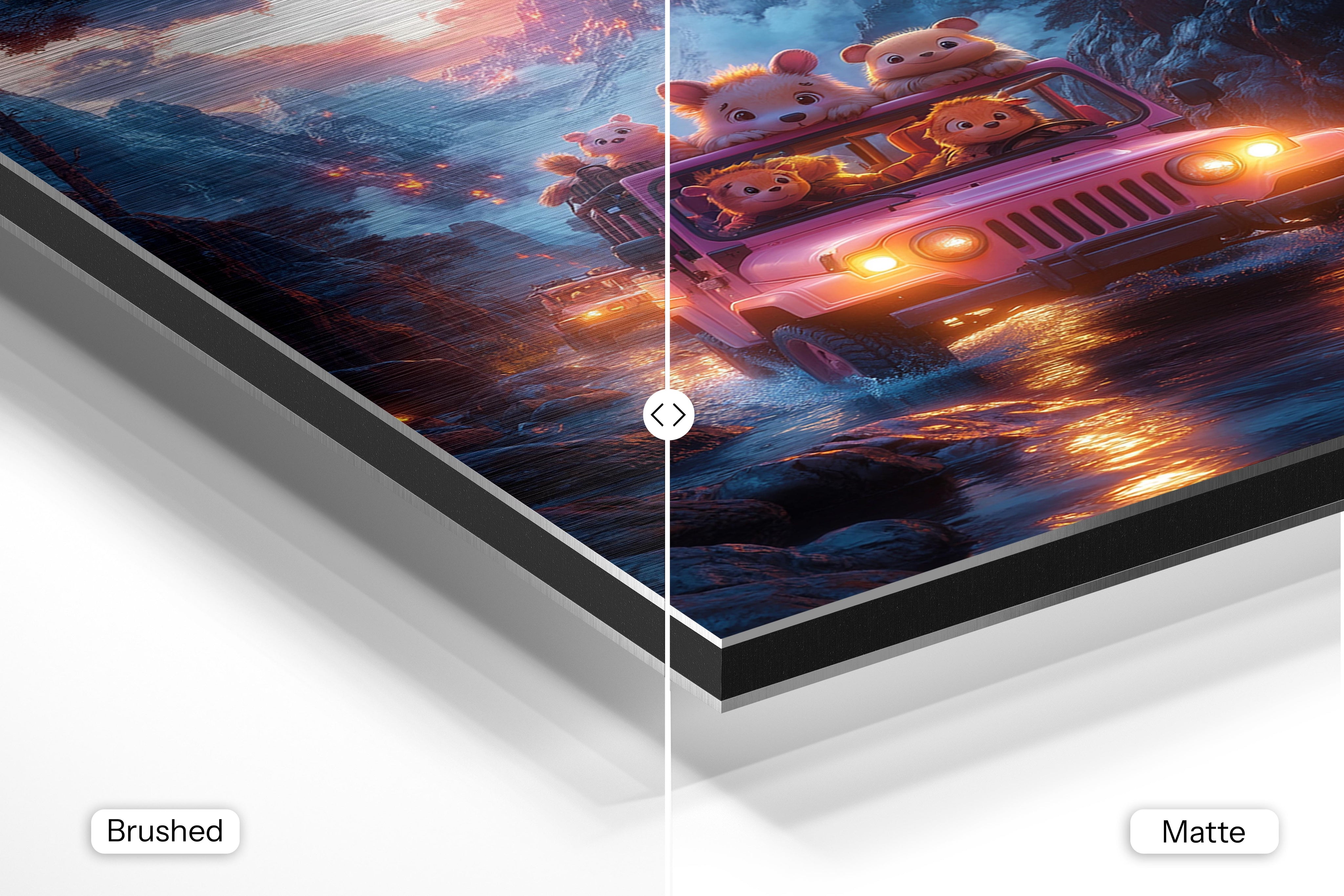 - Brushed Aluminum, on the other hand, features a raw metallic texture with visible brush strokes. Whites and highlights in your image let the silver surface show through, adding a dramatic, shimmering effect. Ideal for black-and-white images, minimalist designs, or abstract art, it creates a bold, industrial vibe with a modern edge.