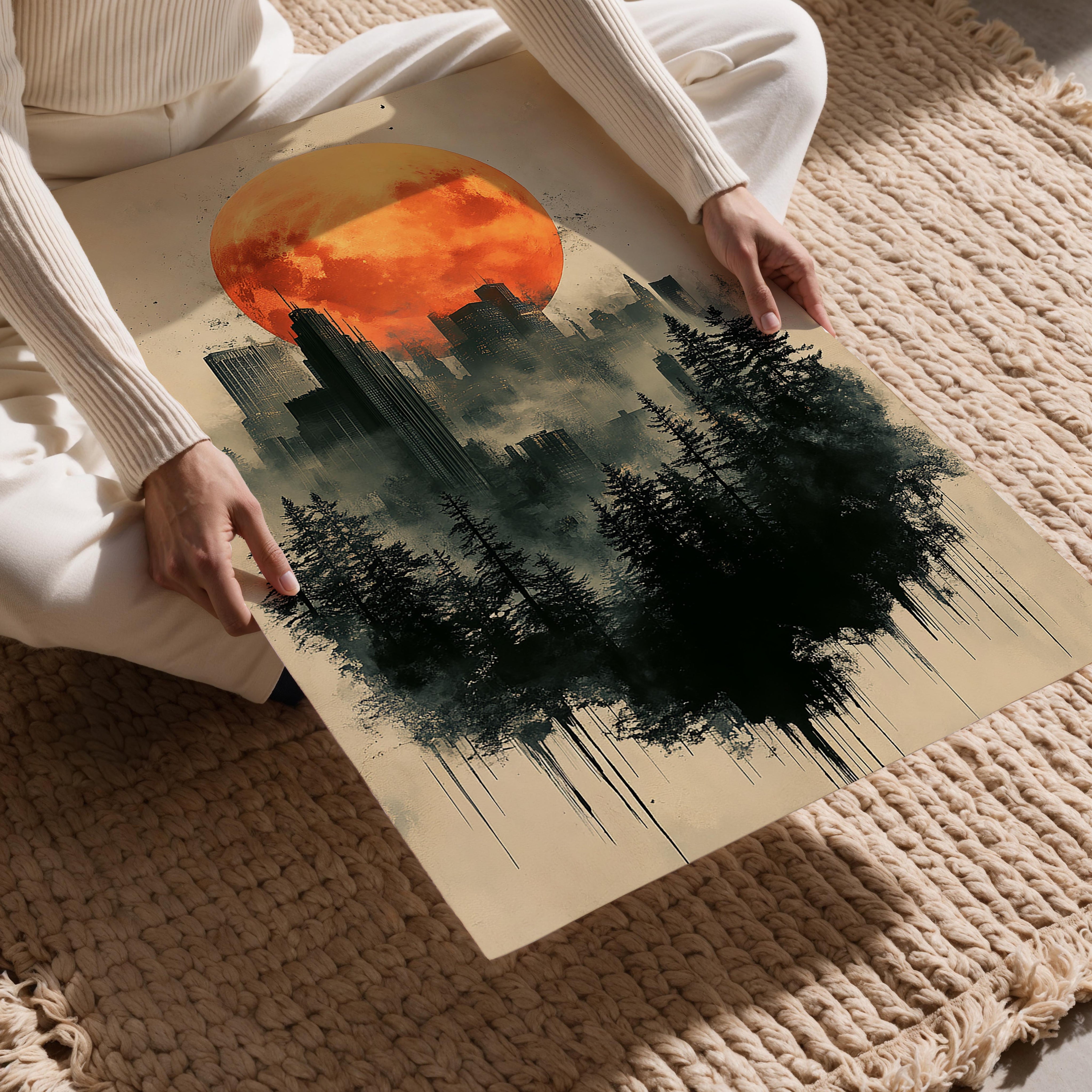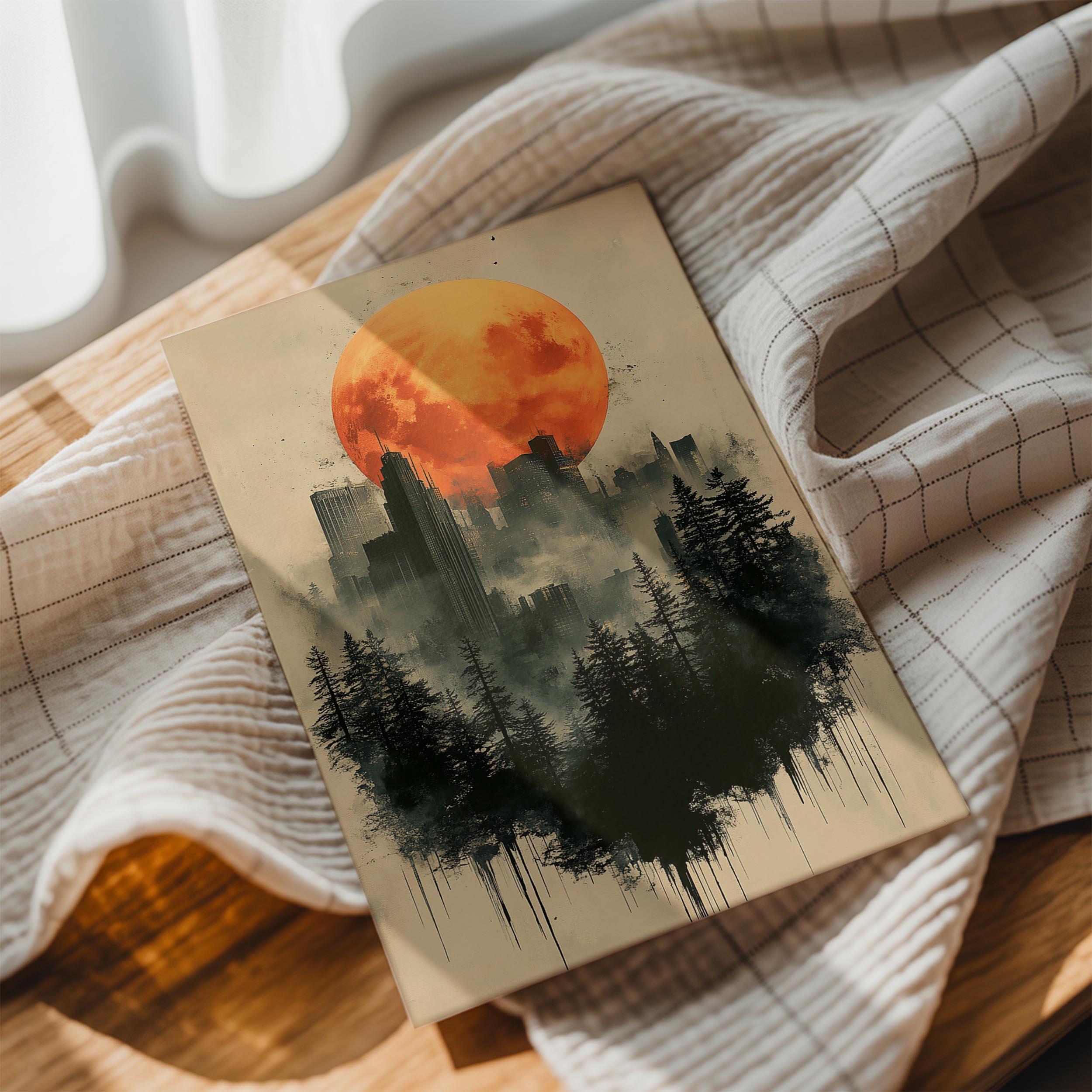 A hauntingly beautiful composition of a post-apocalyptic city skyline beneath an oversized blood-red moon. The piece combines detailed city architecture with organic forest elements, portraying a world where nature reclaims what was once urban sprawl. The hazy mist and dripping silhouettes add a dreamlike quality, making the image feel surreal yet eerily plausible. The stark contrast between the fiery sky and the dark, decayed buildings evokes a sense of mystery, resilience, and the inevitable cha...