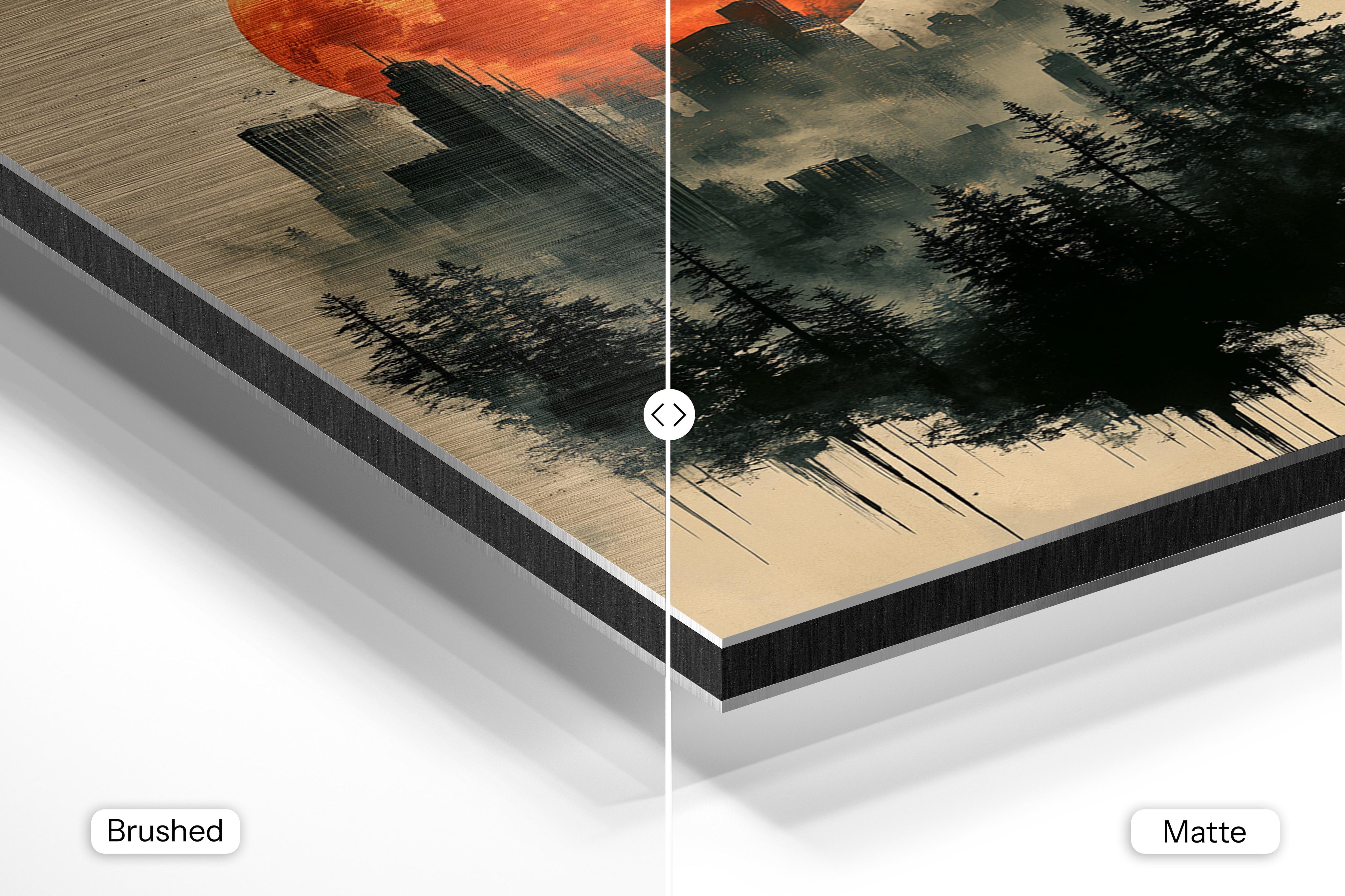 - Brushed Aluminum, on the other hand, features a raw metallic texture with visible brush strokes. Whites and highlights in your image let the silver surface show through, adding a dramatic, shimmering effect. Ideal for black-and-white images, minimalist designs, or abstract art, it creates a bold, industrial vibe with a modern edge.