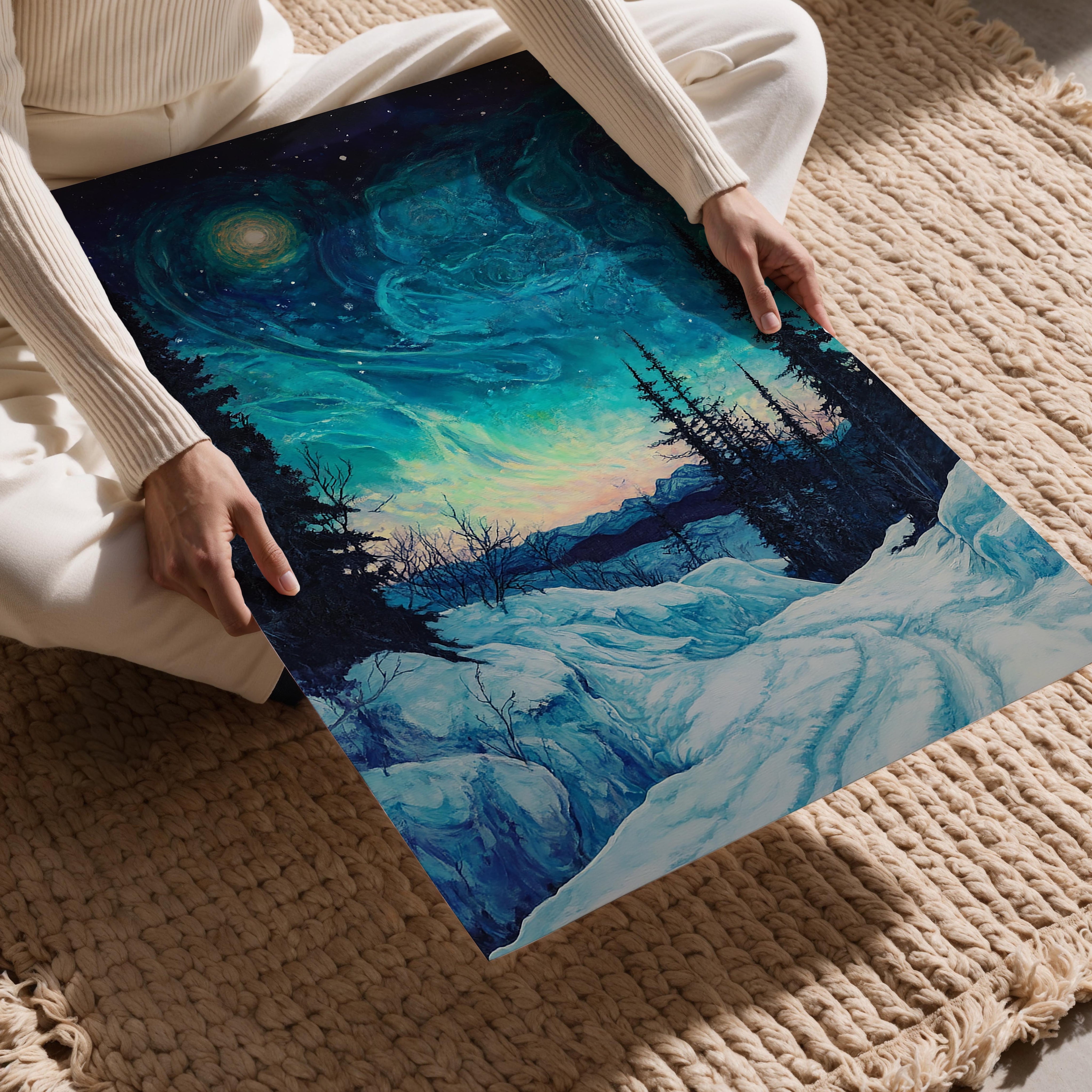 A magnificent Arctic sky filled with colorful auroras paints an ethereal portrait of winter's splendor. The soft light reflects off the pristine snow, creating a serene and otherworldly atmosphere.