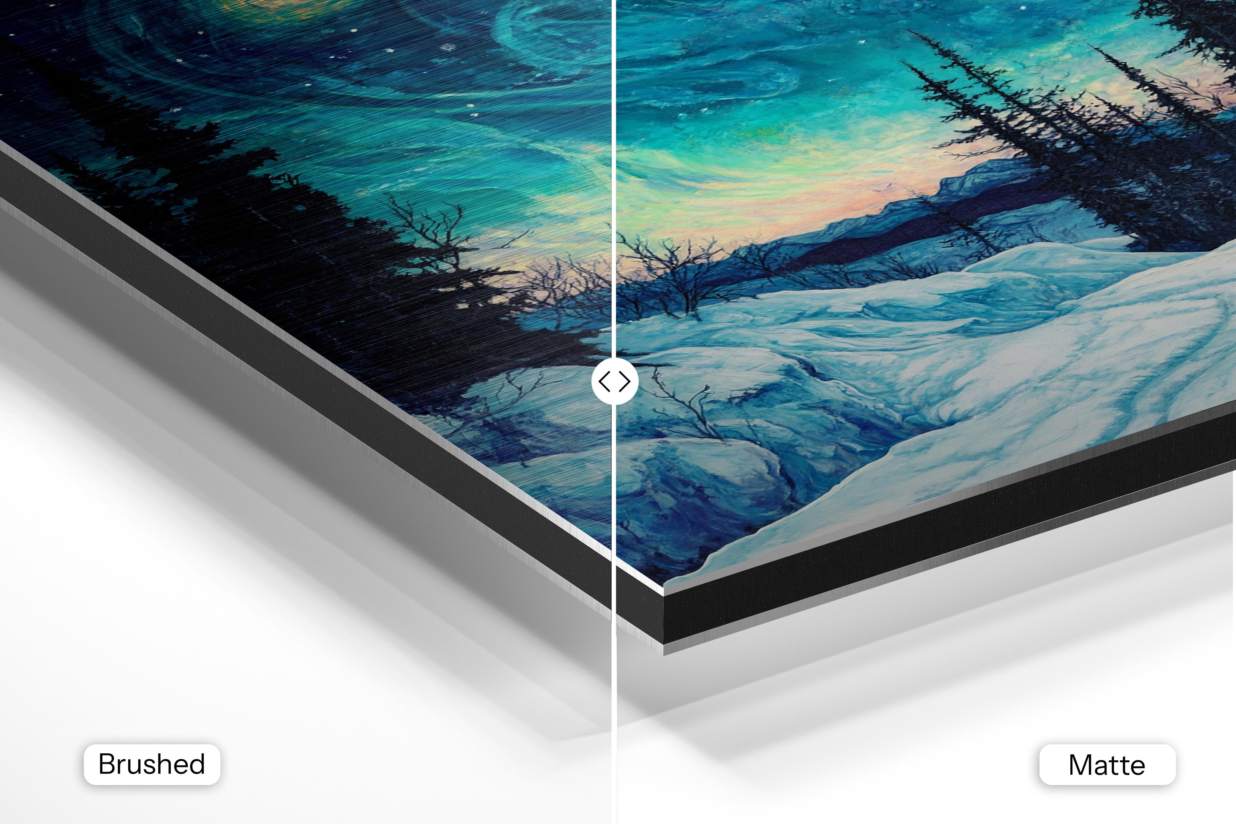 - Brushed Aluminum, on the other hand, features a raw metallic texture with visible brush strokes. Whites and highlights in your image let the silver surface show through, adding a dramatic, shimmering effect. Ideal for black-and-white images, minimalist designs, or abstract art, it creates a bold, industrial vibe with a modern edge.