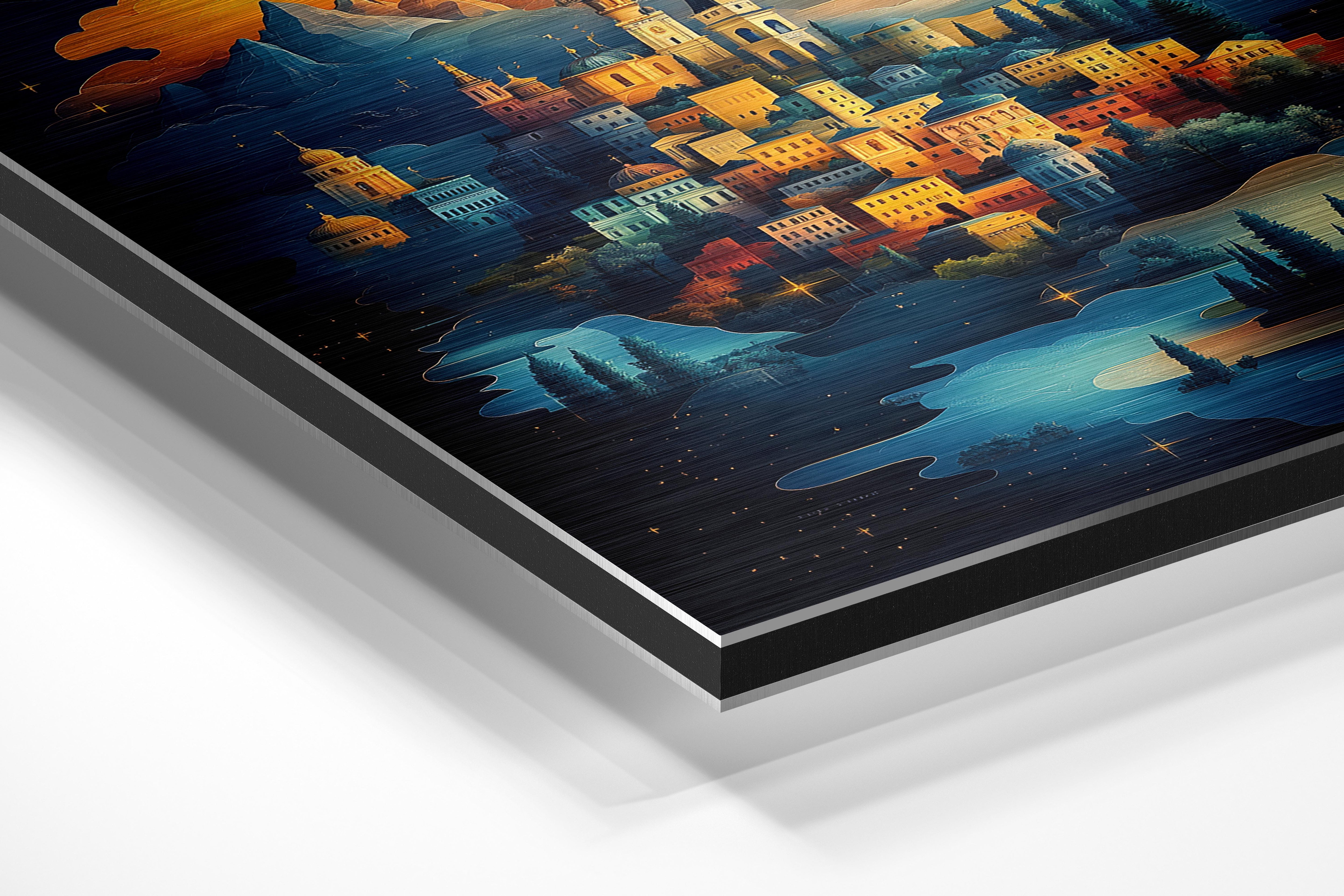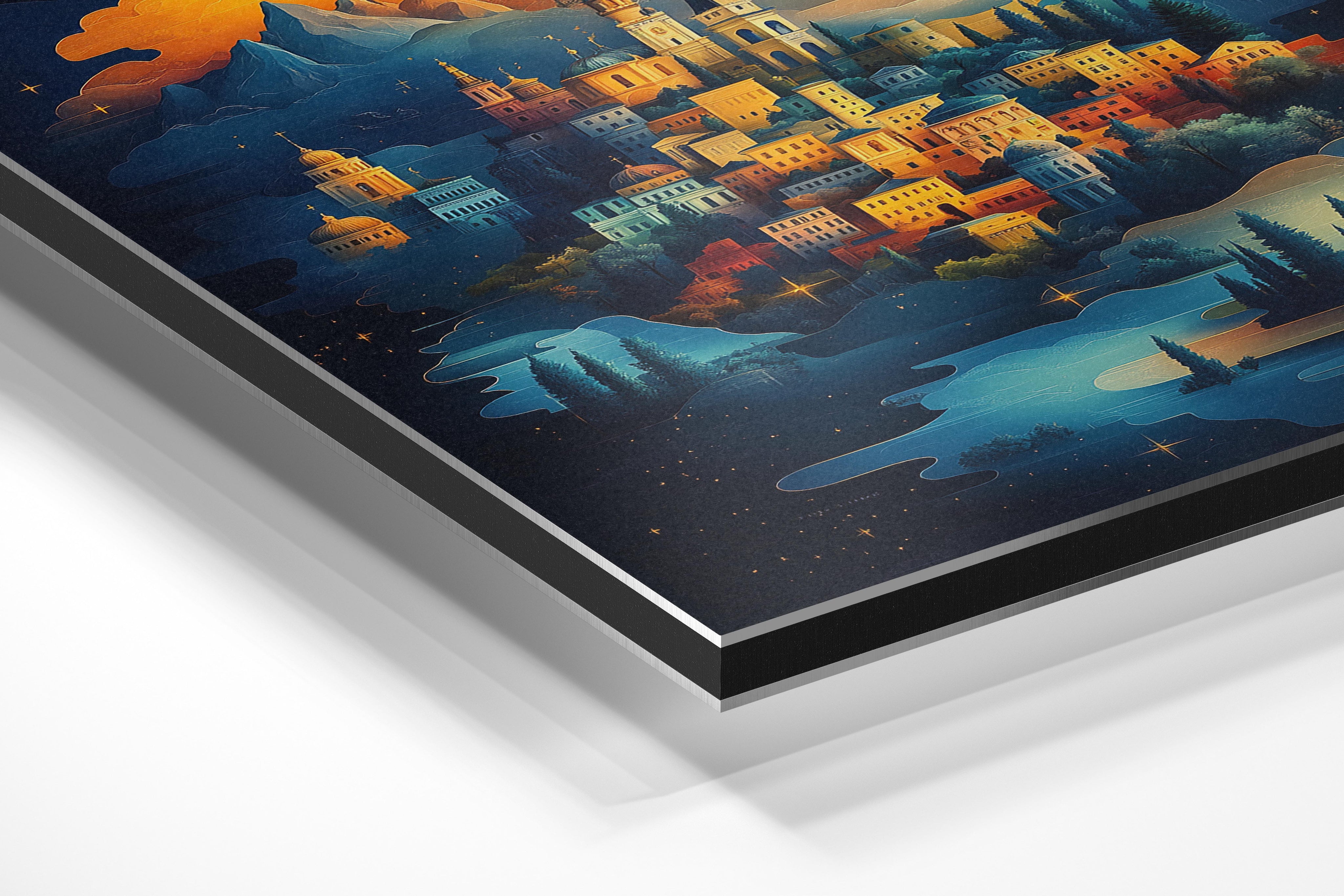 An enchanting hilltop village set under a starry night sky with glowing warm tones and artistic details. The whimsical charm of this image makes it a beautiful choice for living rooms, bedrooms, or spaces that value cozy, nostalgic themes.