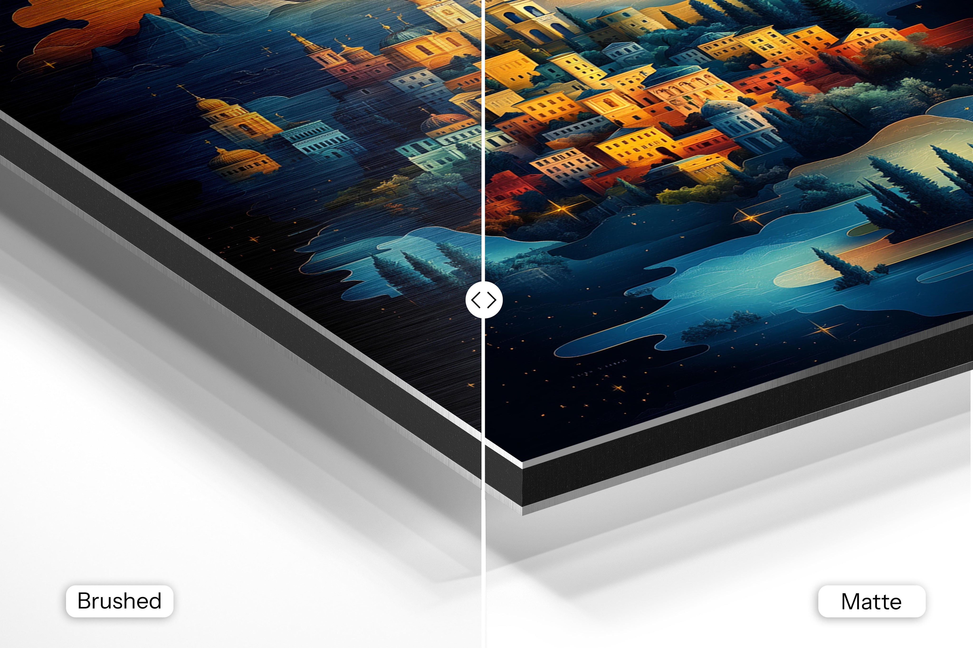- Brushed Aluminum, on the other hand, features a raw metallic texture with visible brush strokes. Whites and highlights in your image let the silver surface show through, adding a dramatic, shimmering effect. Ideal for black-and-white images, minimalist designs, or abstract art, it creates a bold, industrial vibe with a modern edge.